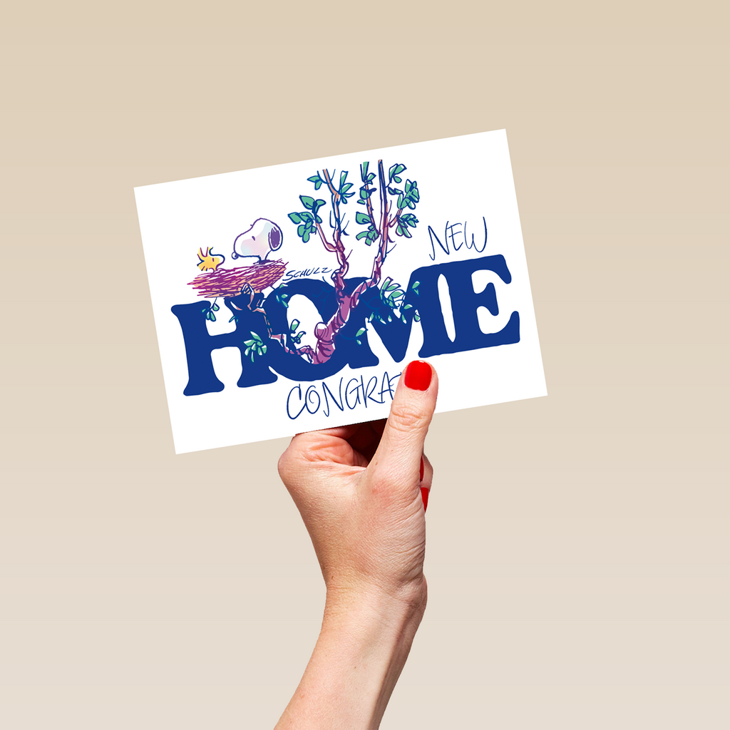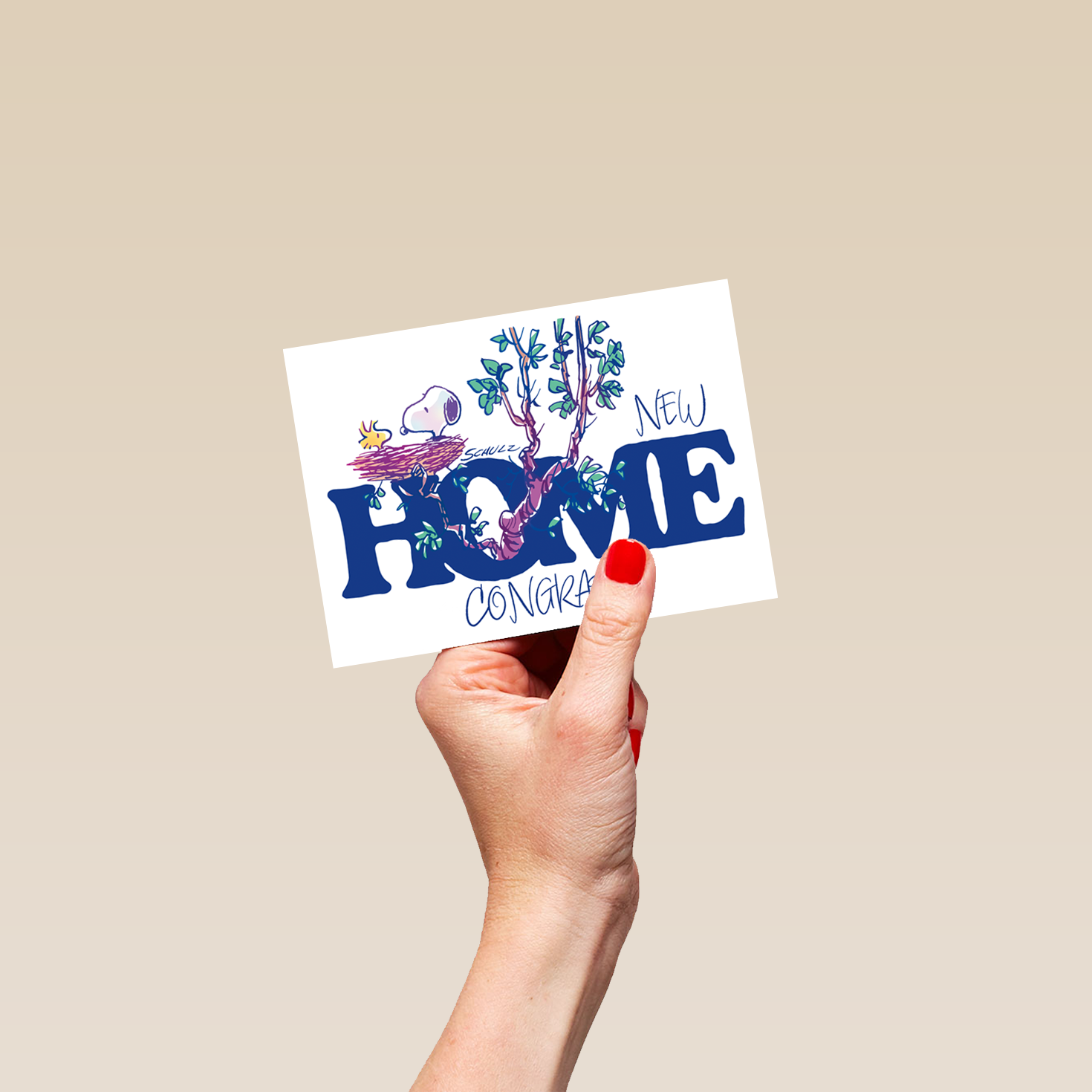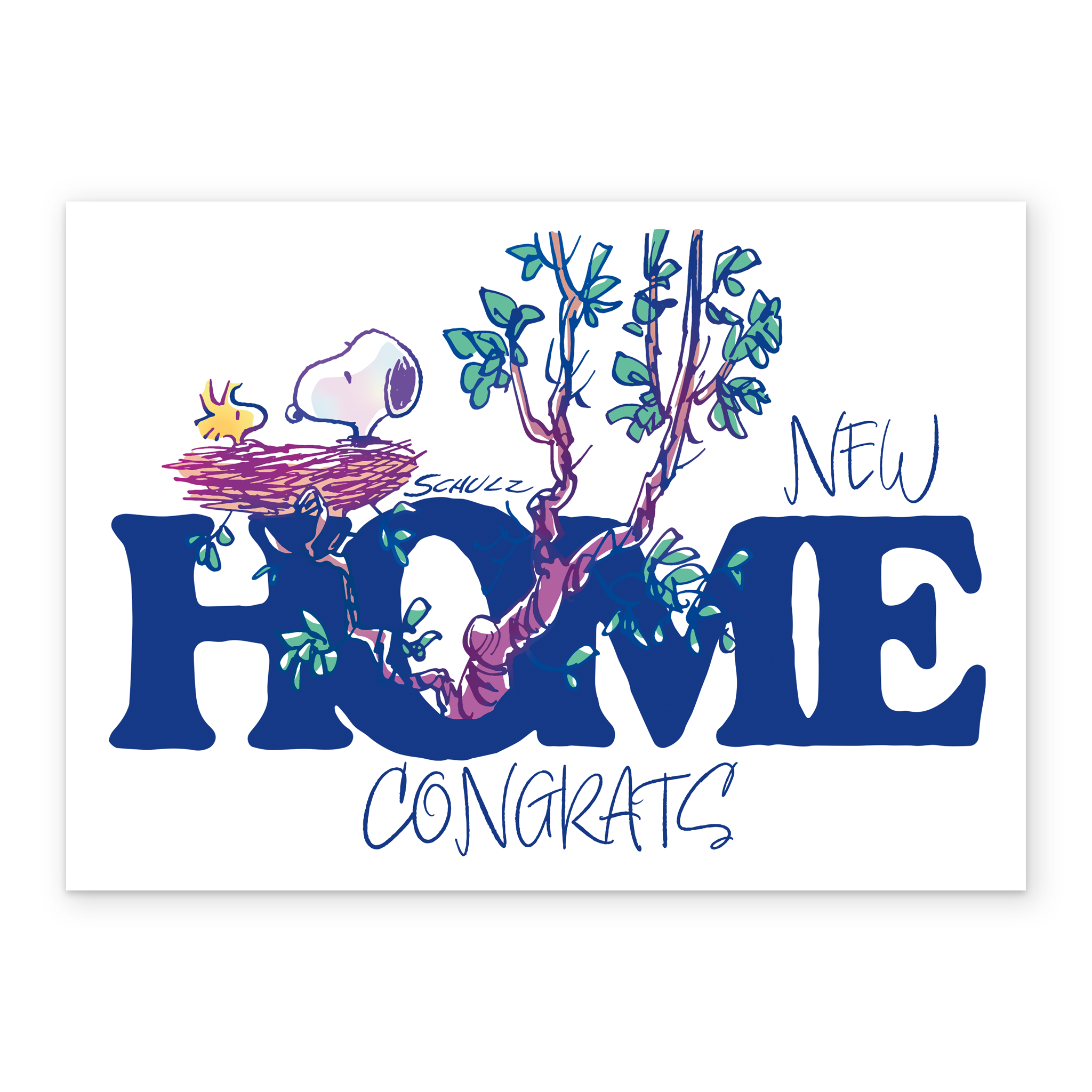 Printed on premium-quality board, this card features PEANUTS™ SNOOPY and WOODSTOCK sat together in a bird's nest, with the message 'New Home Congrats', and comes complete with a co-ordinating white envelope.