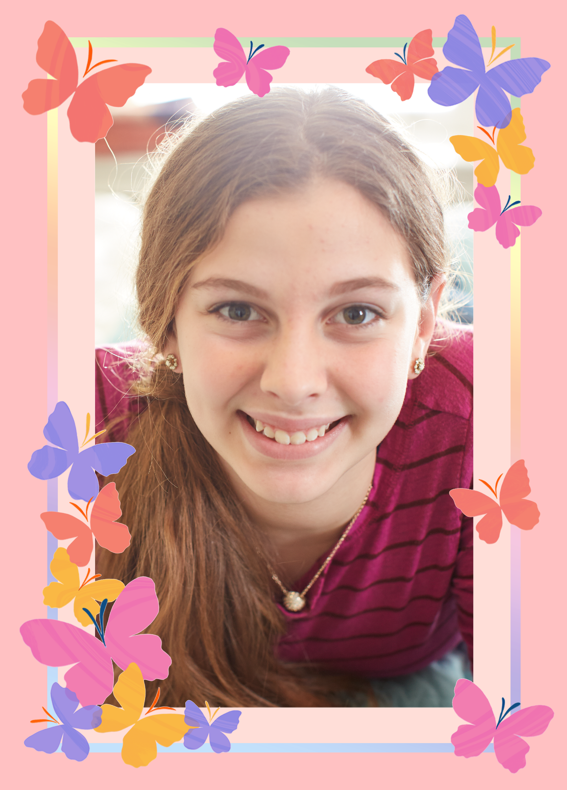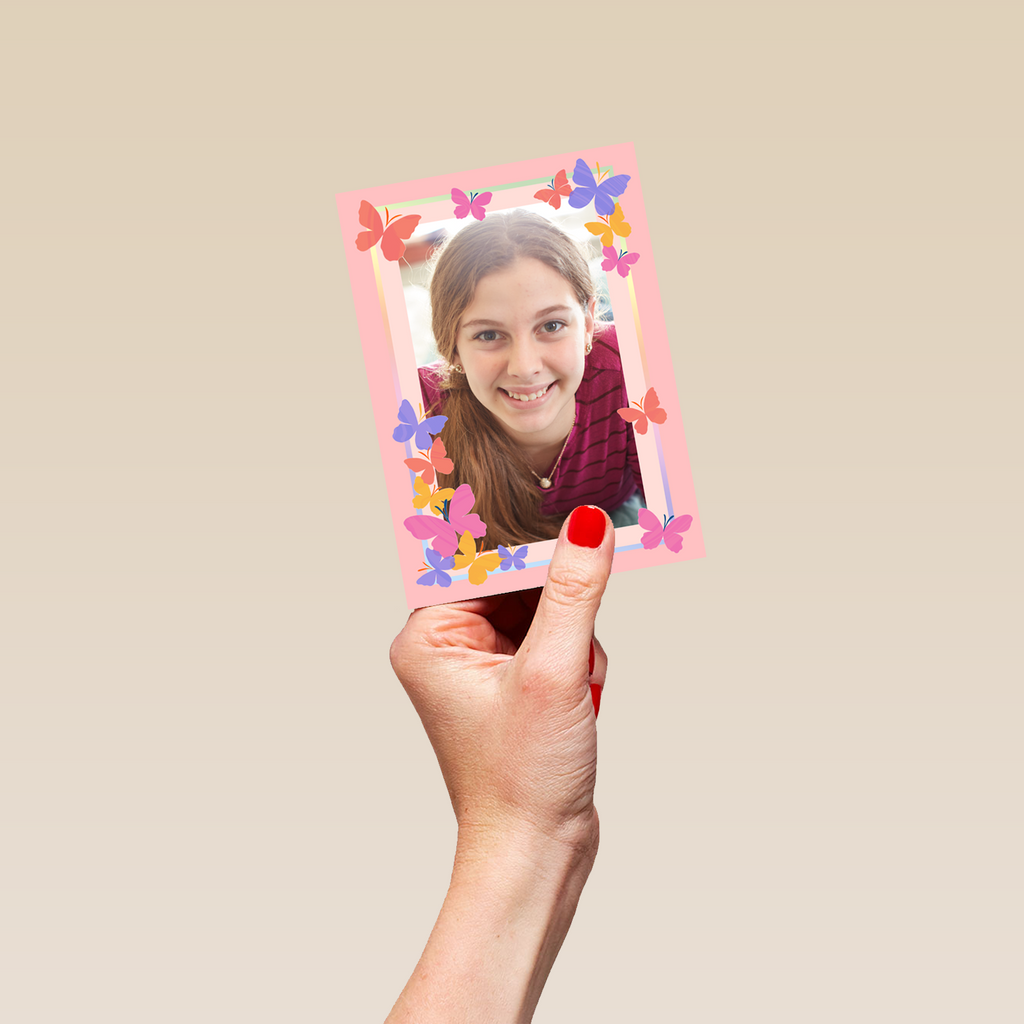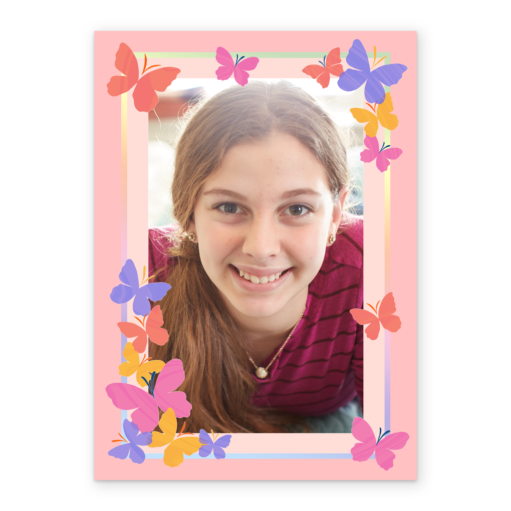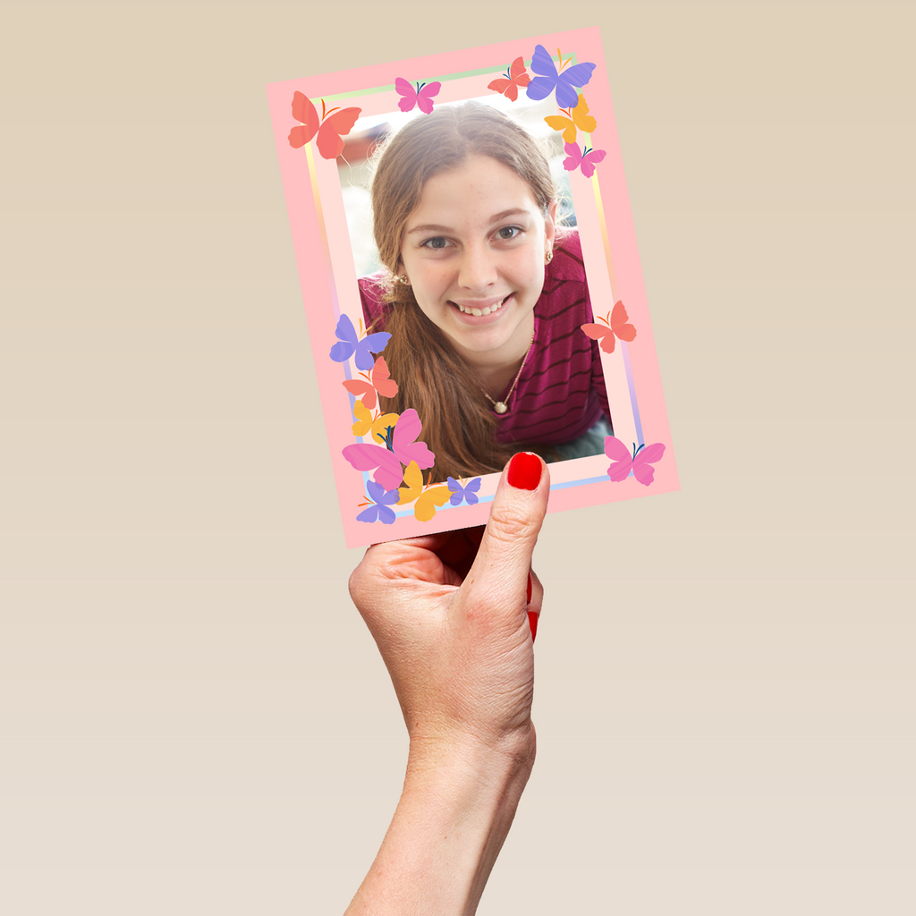 Printed on premium-quality board, this card features a pink background with colourful butterflies around the border, space to upload a photo, and comes complete with a co-ordinating white envelope.