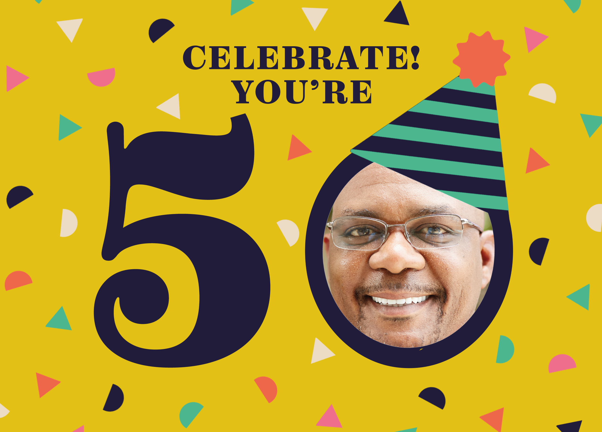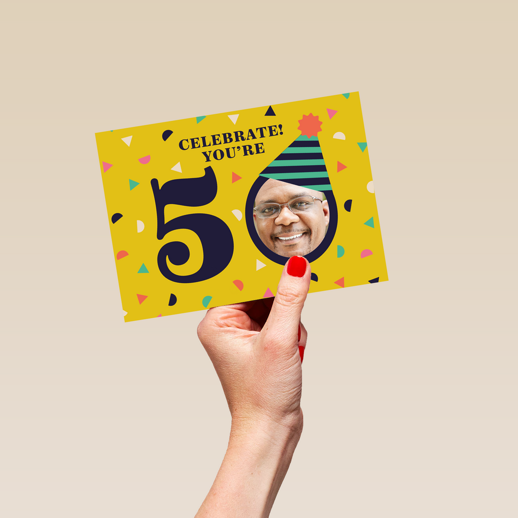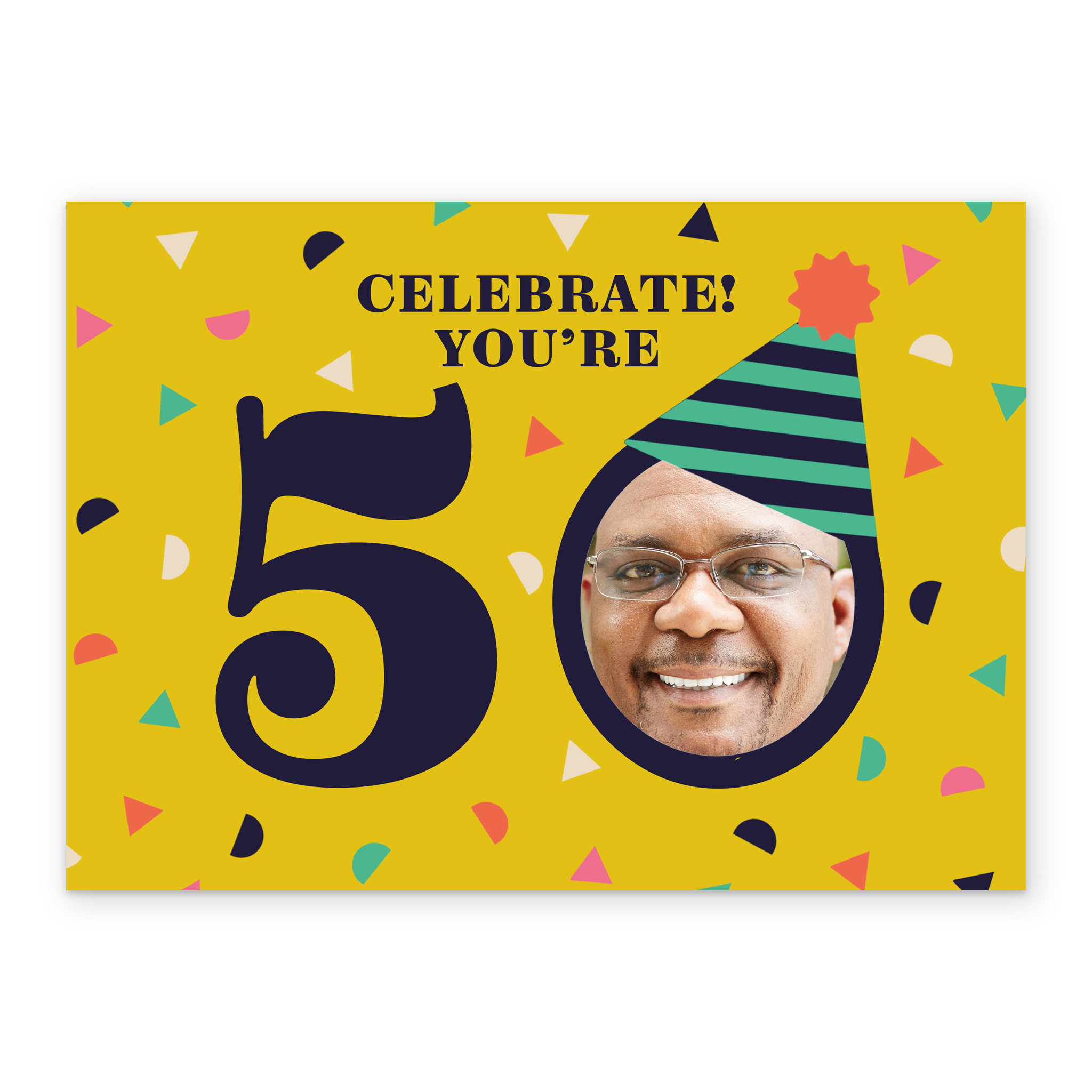 Printed on premium-quality board, this card features a colourful confetti design, with the message 'Celebrate! You're 50', space to upload a photo, and comes complete with a co-ordinating white envelope.