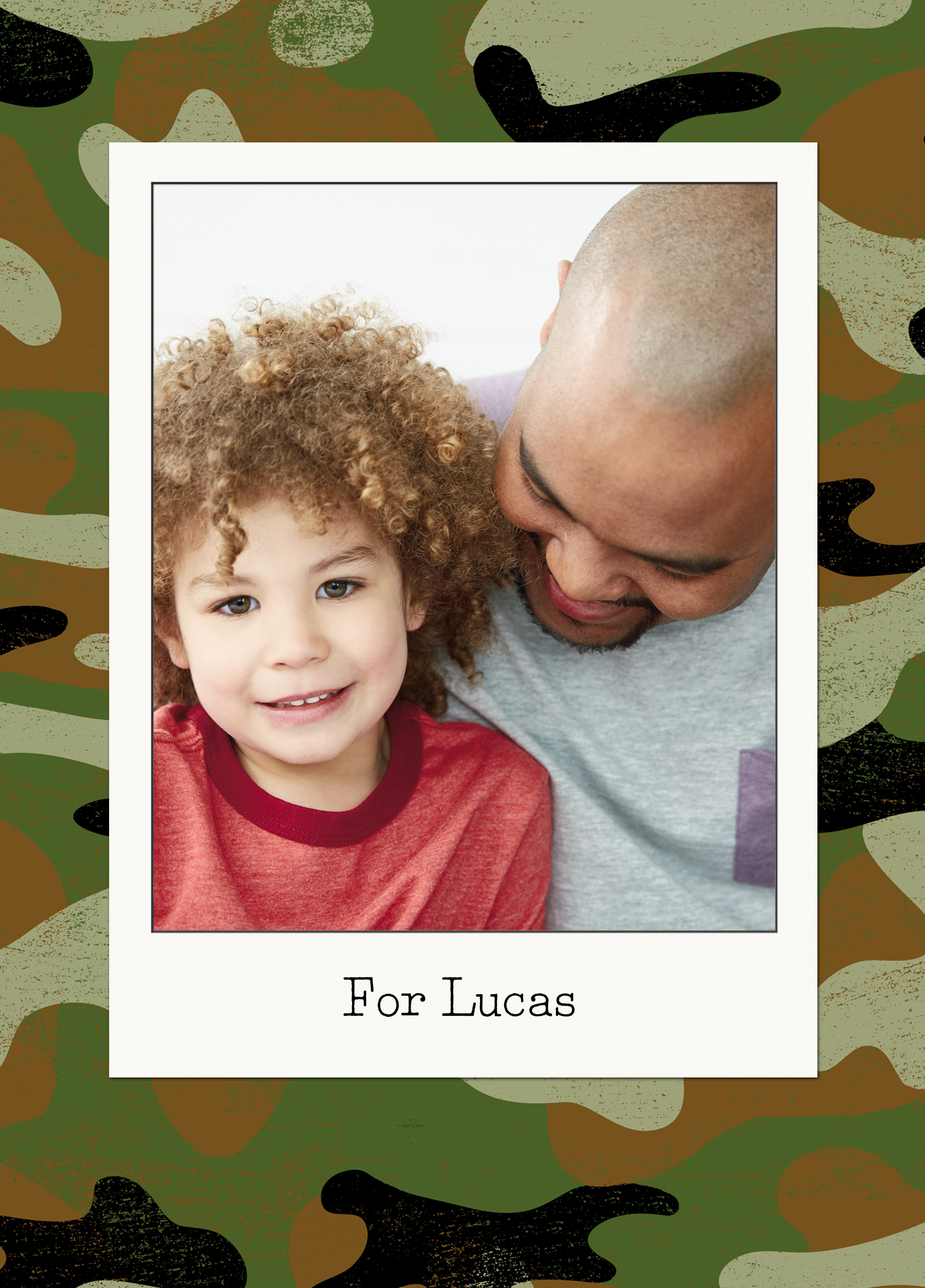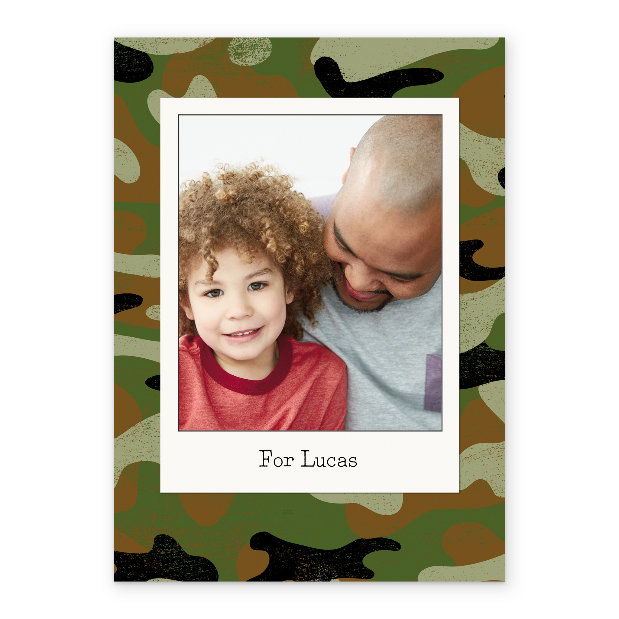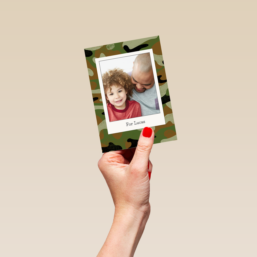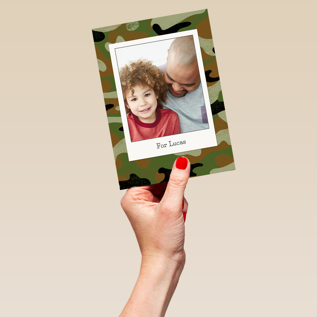 Printed on premium-quality board, this card features a green camouflage background with a polaroid-style photo frame, with the message 'For [NAME]', space to upload a photo and personalise your message, and comes complete with a co-ordinating white envelope.