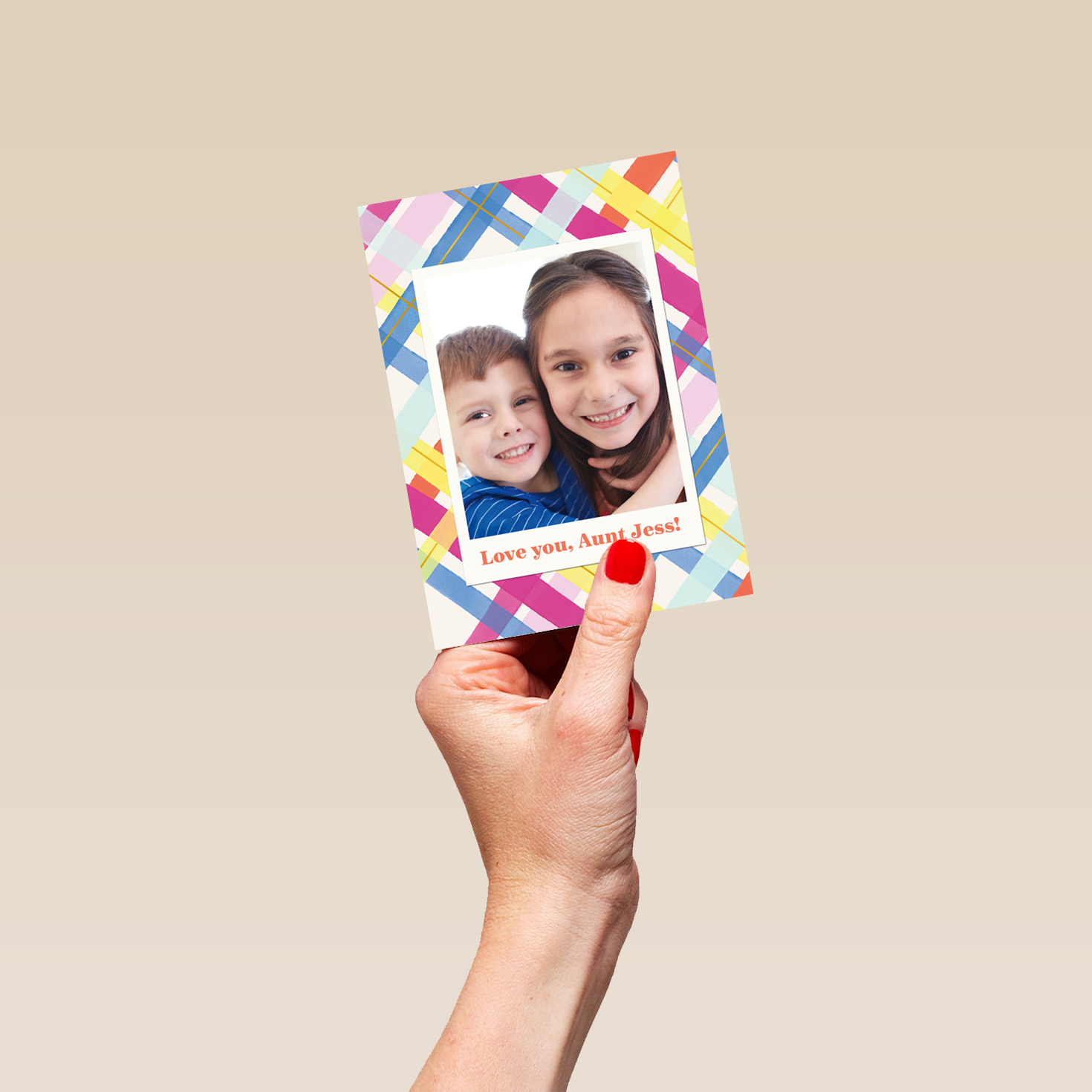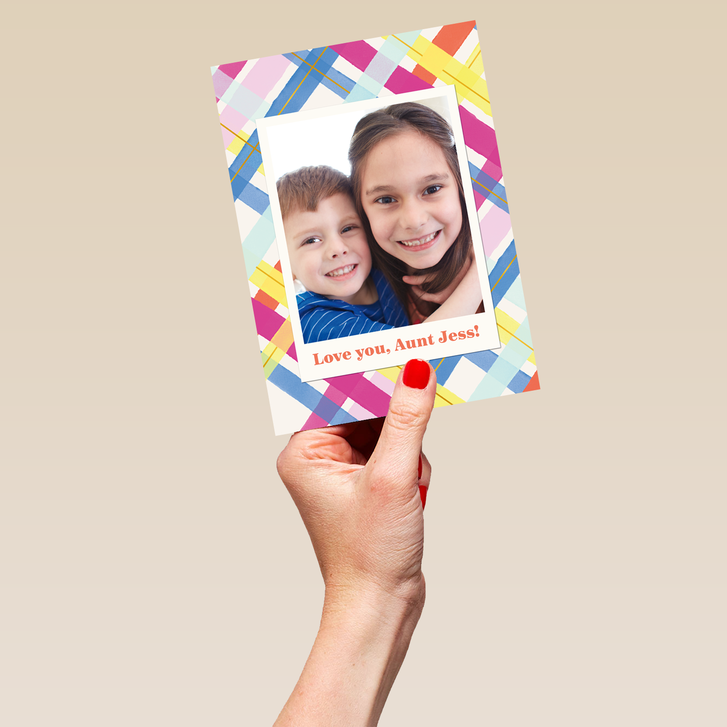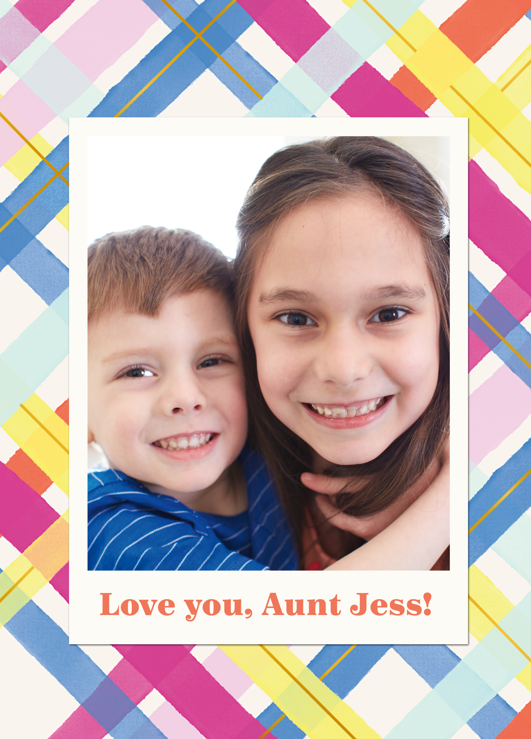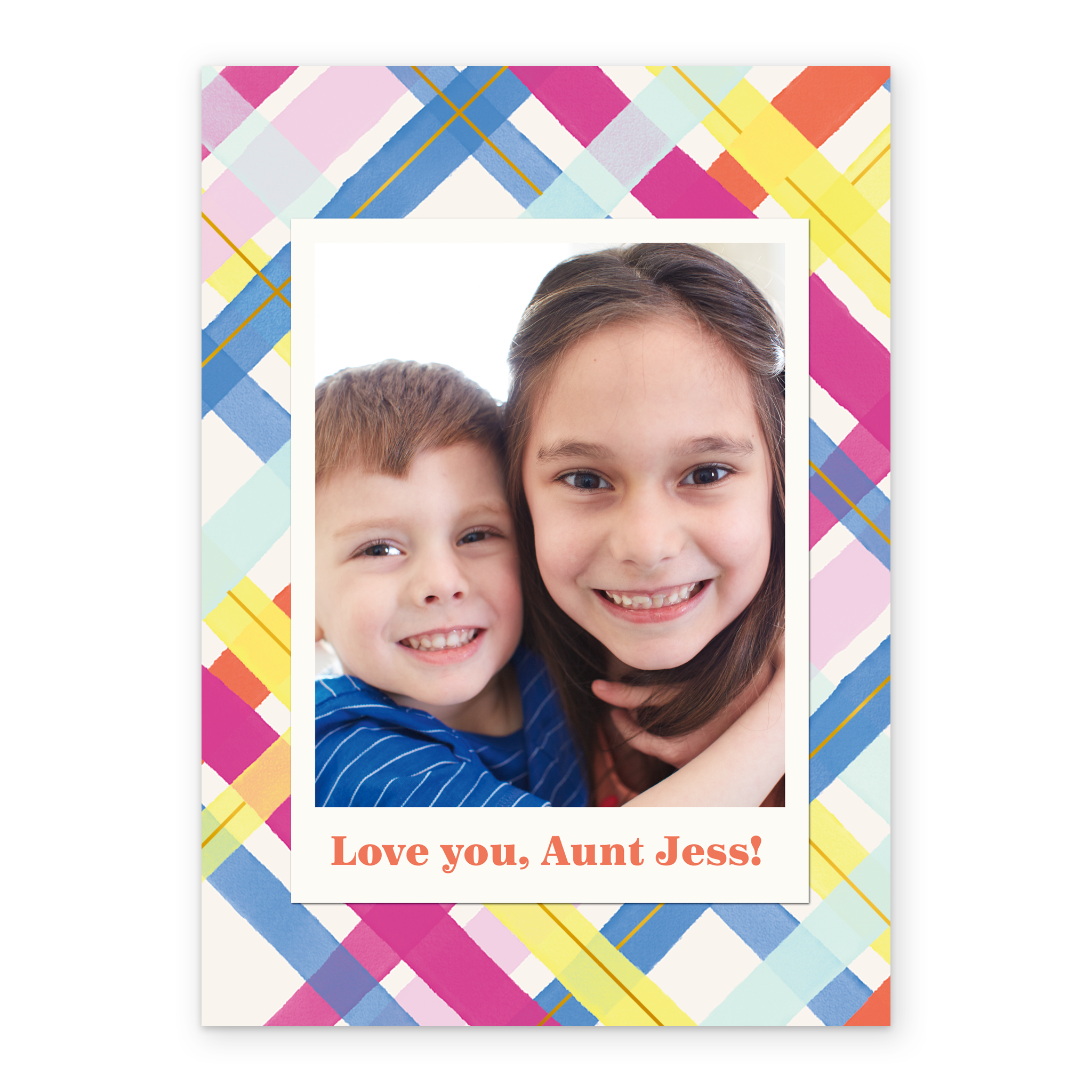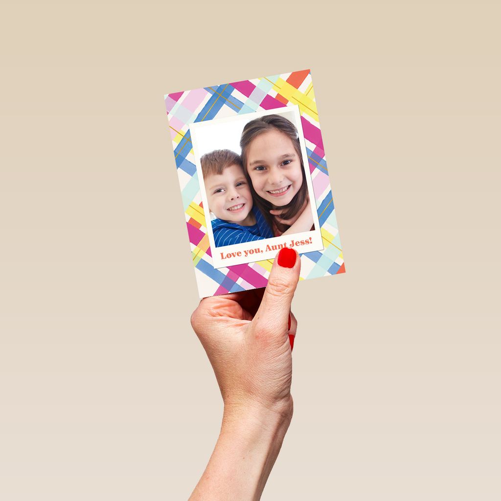 Personalised Photo Upload & Editable Colourful Tartan Greeting Card for Aunt