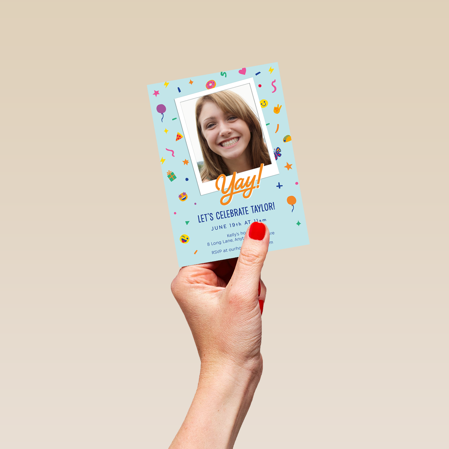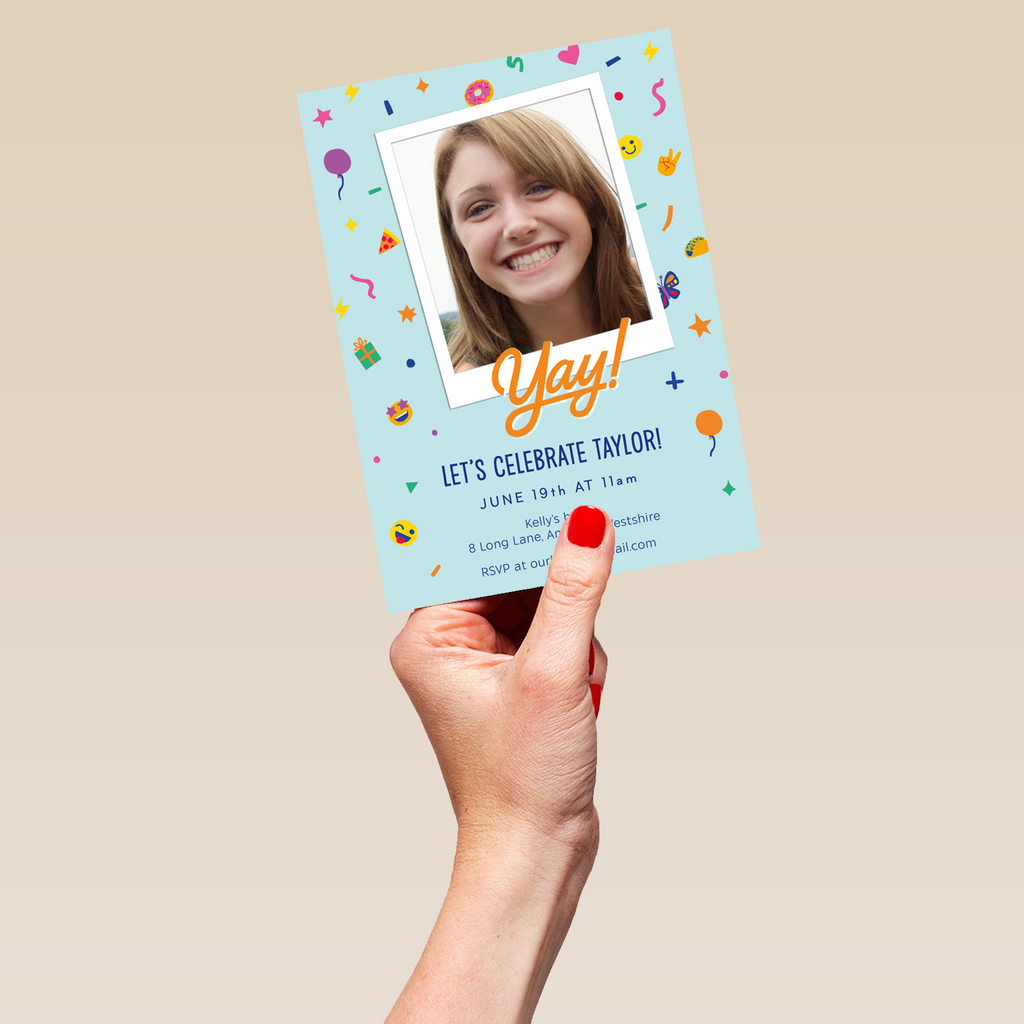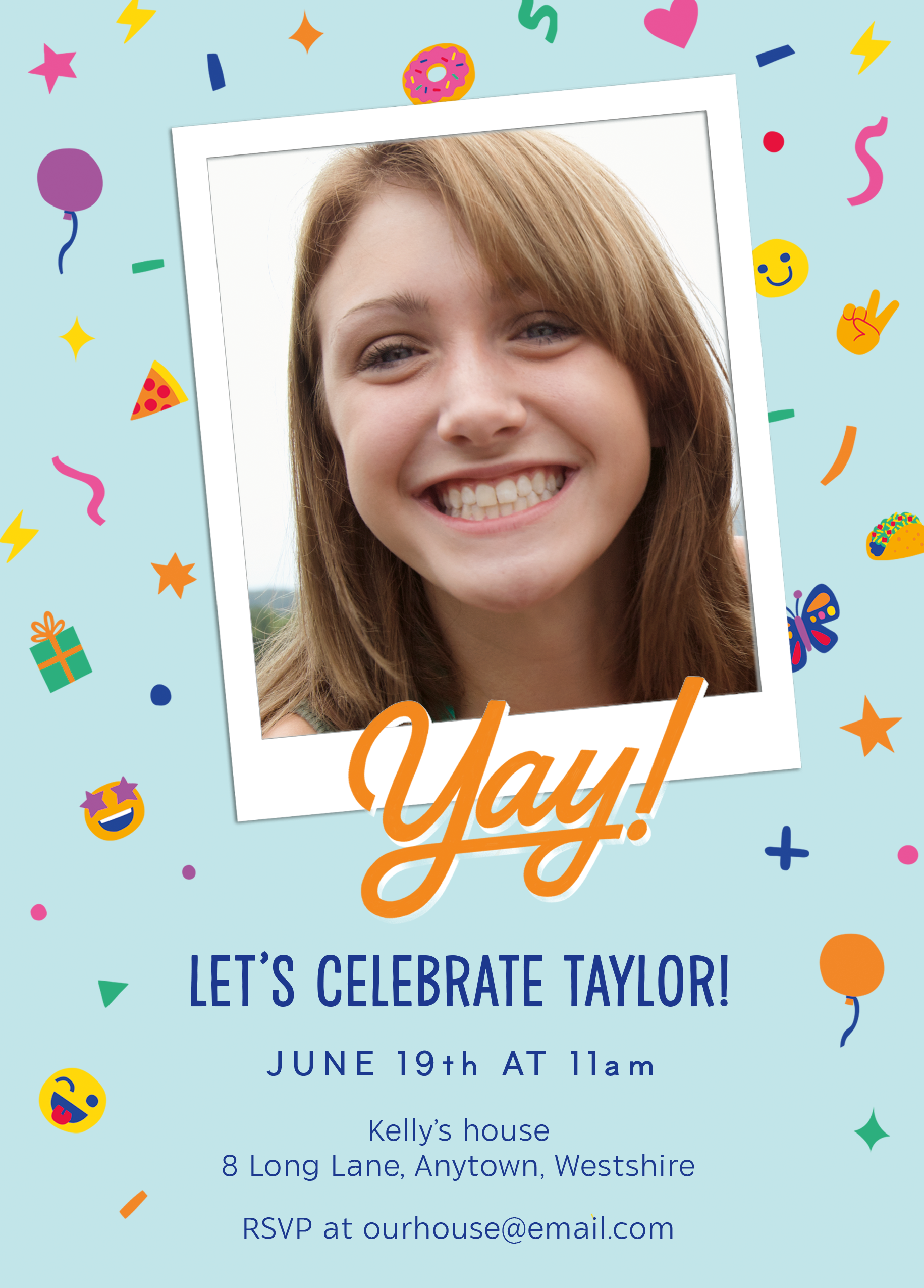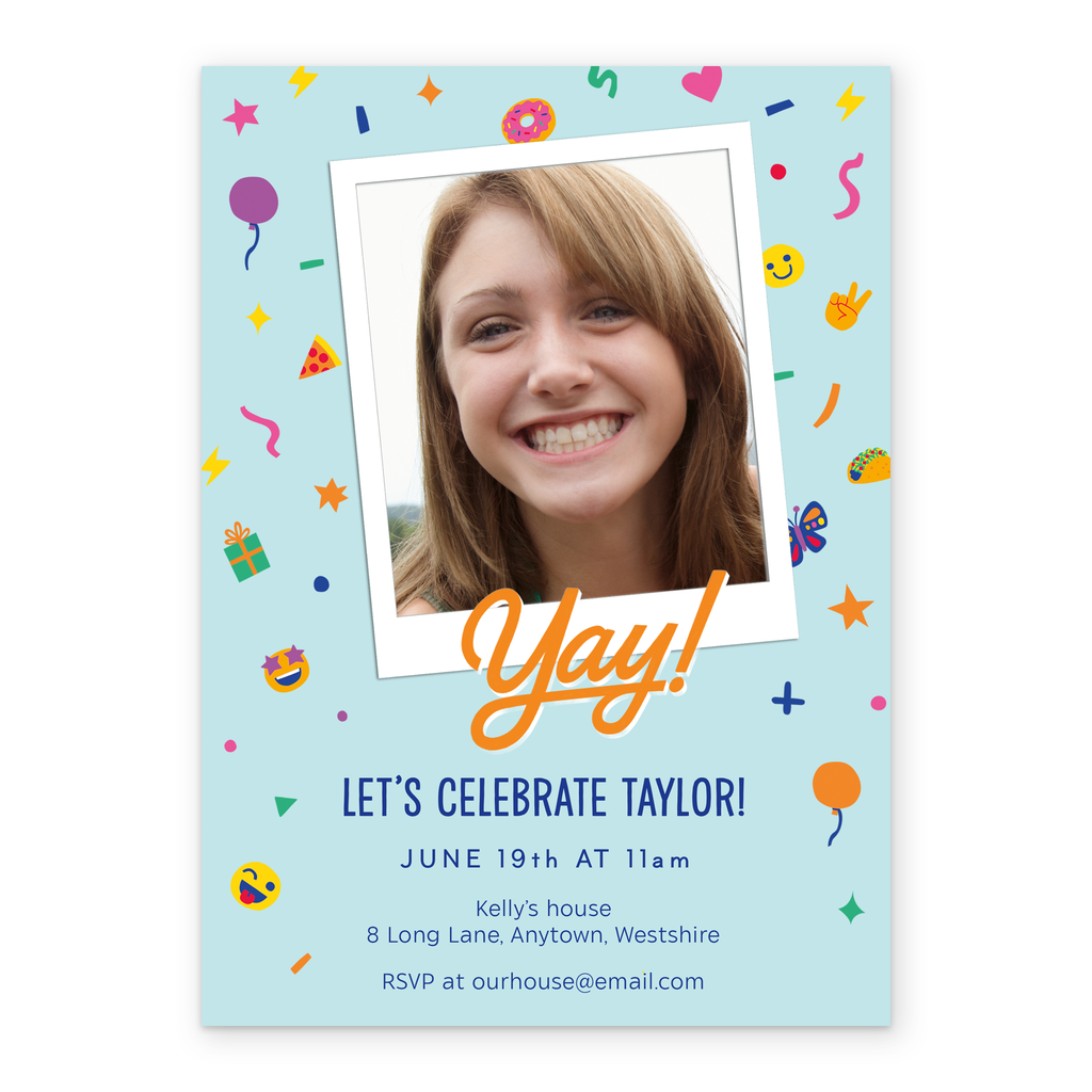 Printed on premium-quality board, this card features editable space for a date, address and contact details, fun emojis and celebration icons design, with the message 'Yay! Let's Celebrate [Name]!', space to upload a photo and personalise a name, and comes complete with a co-ordinating white envelope.