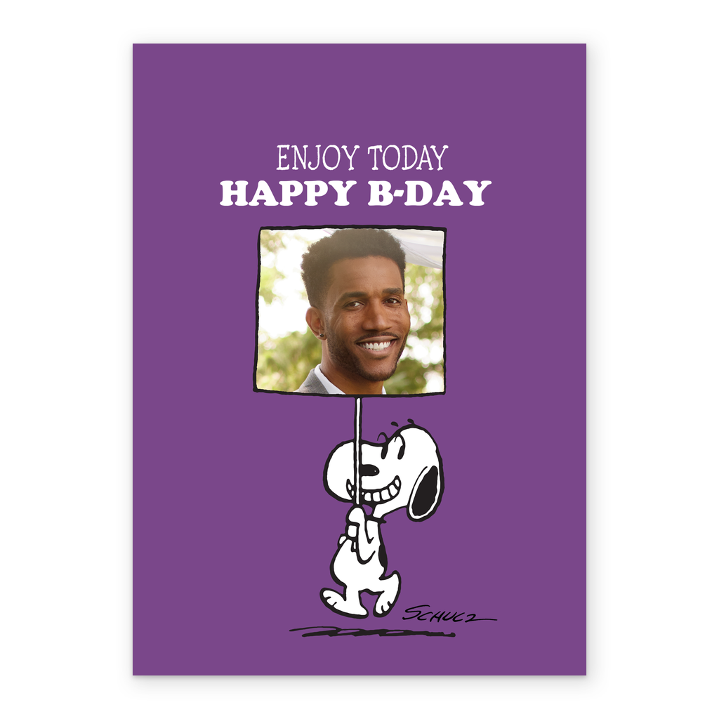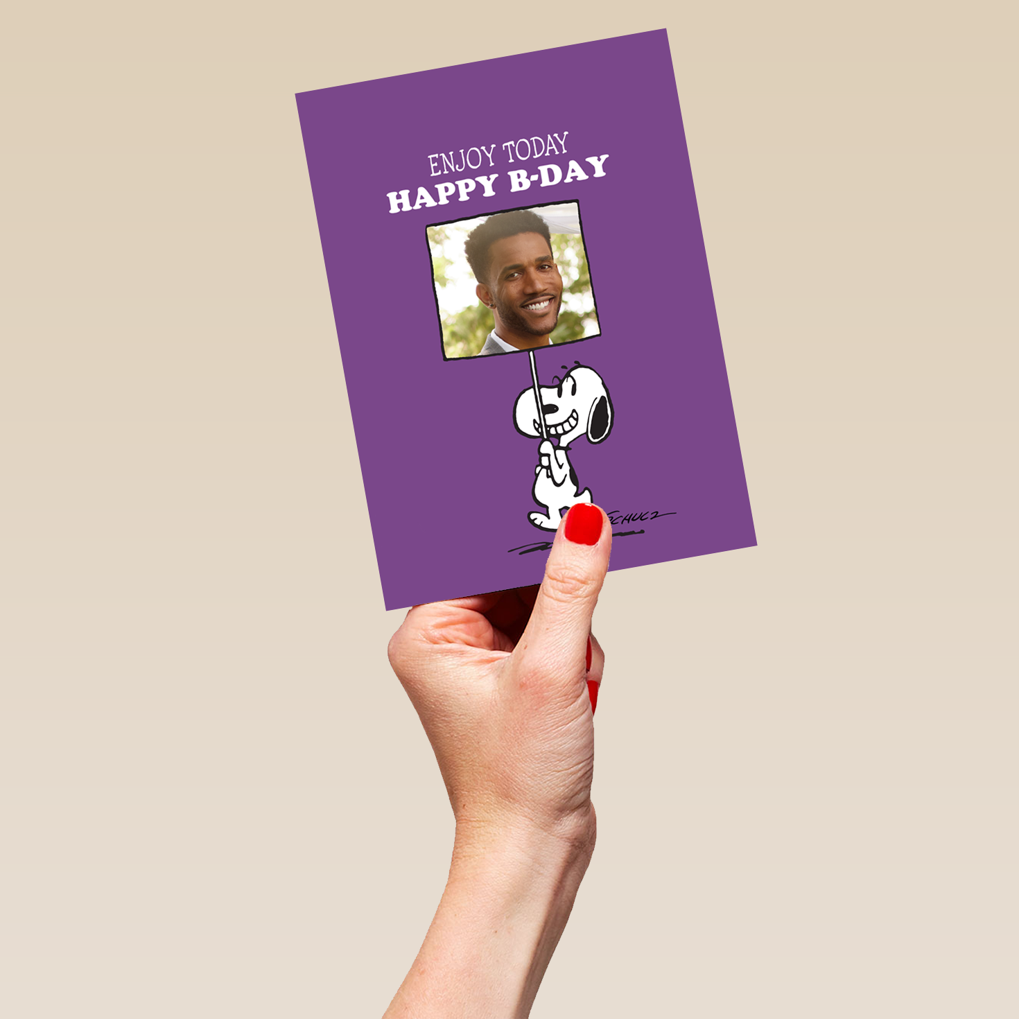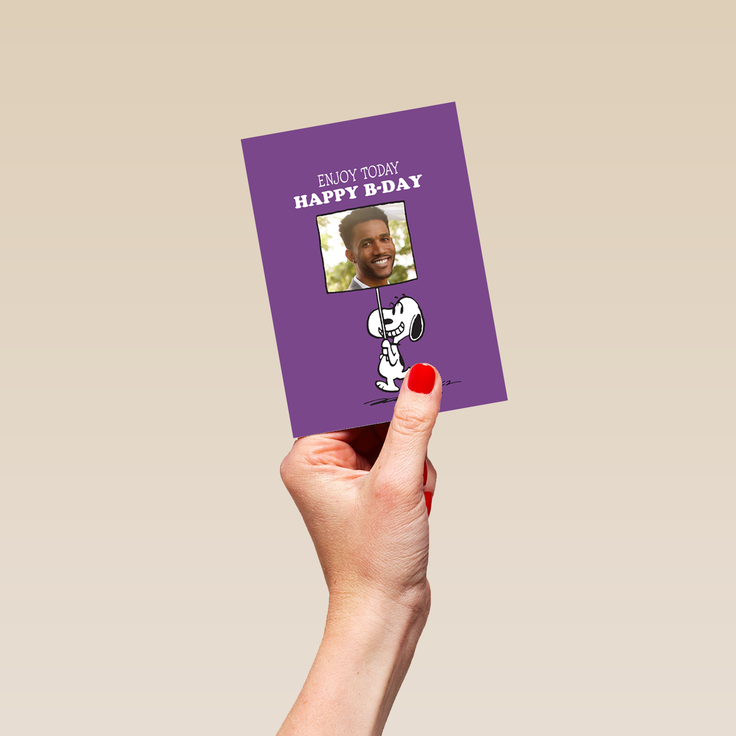 Printed on premium-quality board, this card features PEANUTS™ SNOOPY holding up a sign, with the message 'Enjoy Today Happy B-Day', space to upload a photo, and comes complete with a co-ordinating white envelope.