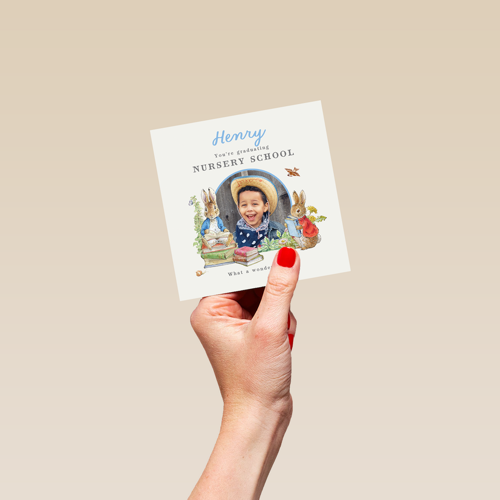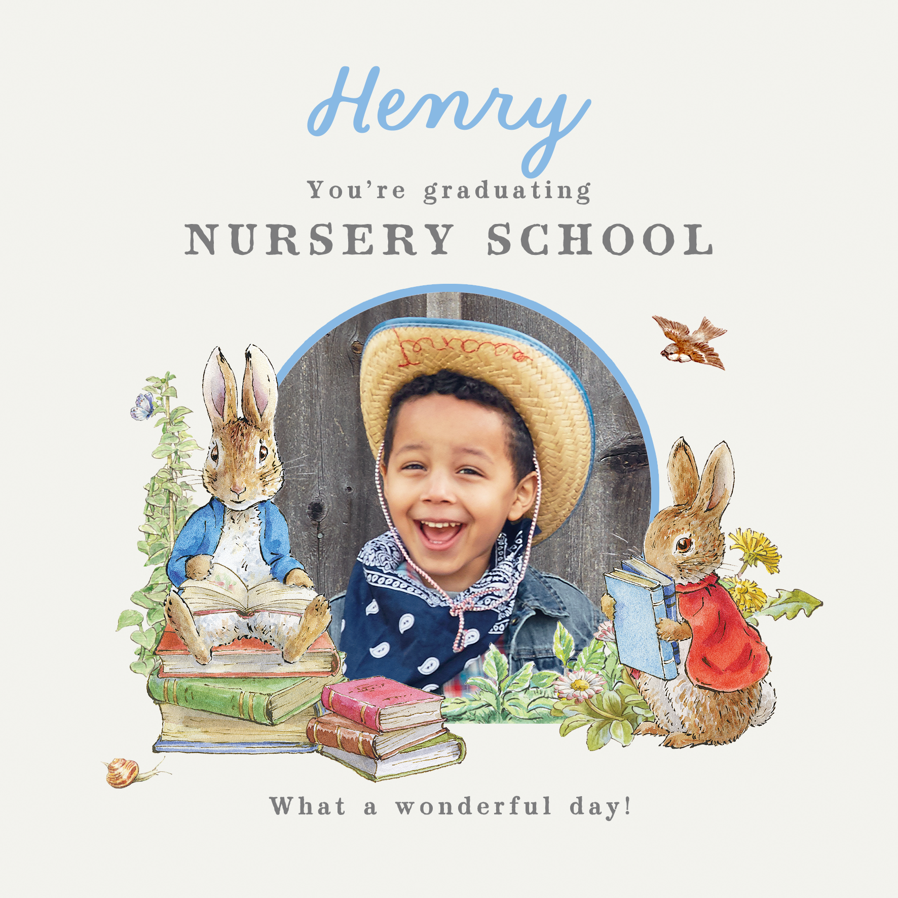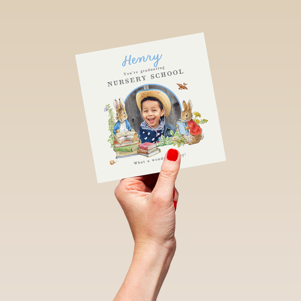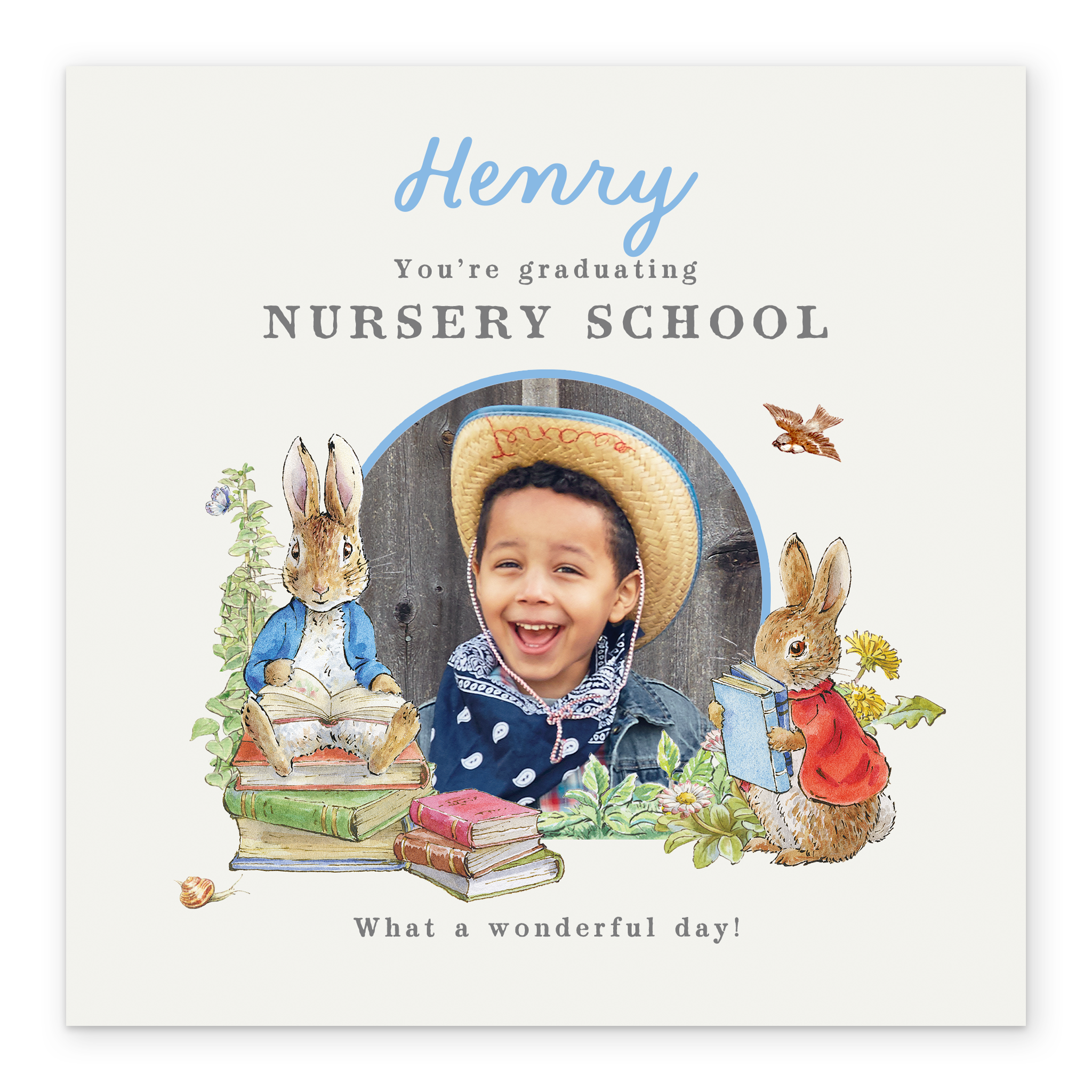 Printed on premium-quality board, this card features Peter Rabbit™ and Flopsy Bunny, with the message '[NAME] You're graduating Nursery School. What a wonderful day!', space to upload a photo and personalise a name, and comes complete with a co-ordinating white envelope.