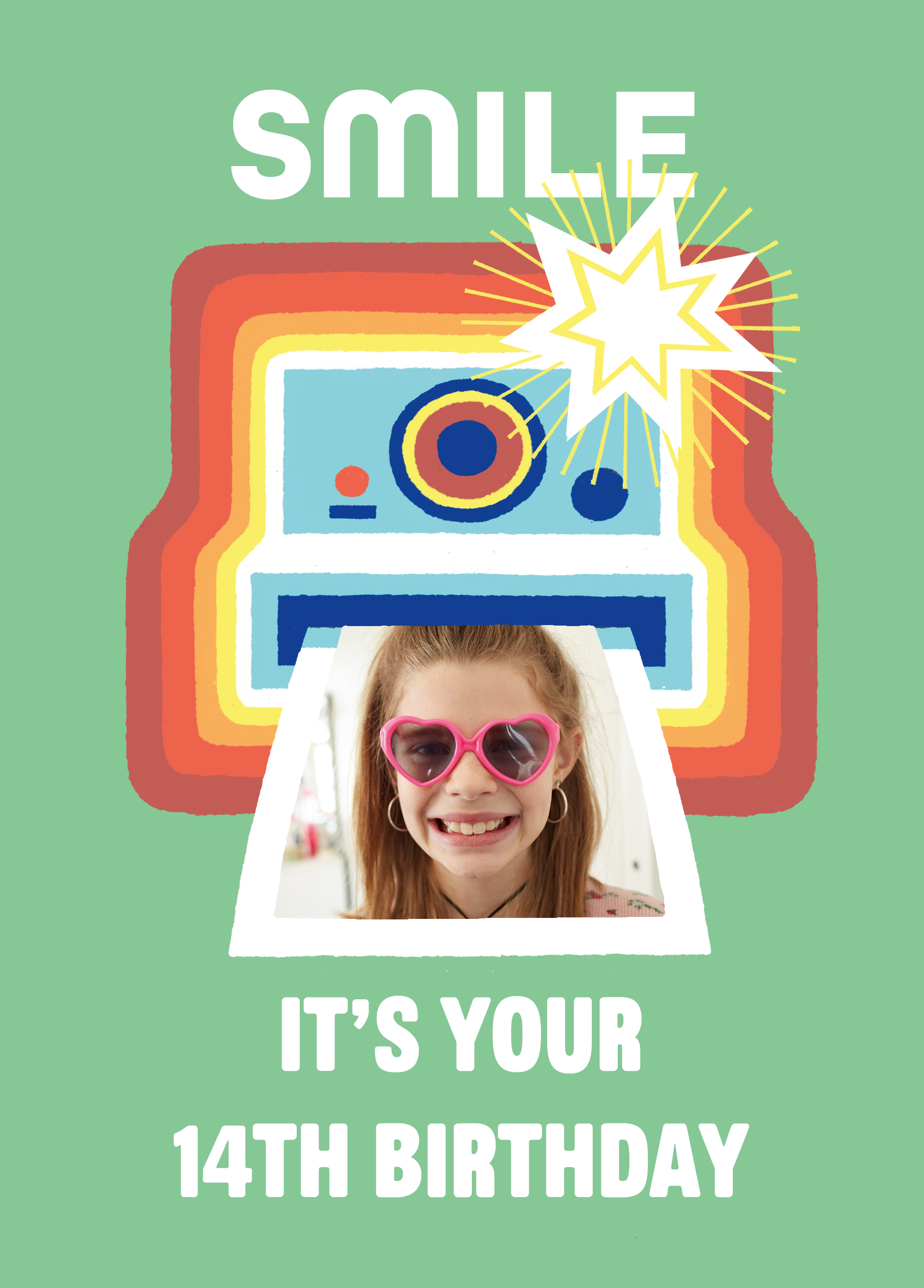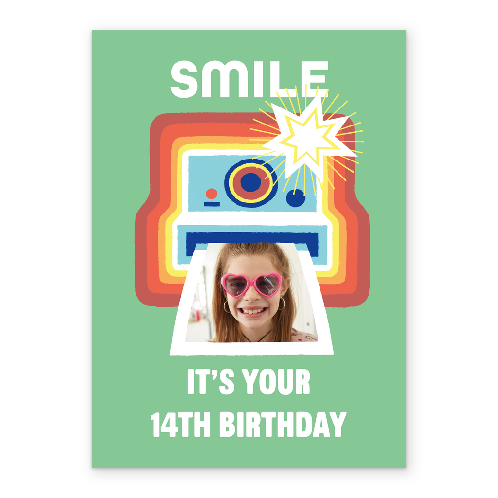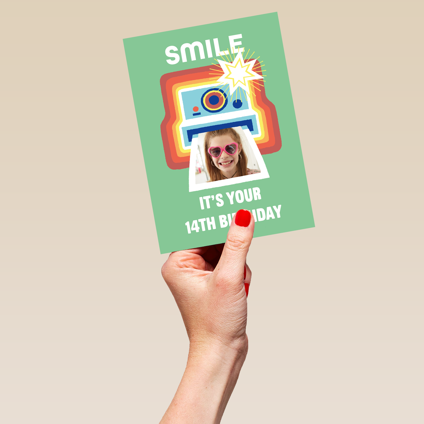 Printed on premium-quality board, this card features a polaroid camera taking a shot and printing out the photo, with the message 'Smile, it's your birthday', space to upload a photo and personalise the age, and comes complete with a co-ordinating white envelope.