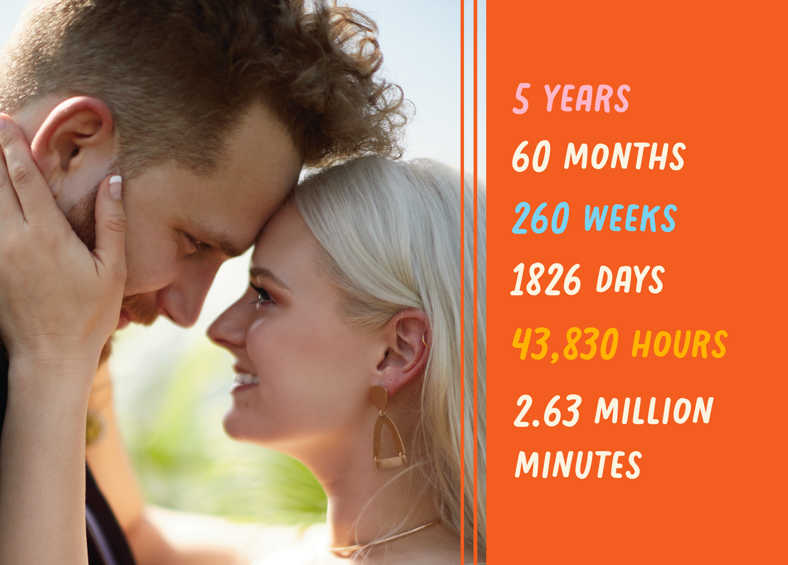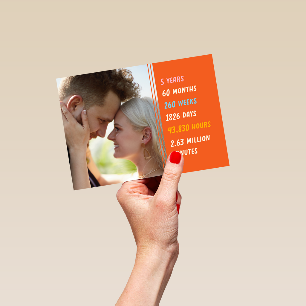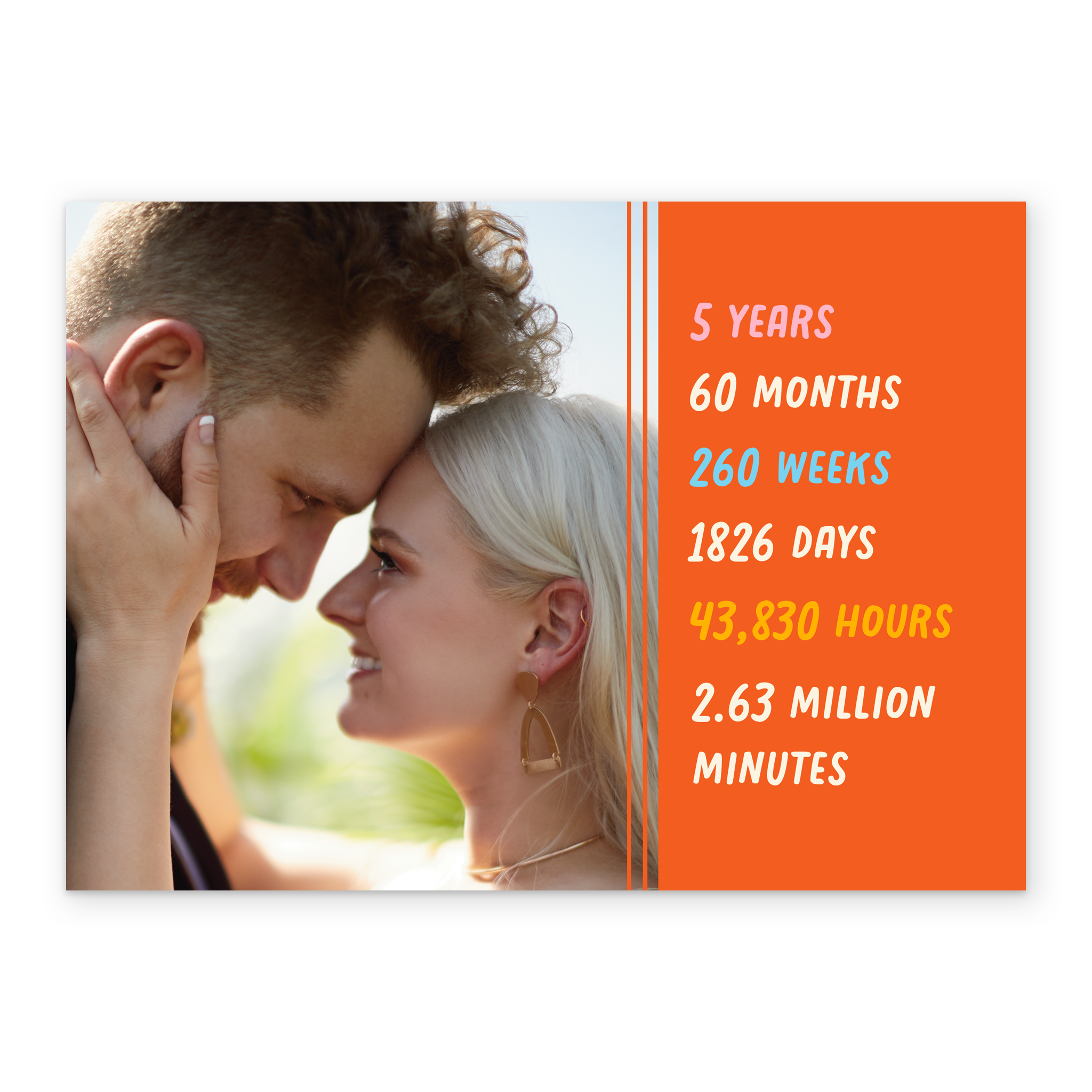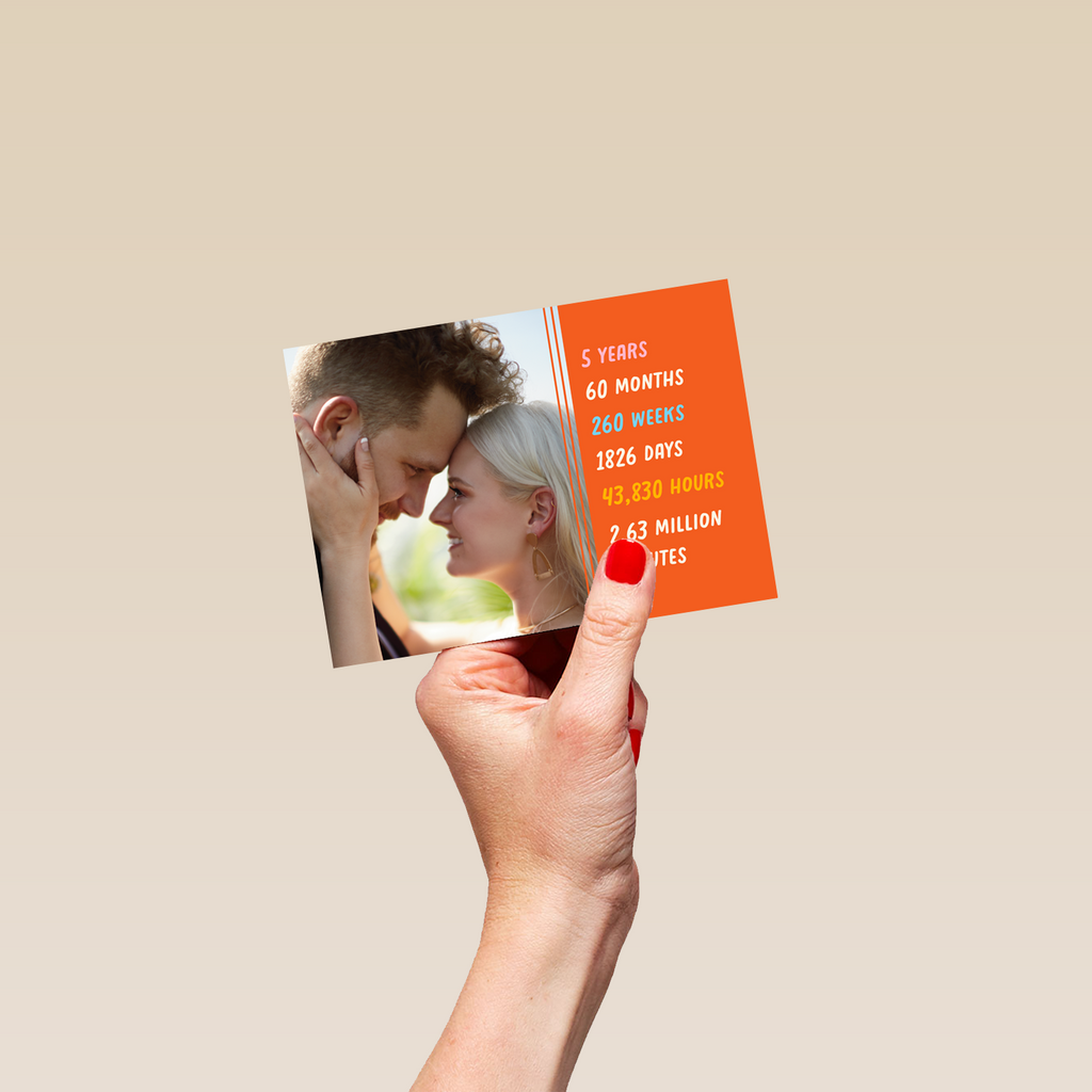 Printed on premium-quality board, this card features an orange block with the years, months, weeks, days and minutes of your relationship, with the message '5 Years 60 Months 260 Weeks 1826 Days 43,830 Hours 2.63 Million Minutes', space to upload a photo and personalise your message, and comes complete with a co-ordinating white envelope.