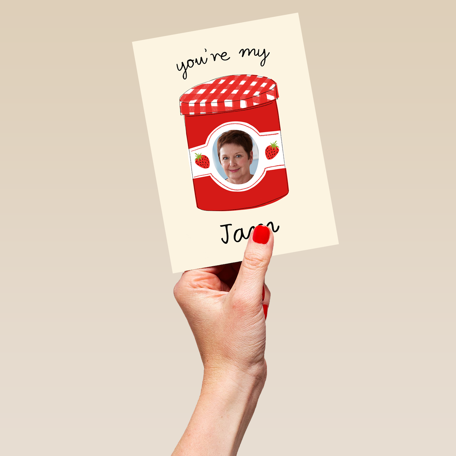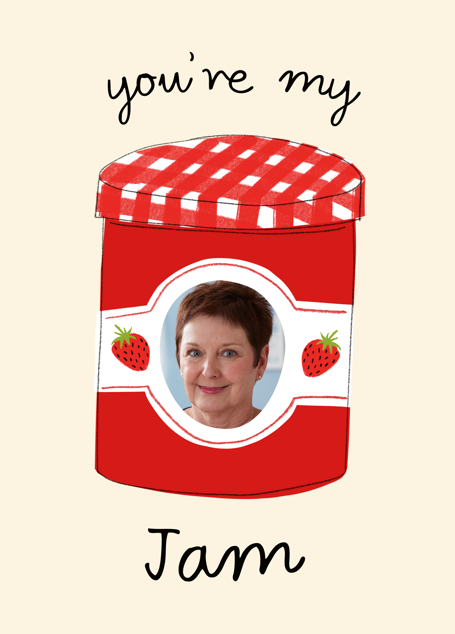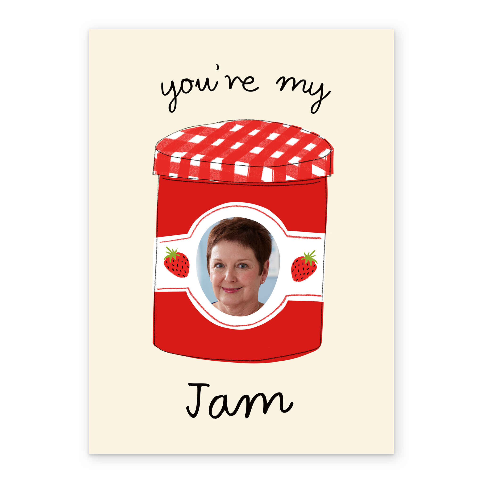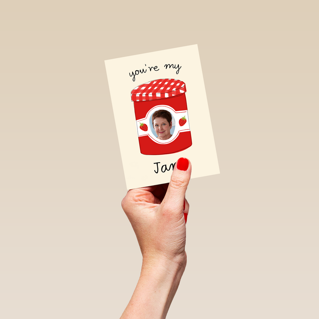 Printed on premium-quality board, this card features a red jam jar with strawberries, with the message 'You're My Jam', space to upload a photo, and comes complete with a co-ordinating white envelope.