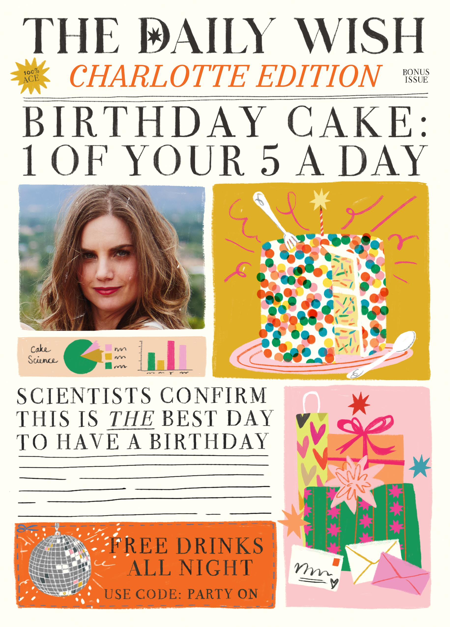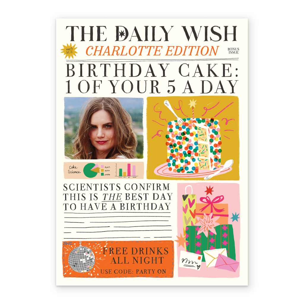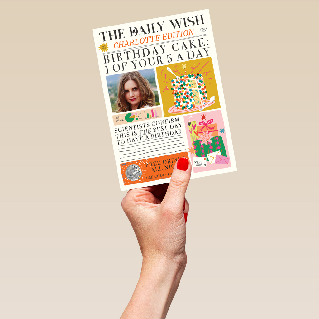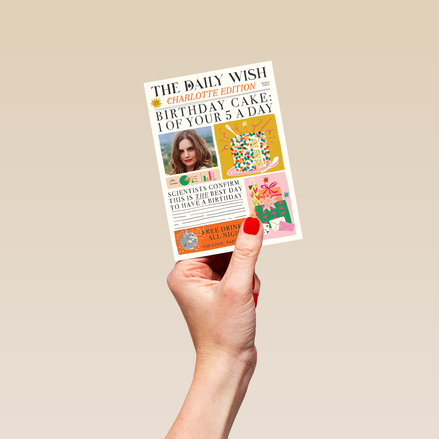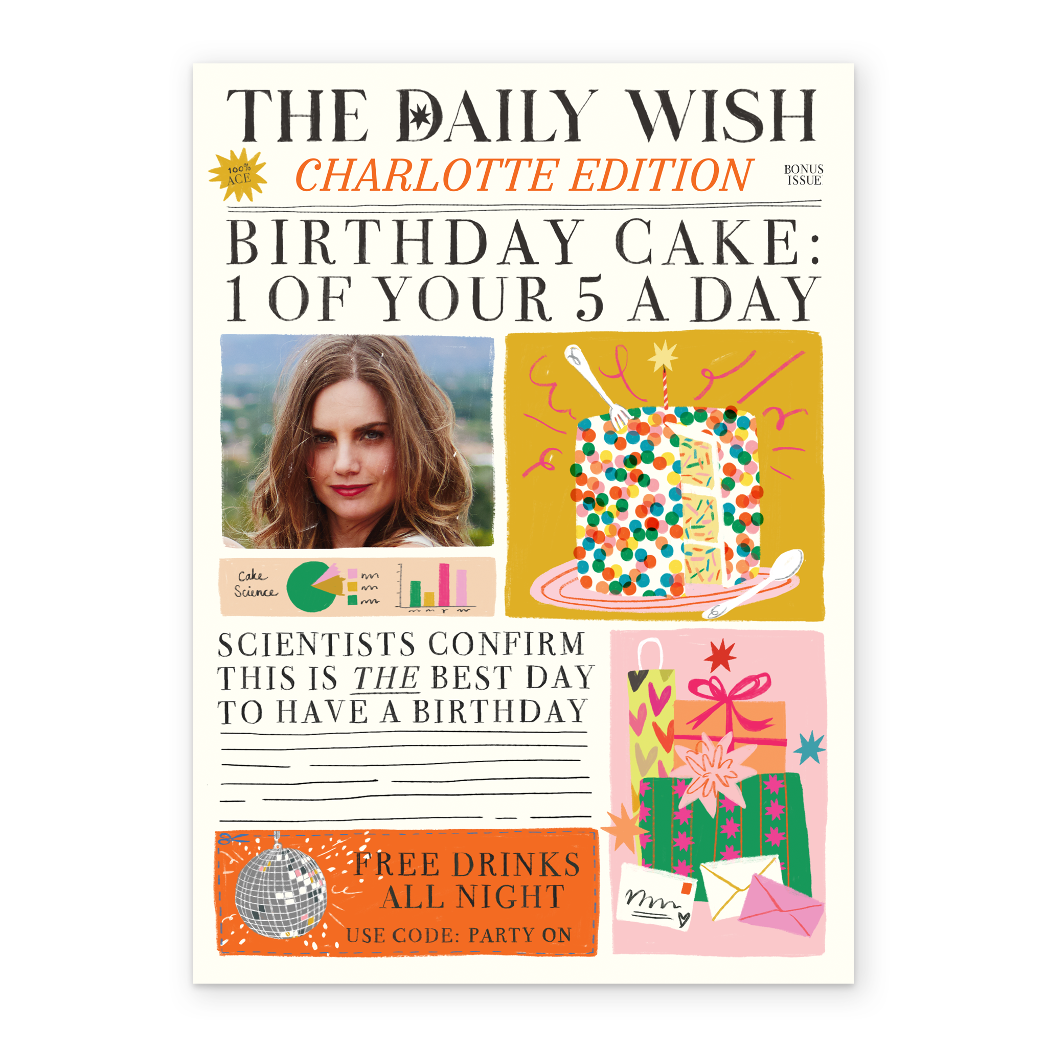 Printed on premium-quality board, this card features The Daily Wish' newspaper front cover design, with the message 'Birthday cake: 1 of your 5 a day. Scientists confirm this is the best day to have a birthday.', space to upload a photo and personalise a name, and comes complete with a co-ordinating white envelope.