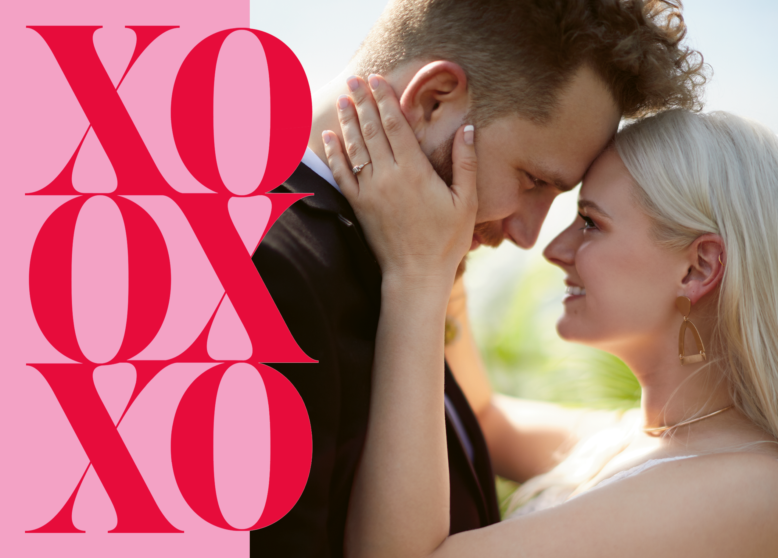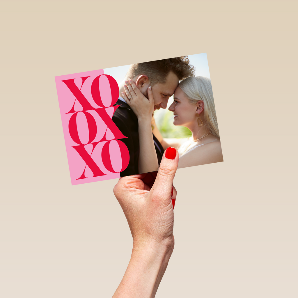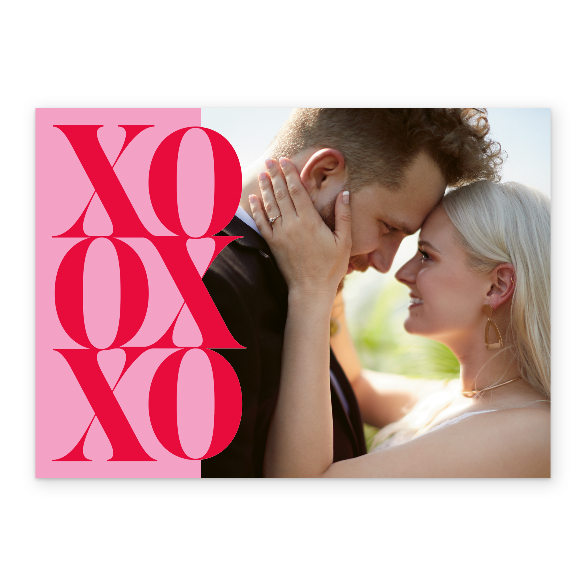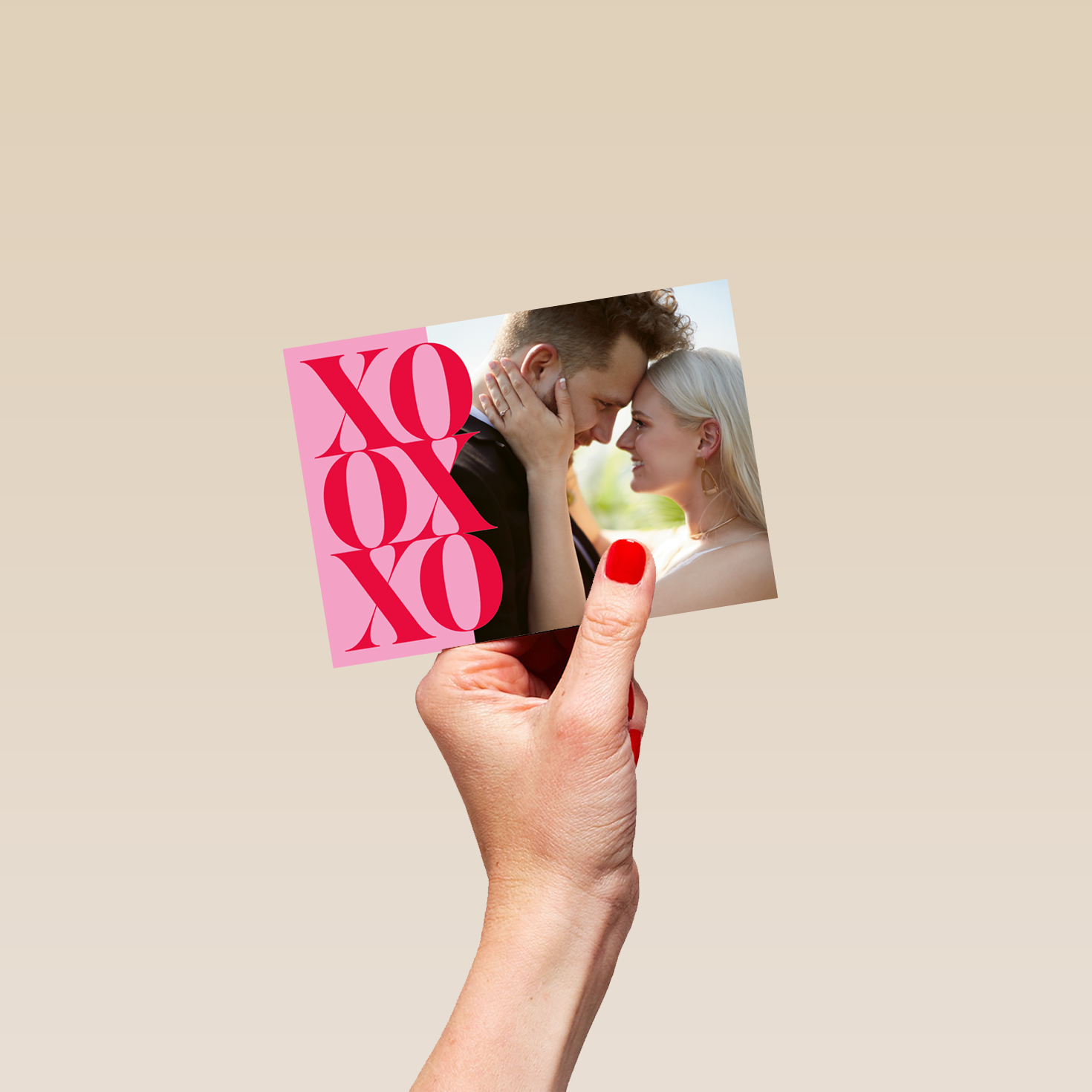 Printed on premium-quality board, this card features pink typography word art, with the message 'XOXOXO', space to upload a photo, and comes complete with a co-ordinating white envelope.