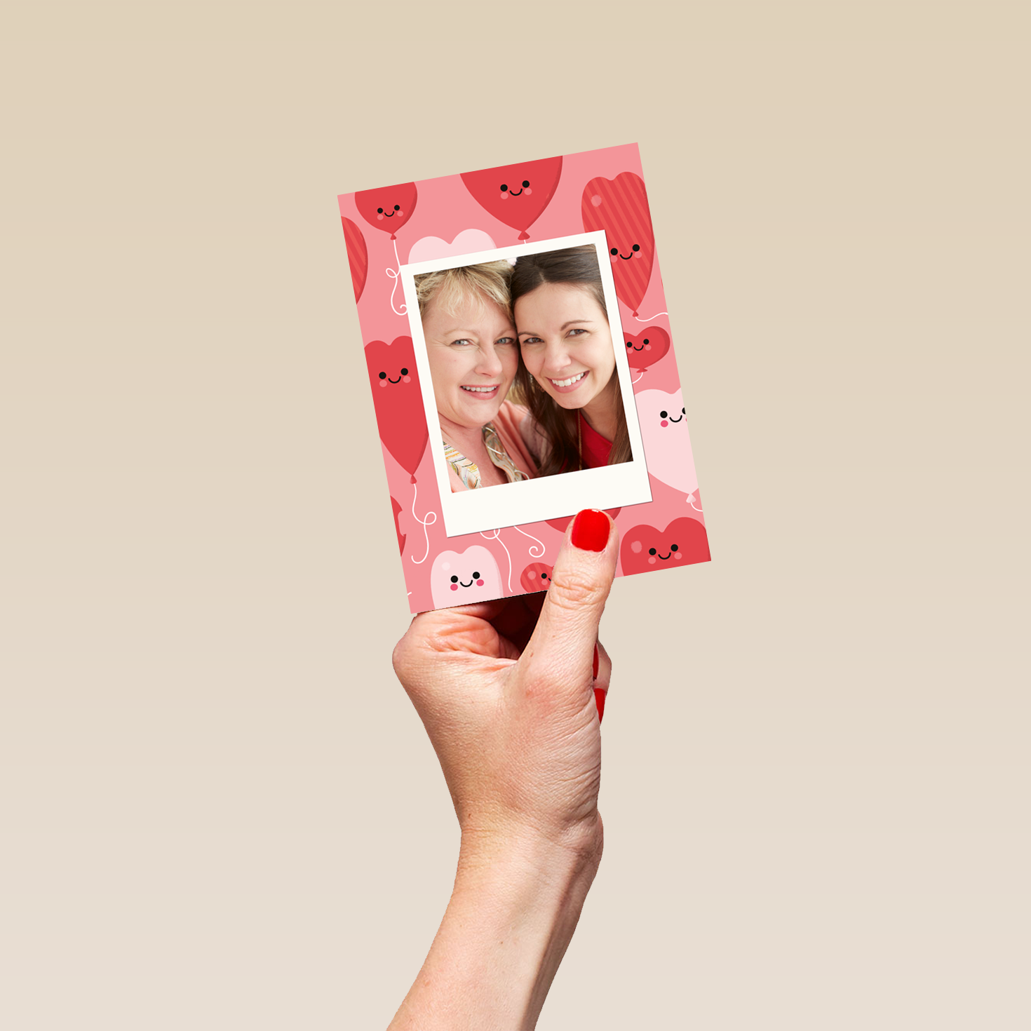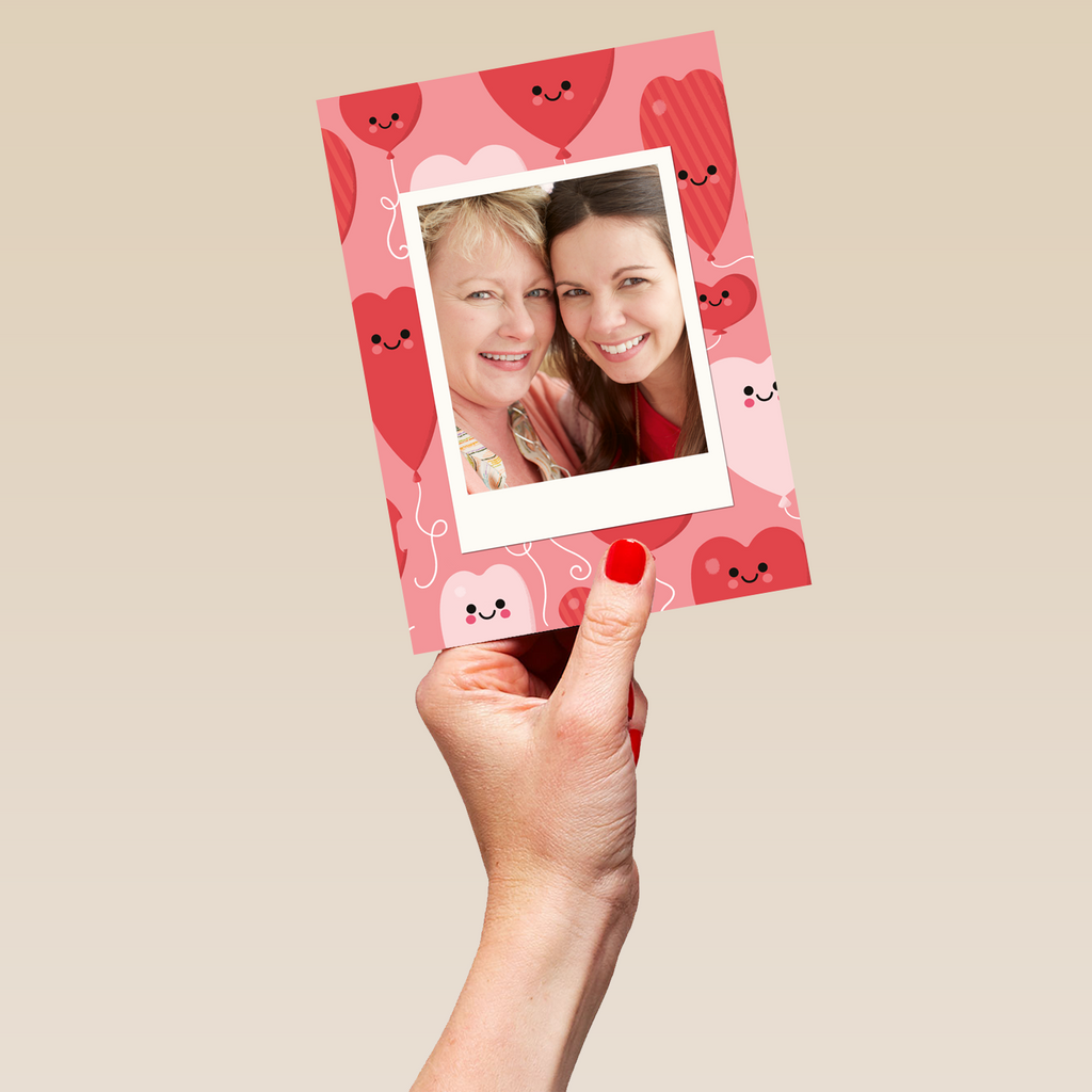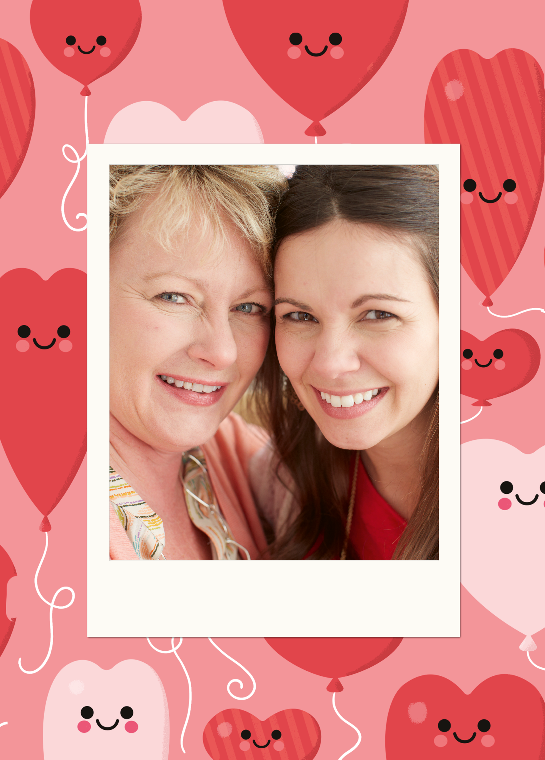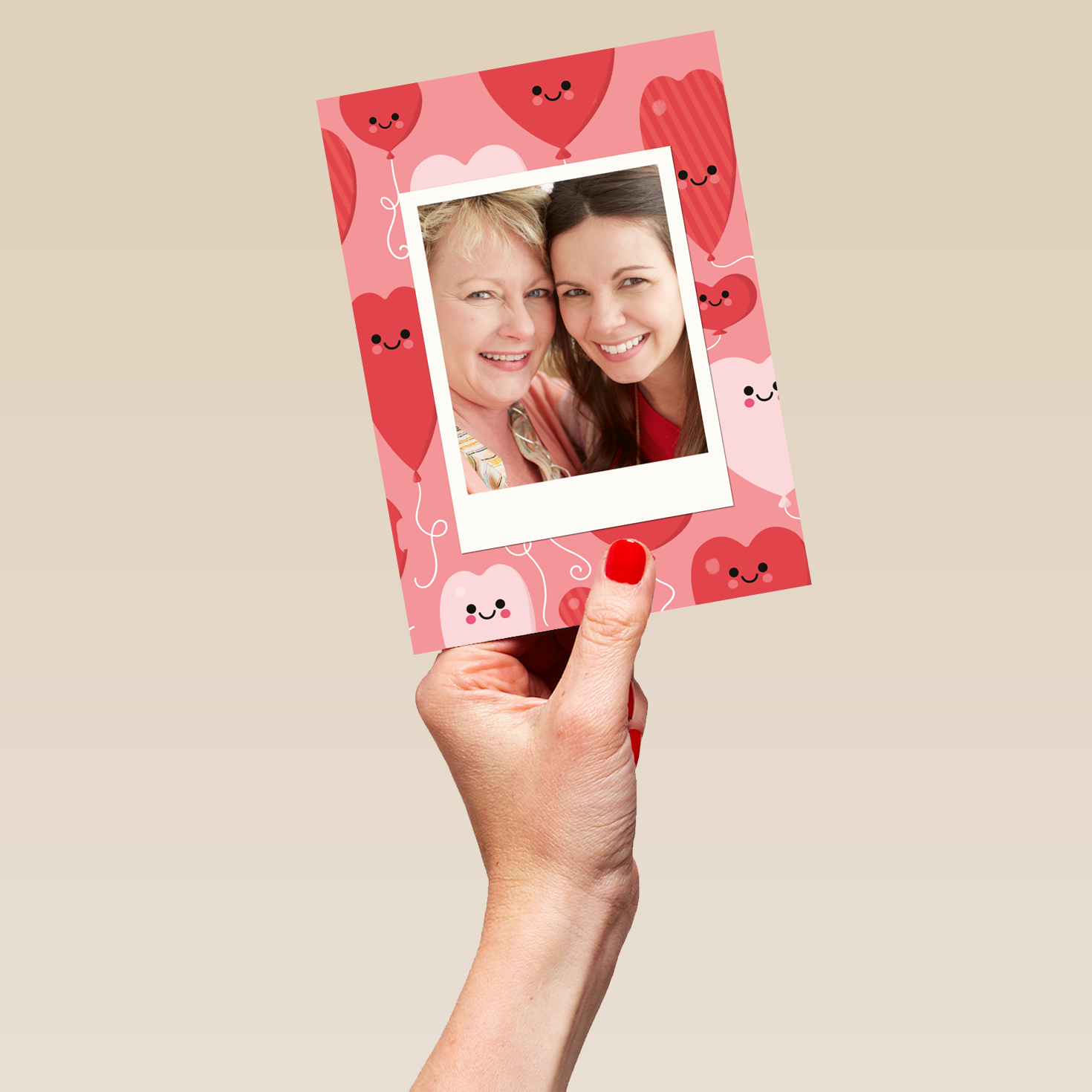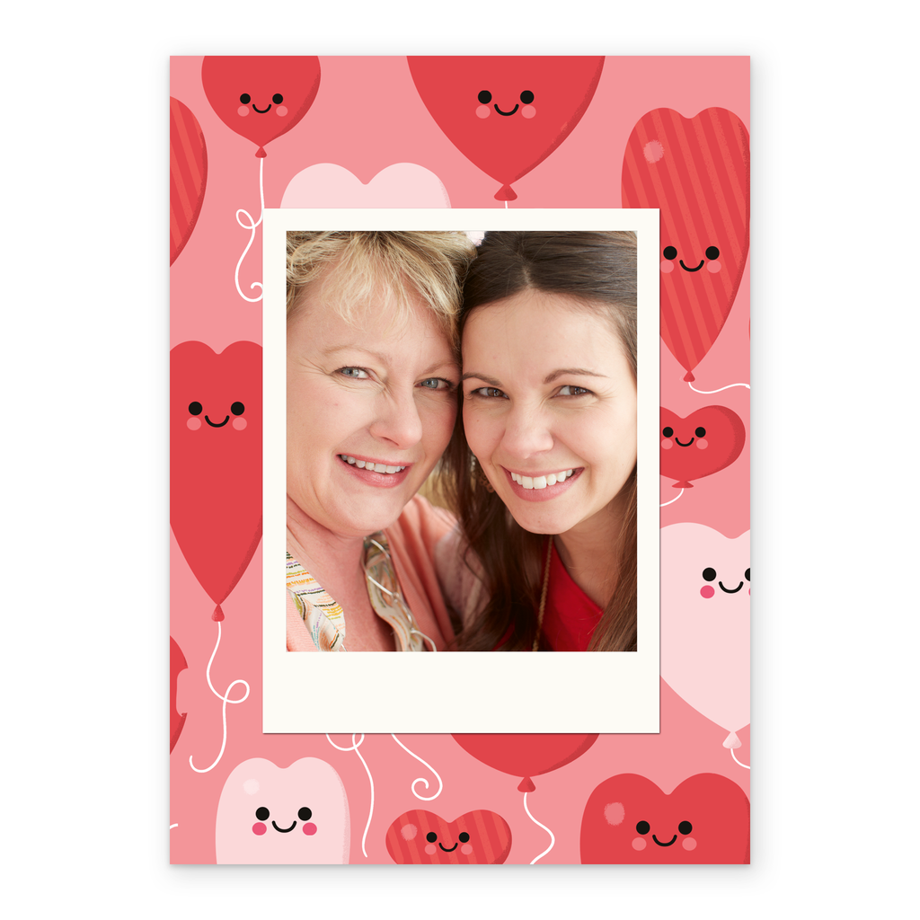 Printed on premium-quality board, this card features smiling love heart balloons, space to upload a photo, and comes complete with a co-ordinating white envelope.