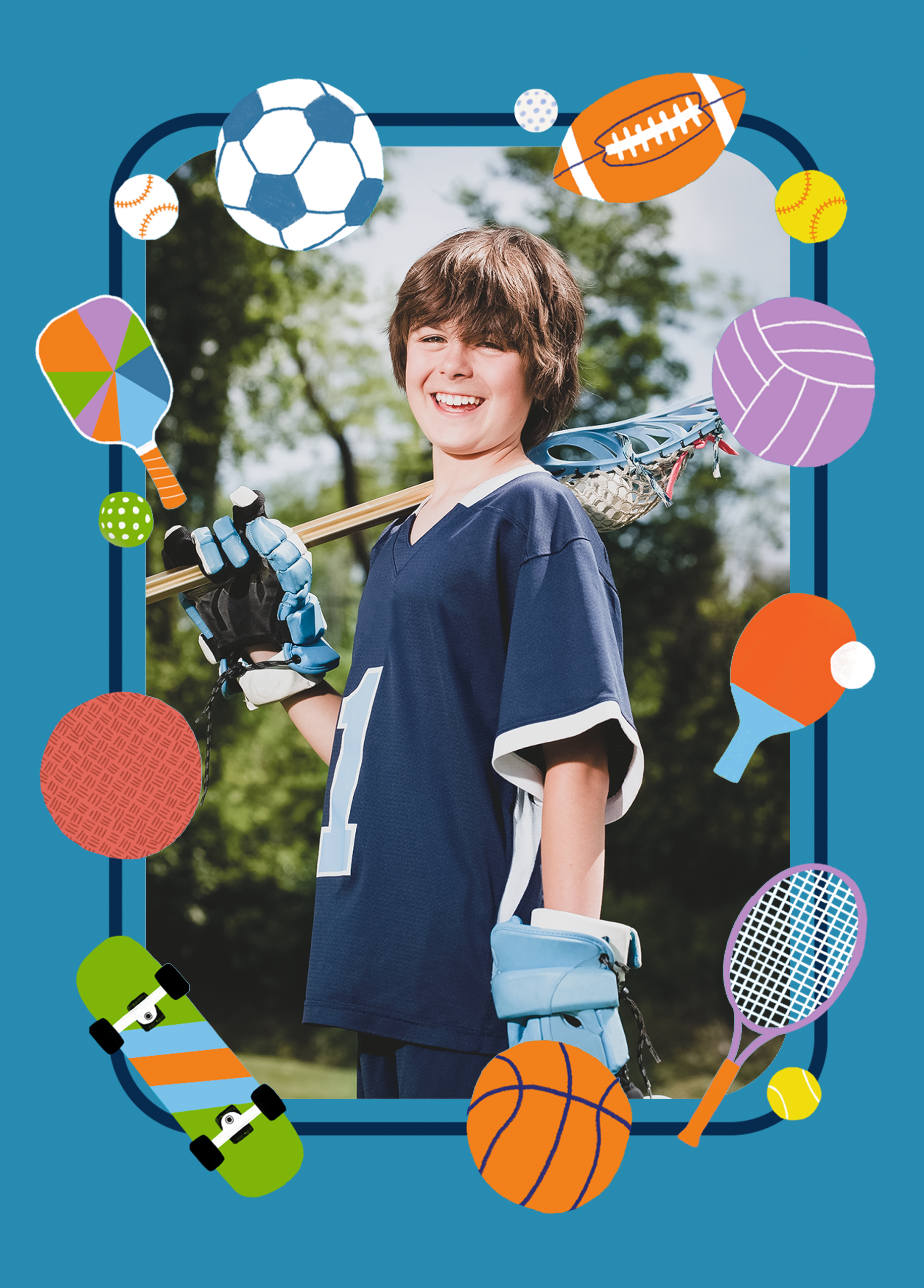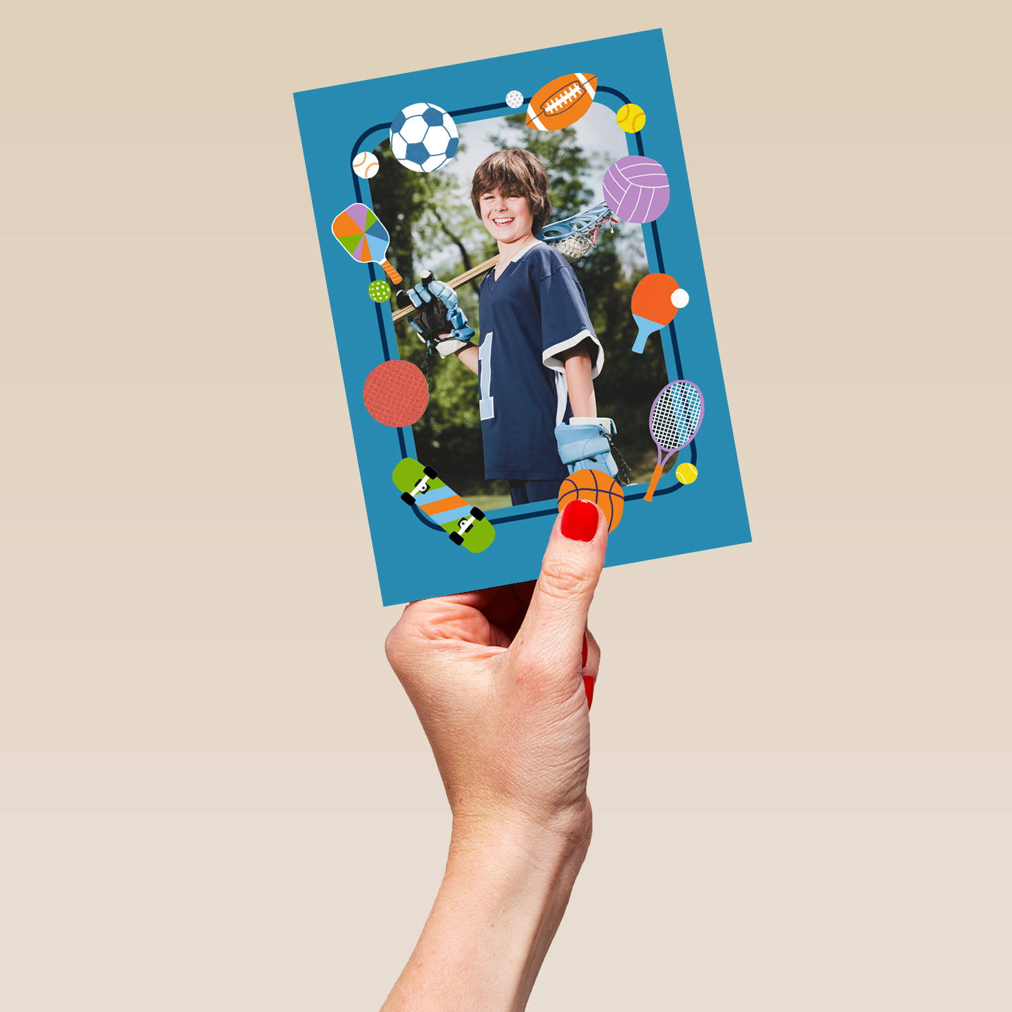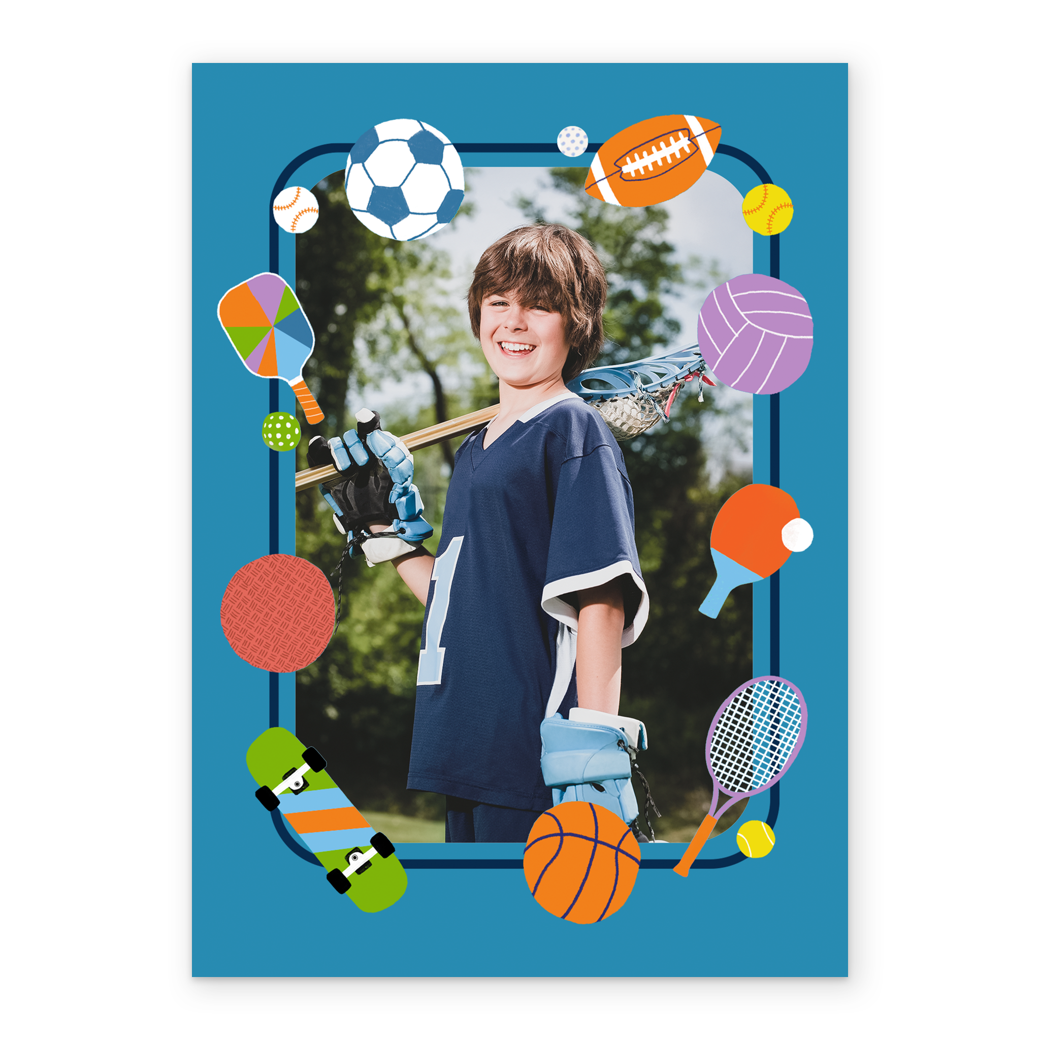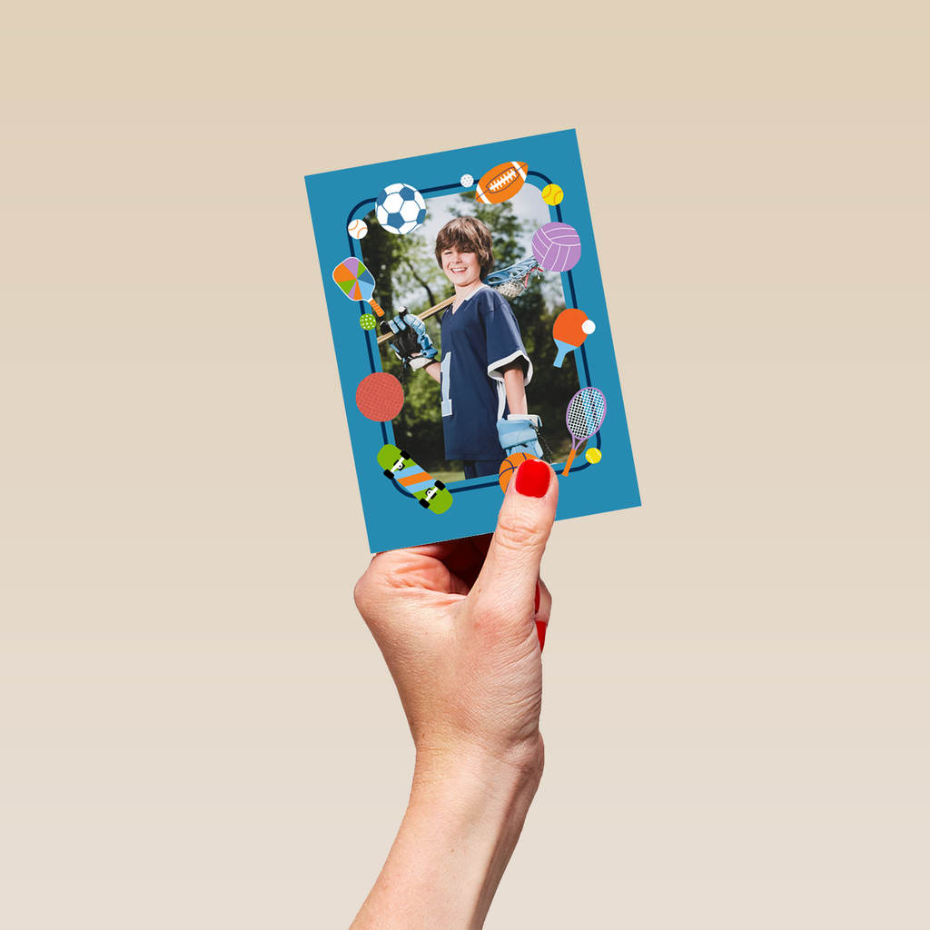 Printed on premium-quality board, this card features a blue border surrounded by different hobbies and icons, including football, golf, American football, tennis, volleyball, ping pong, basket ball, skateboard, dodgeball and baseball, space to upload a photo, and comes complete with a co-ordinating white envelope.