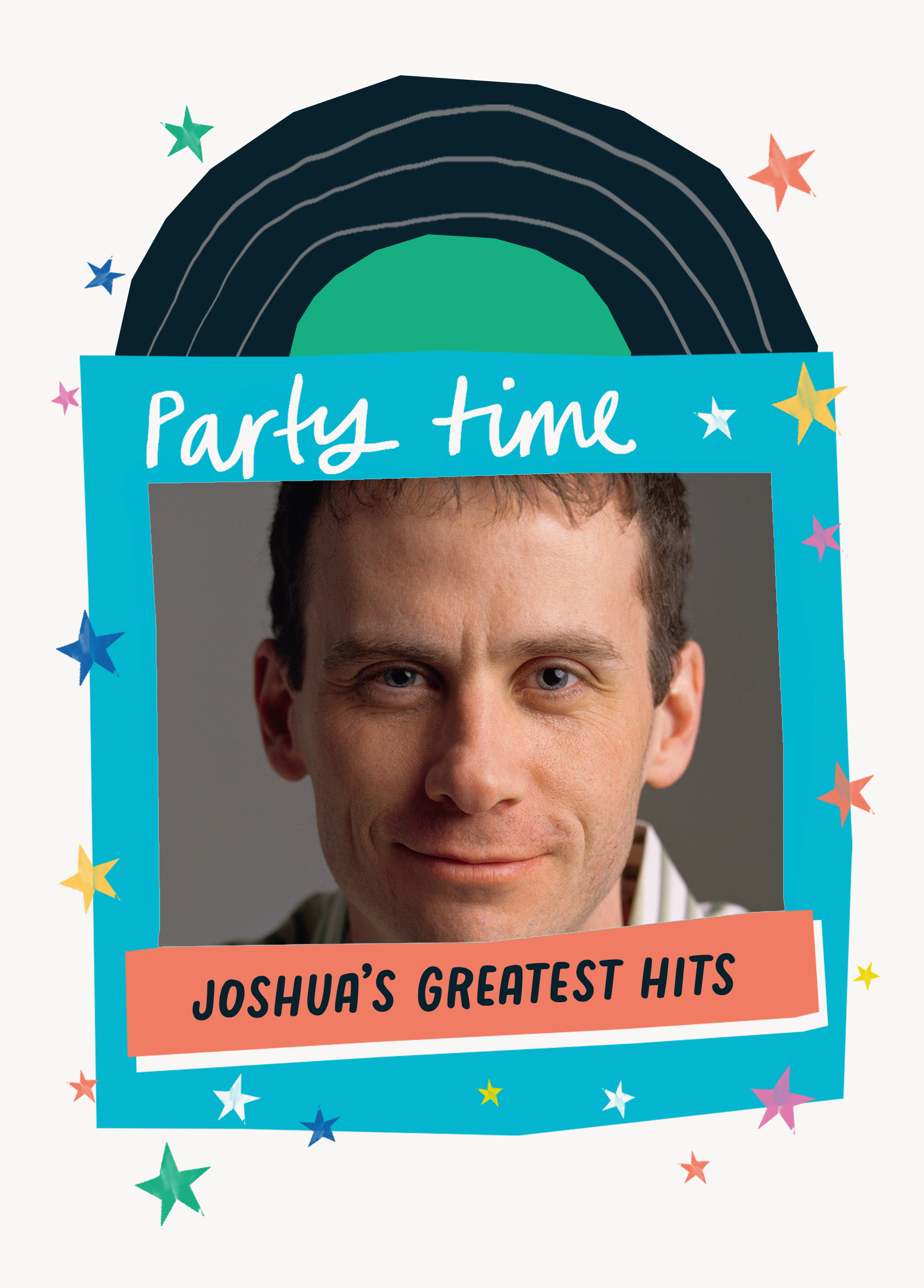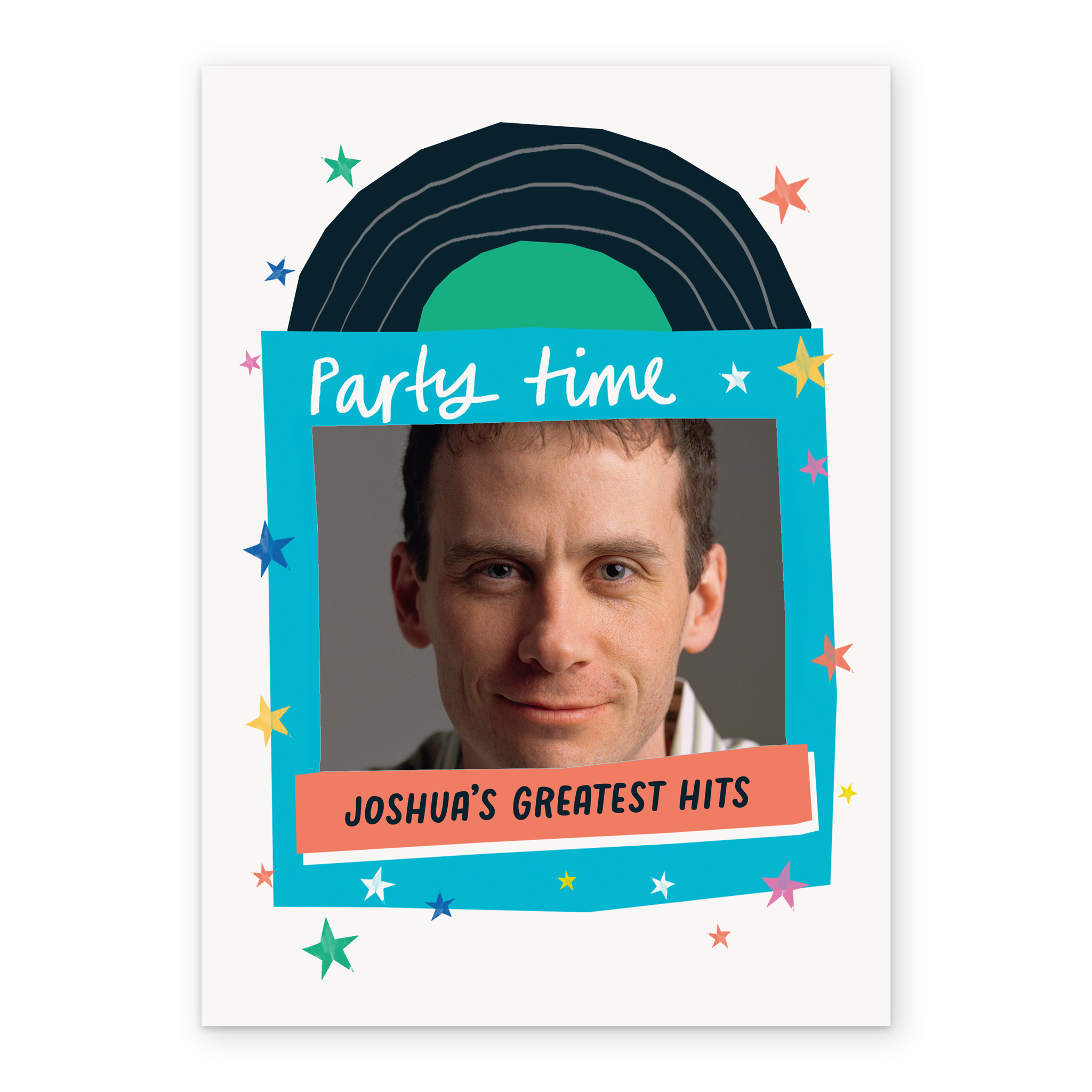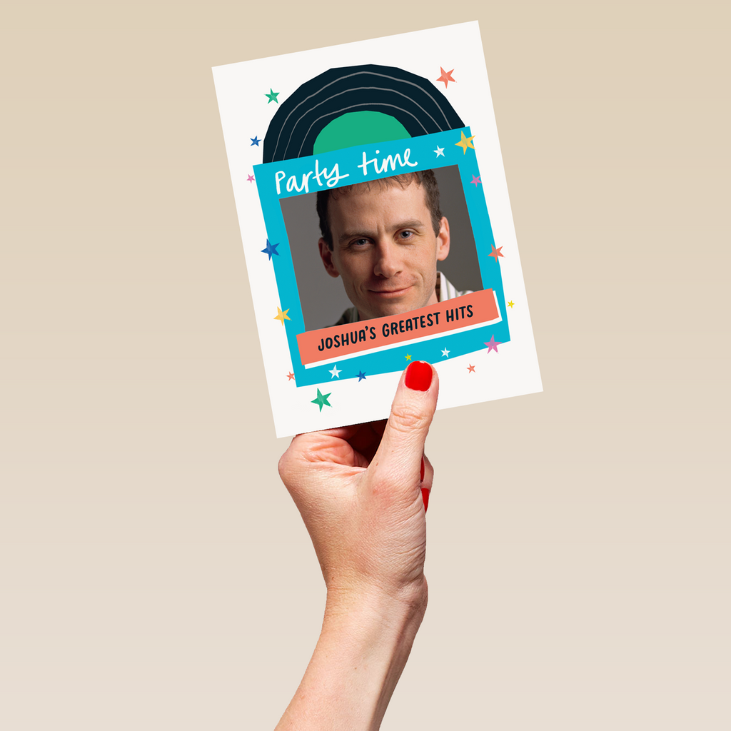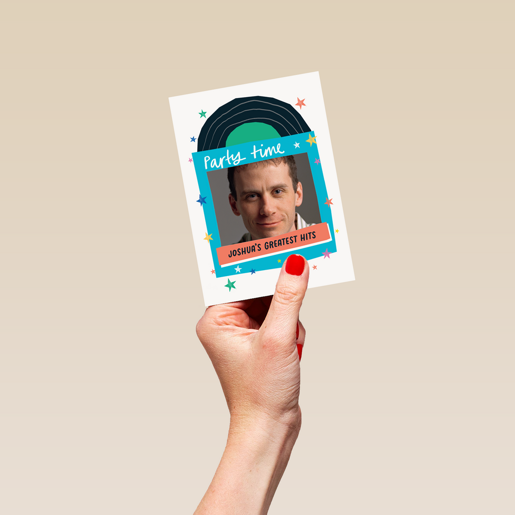 Printed on premium-quality board, this card features a vinyl record and sleeve, with the message 'Party time, [NAME]'s greatest hits', space to upload a photo and personalise a name, and comes complete with a co-ordinating white envelope.