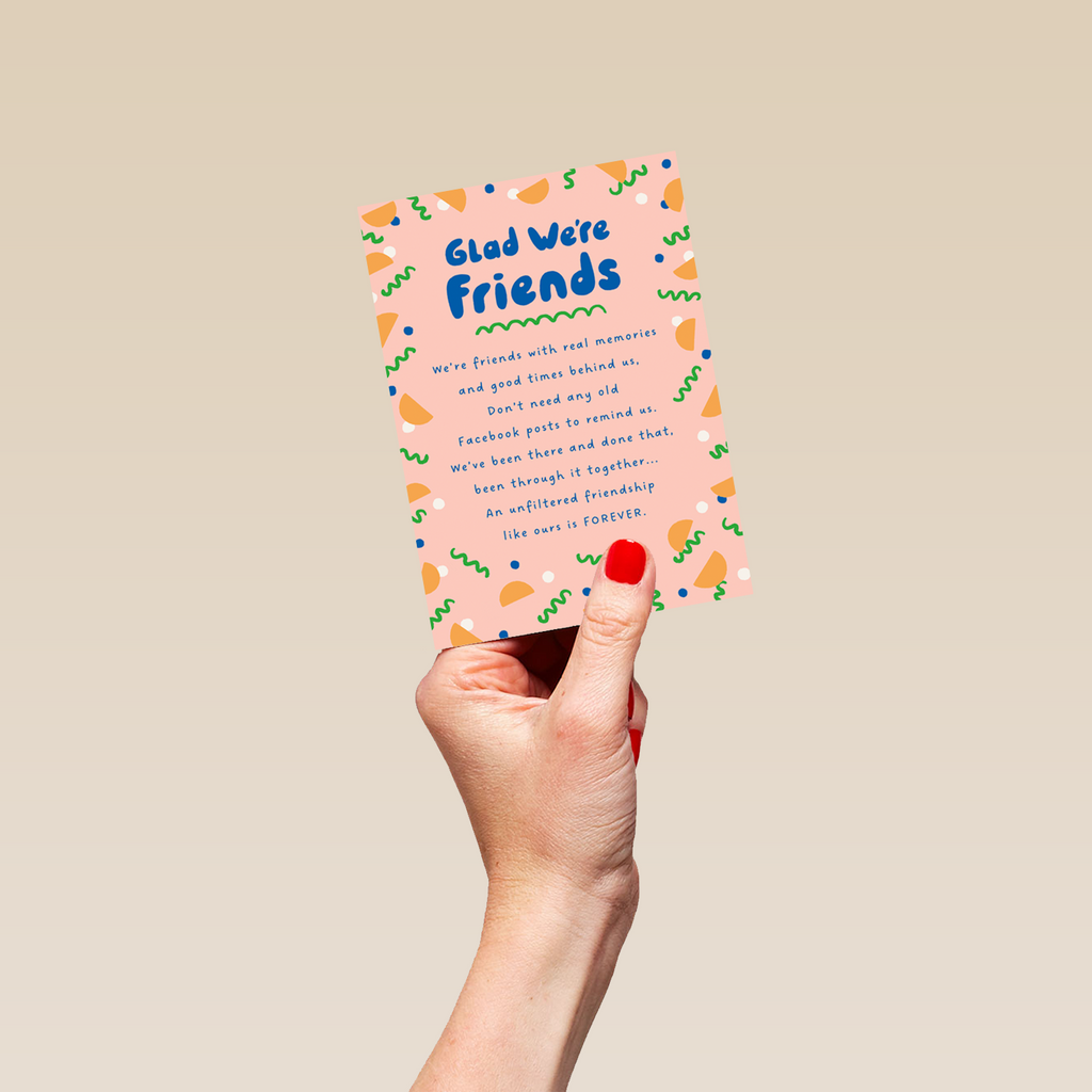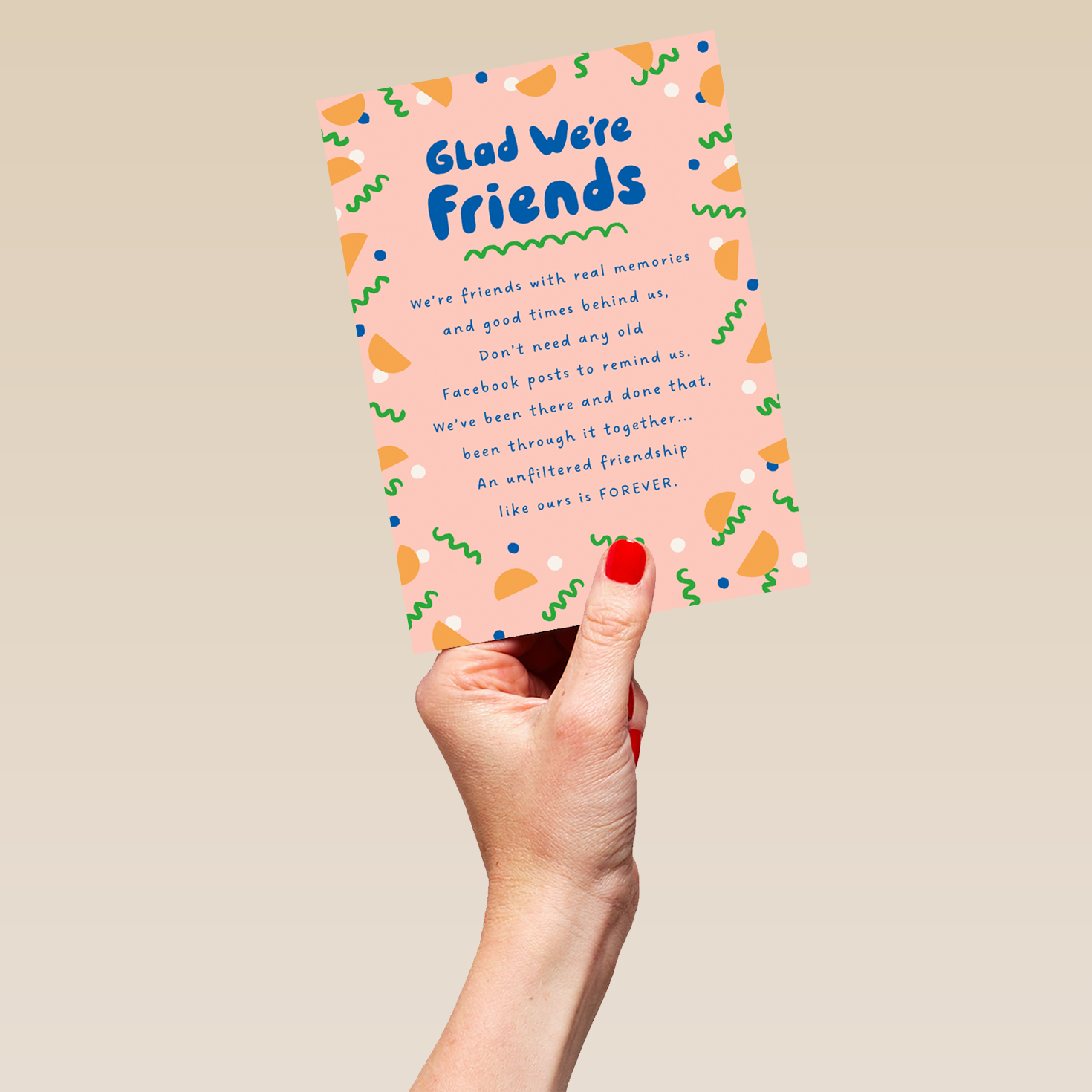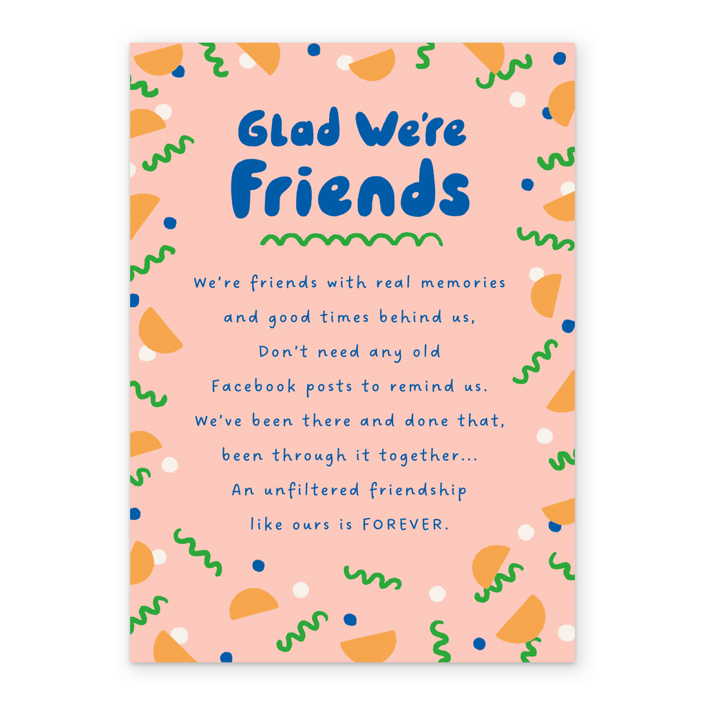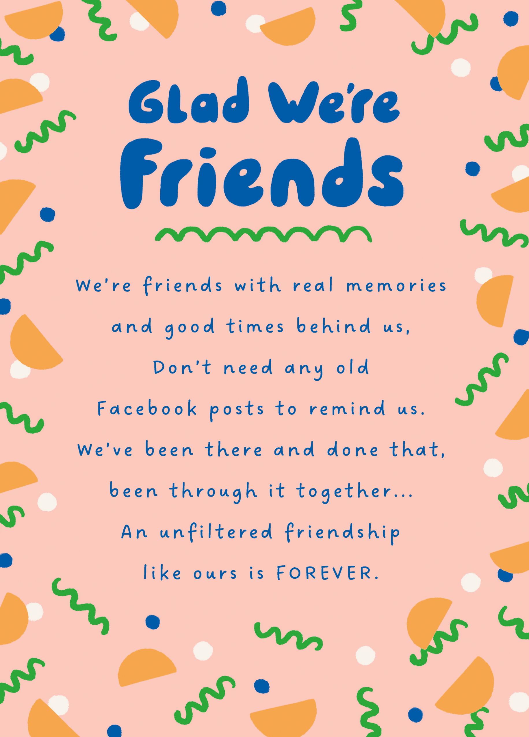 Printed on premium-quality board, this card features a pink background with squiggles, shapes and a heartfelt verse, with the message 'Glad We're Friends. We're friends with real memories and good times behind us, Don't need any old Facebook posts to remind us. We've been there and done that, been through it together… An unfiltered friendship like ours is FOREVER.', and comes complete with a co-ordinating white envelope.