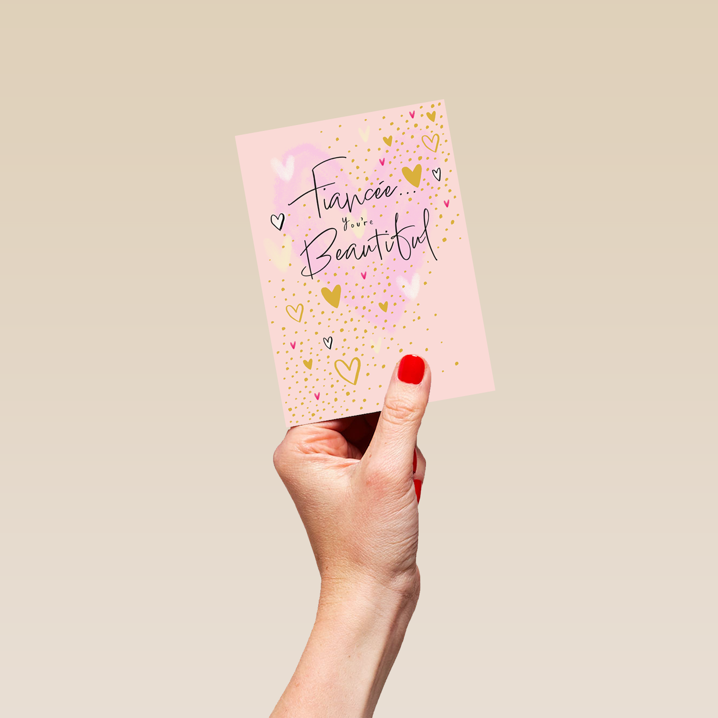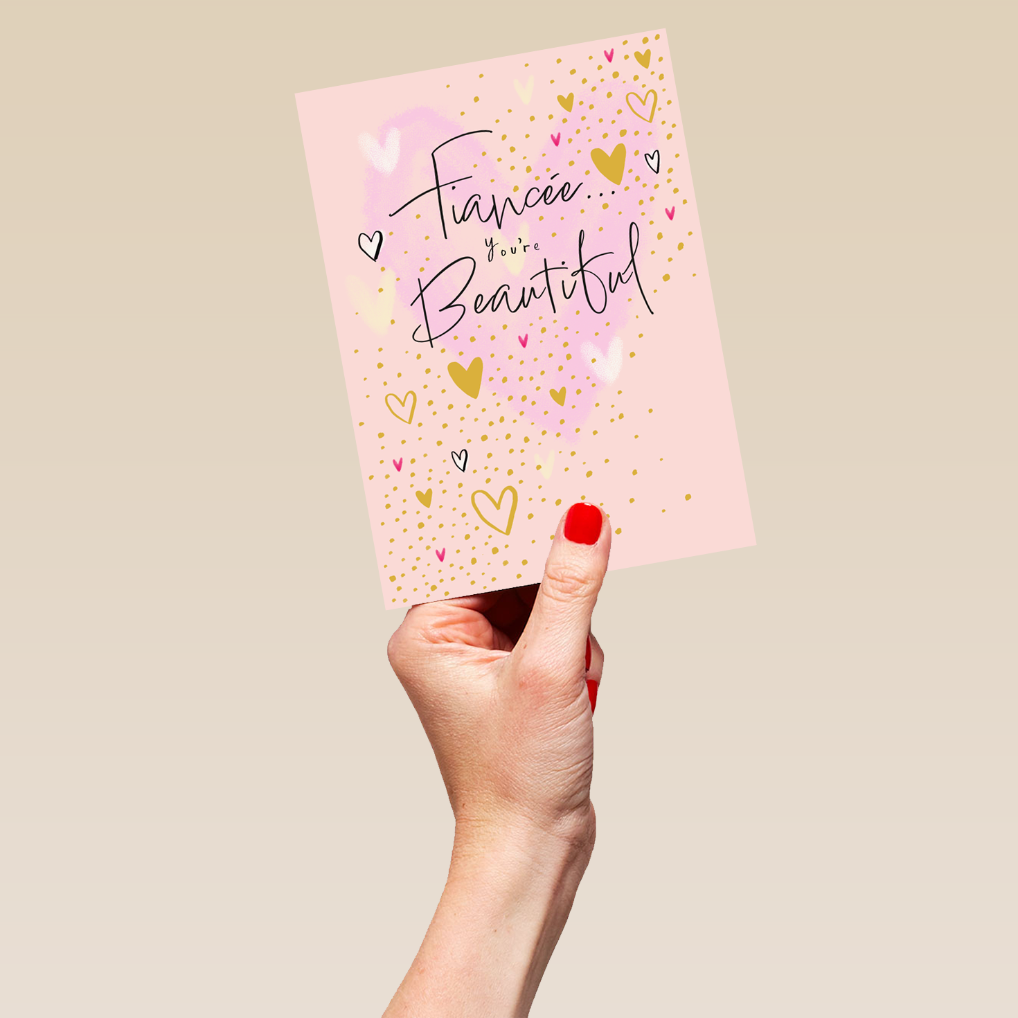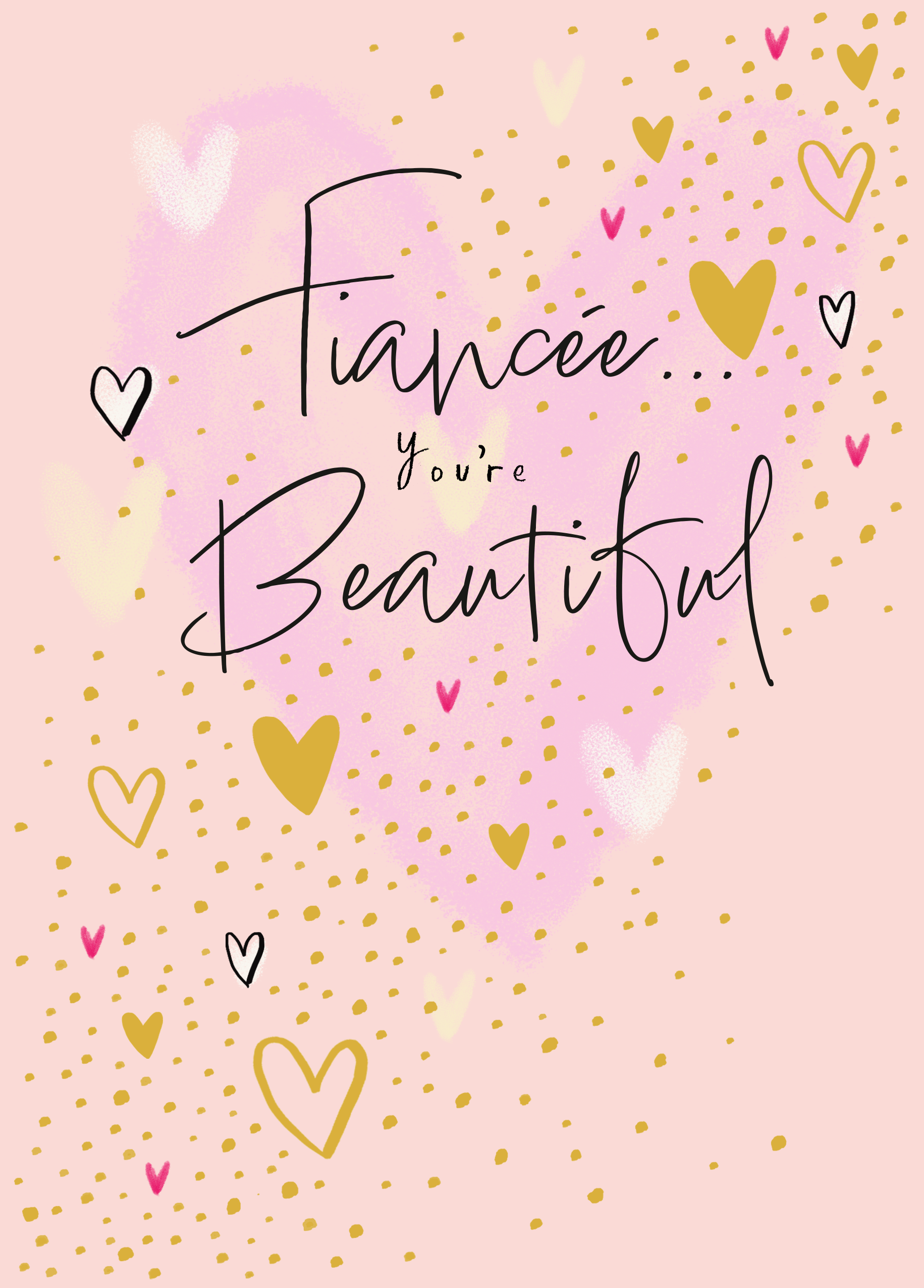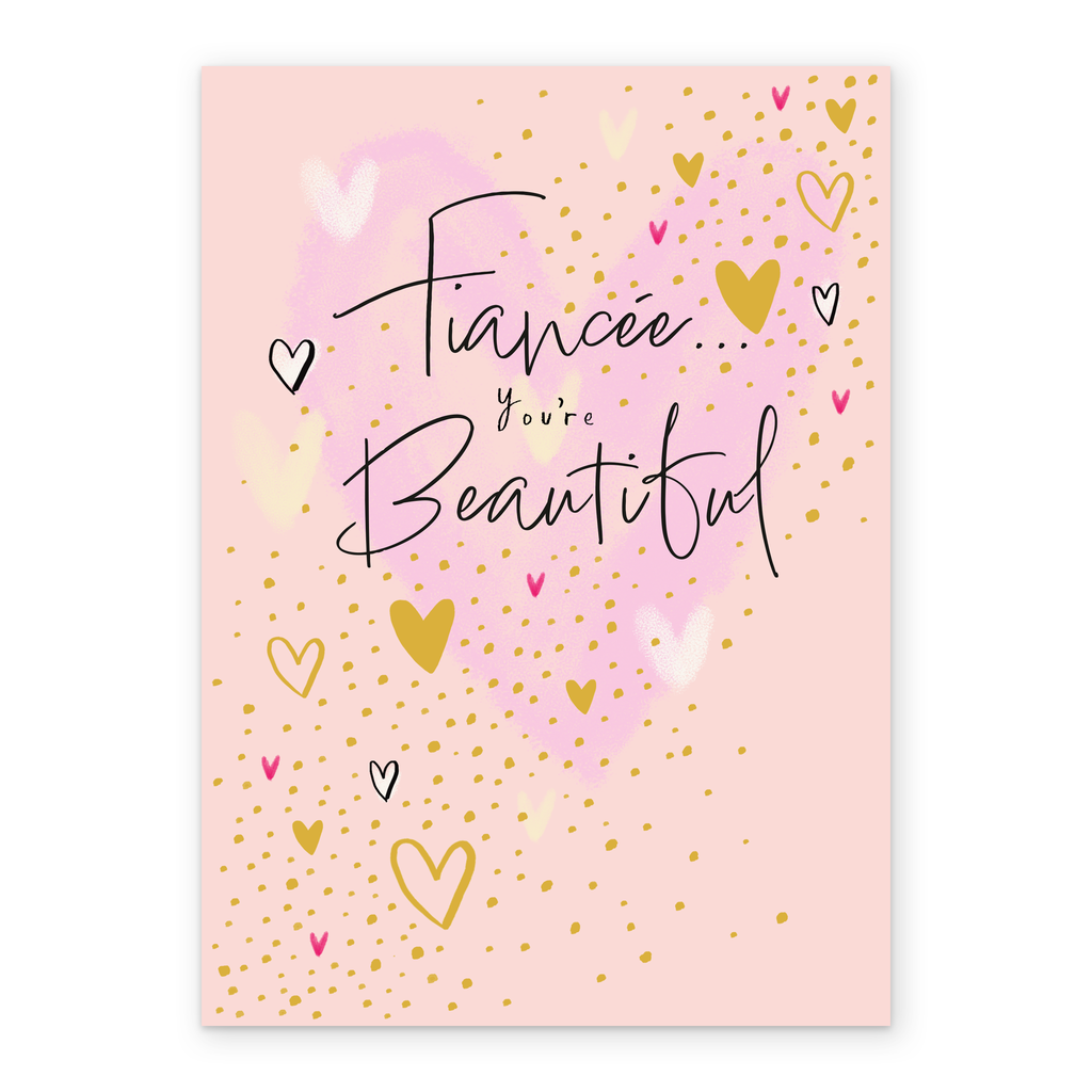 Printed on premium-quality board, this card features a pink background with hearts and gold coloured specks, with the message 'Fiancée... You're Beautiful', and comes complete with a co-ordinating white envelope.
