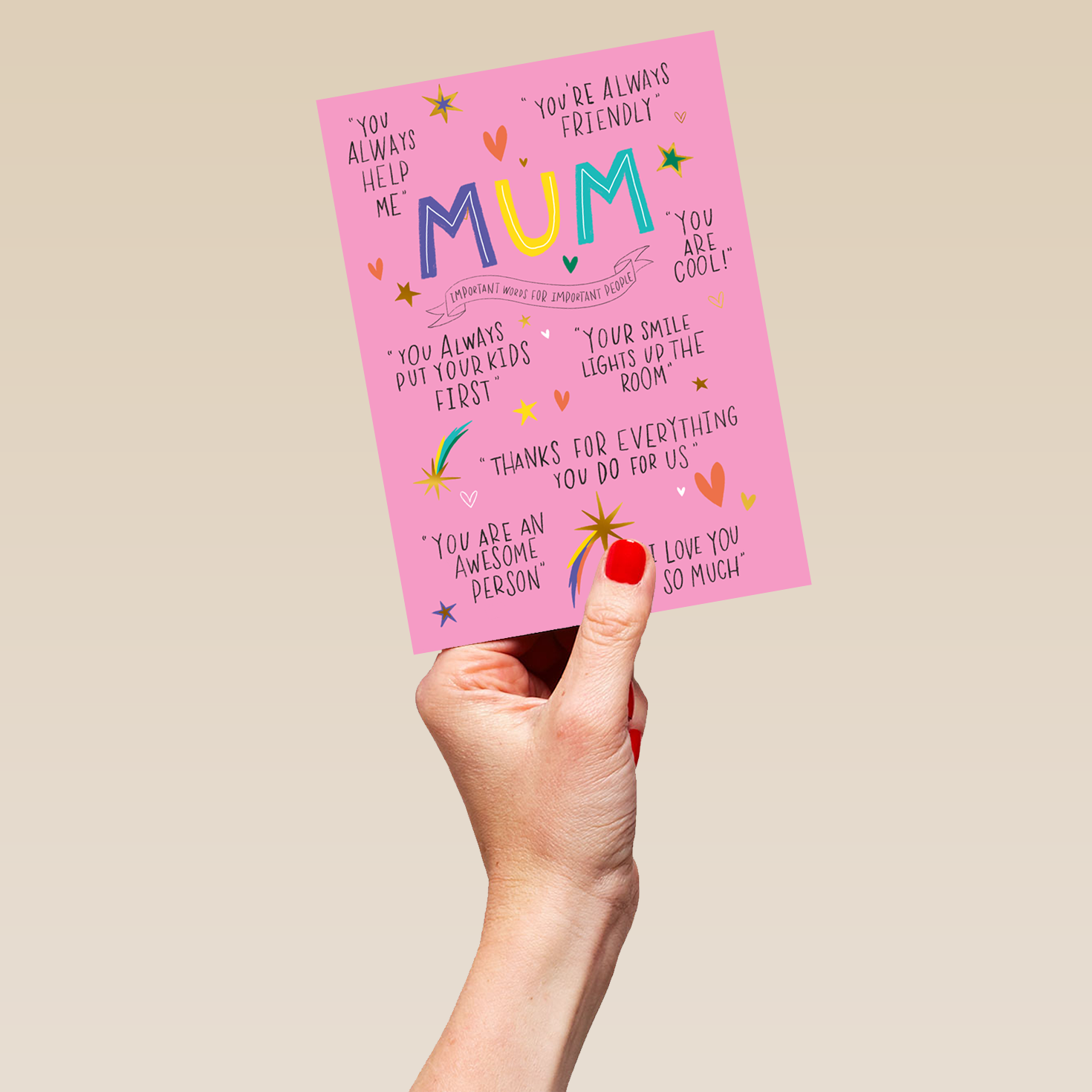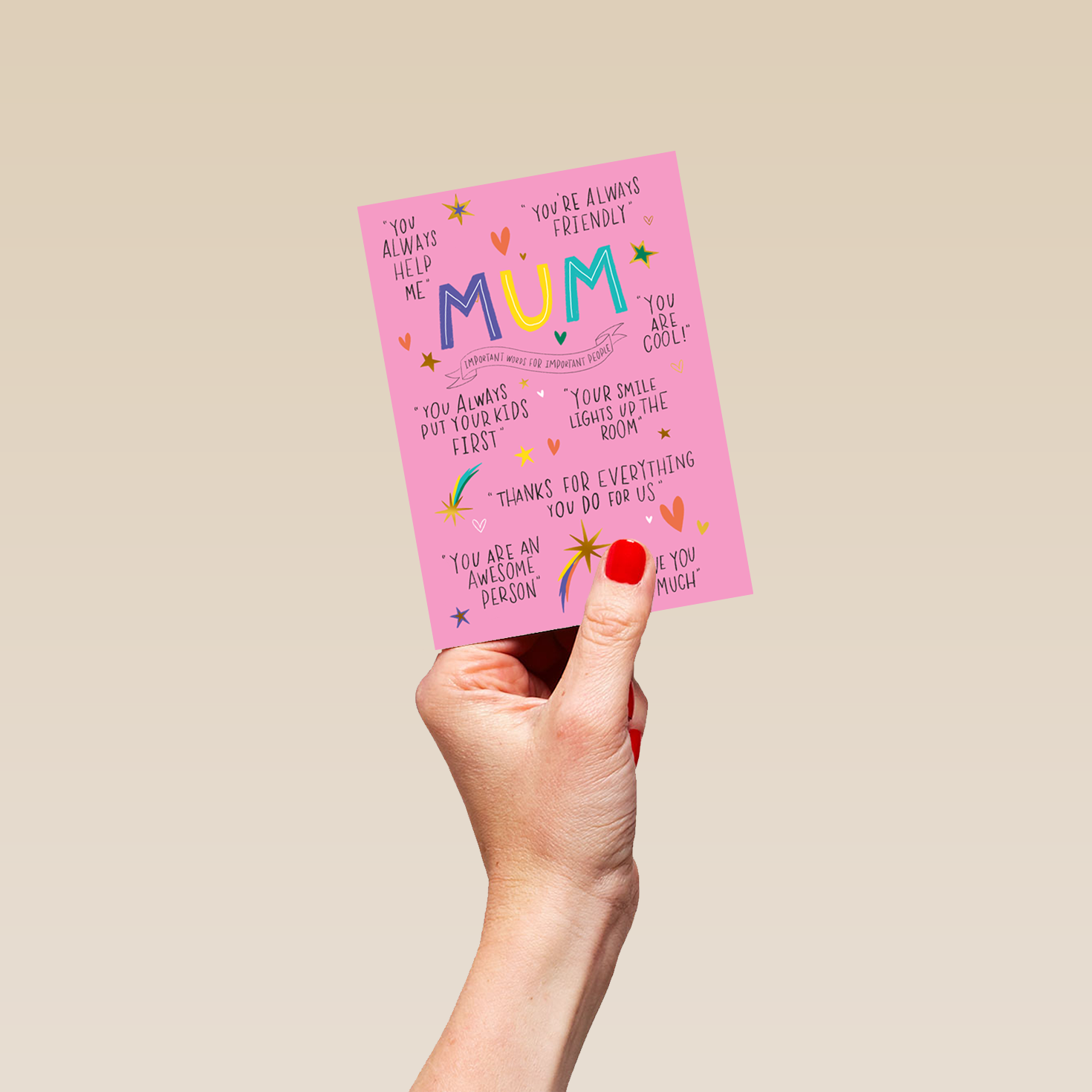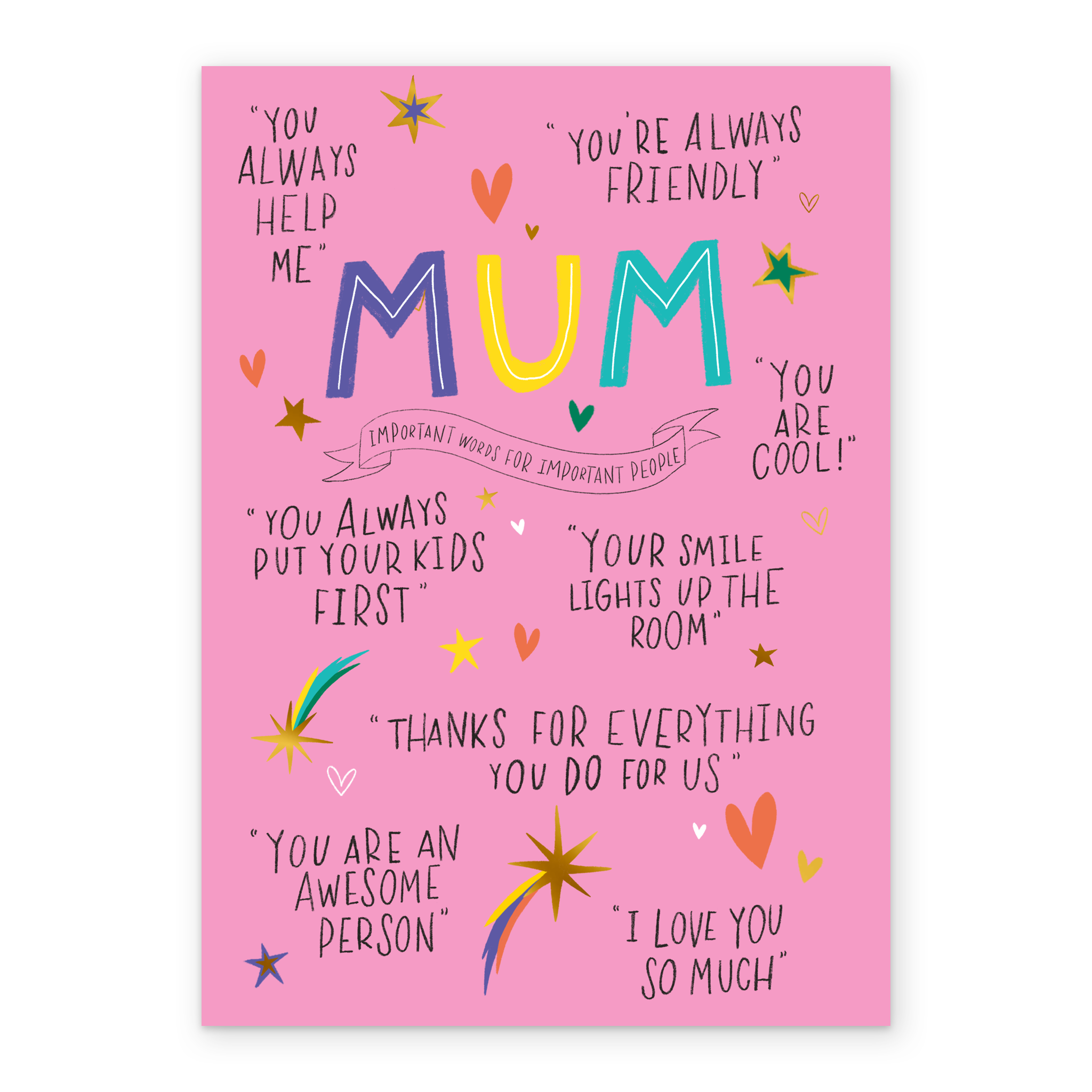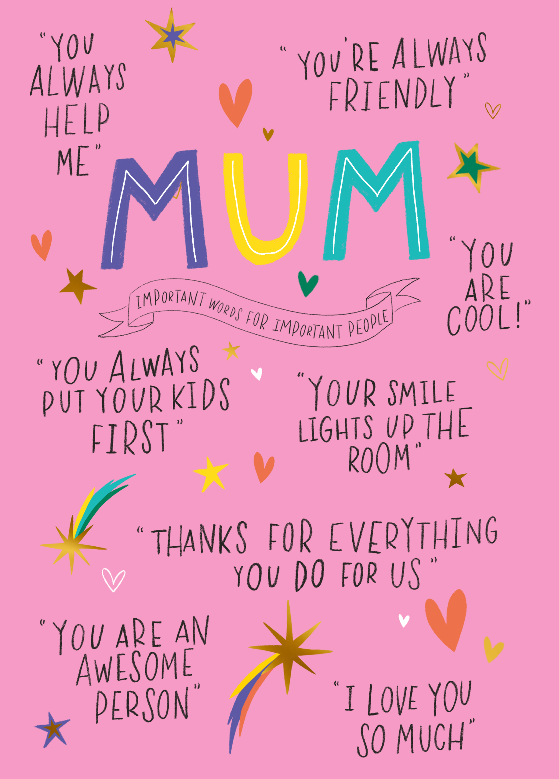 Printed on premium-quality board, this card features a pink background with stars and hearts, with the message 'Mum Important words for important people. 'You always help me' 'You're always friendly' 'You always put your kids first' 'Your smile lights up the room' 'Thanks for everything you do for us' 'You are an awesome person' 'I love you so much', and comes complete with a co-ordinating white envelope.
