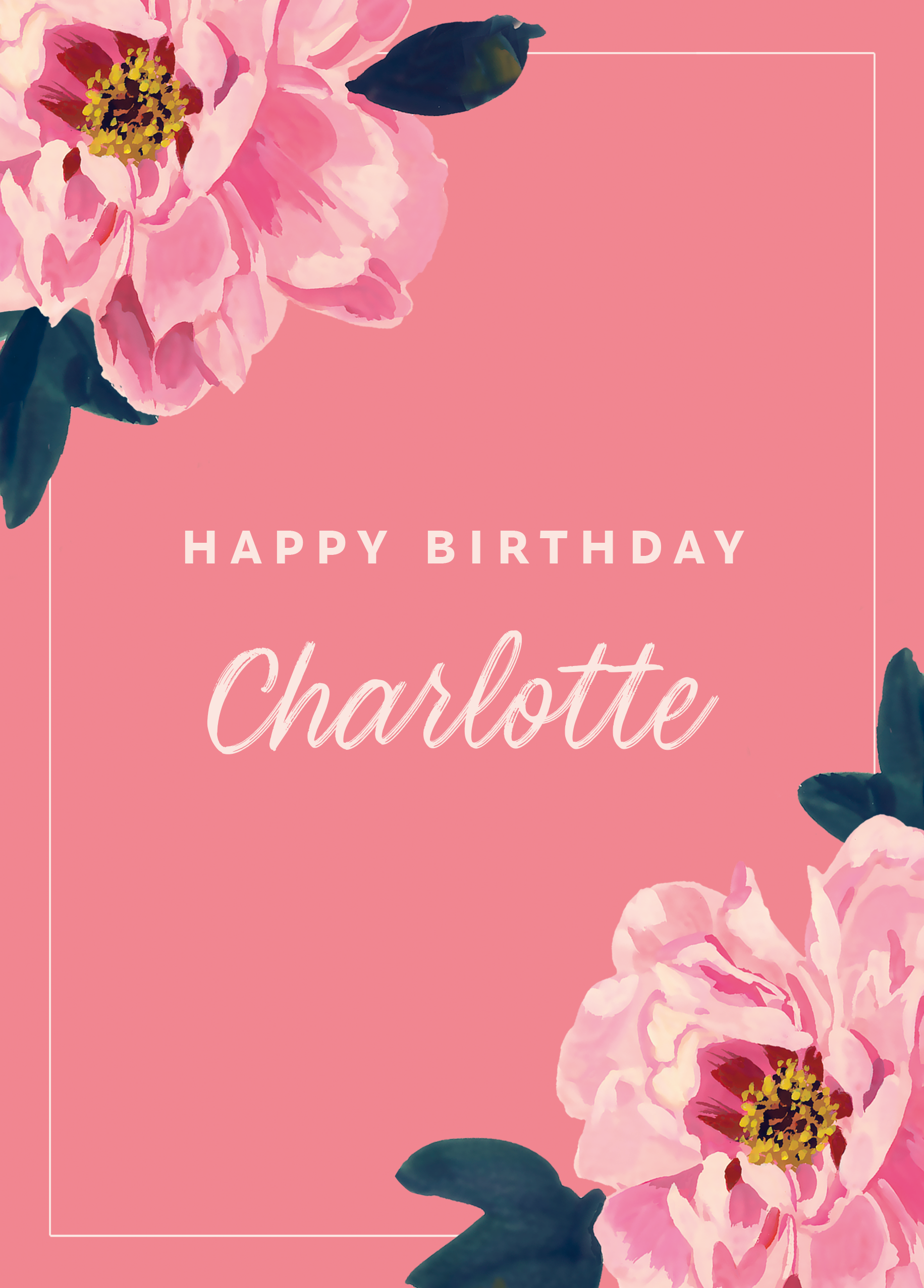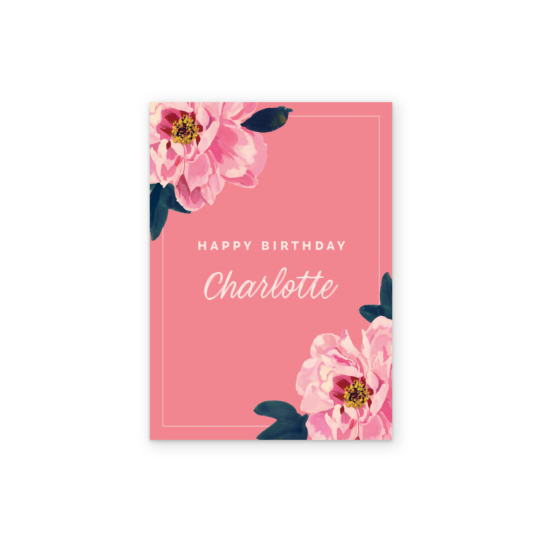 Printed on premium-quality board, this card features a bold pink background with beautifully illustrated pink peonies, in the top left and bottom right corners, and white lettering , with the message 'Happy Birthday [NAME]', space to personalise a name, and comes complete with a co-ordinating white envelope.