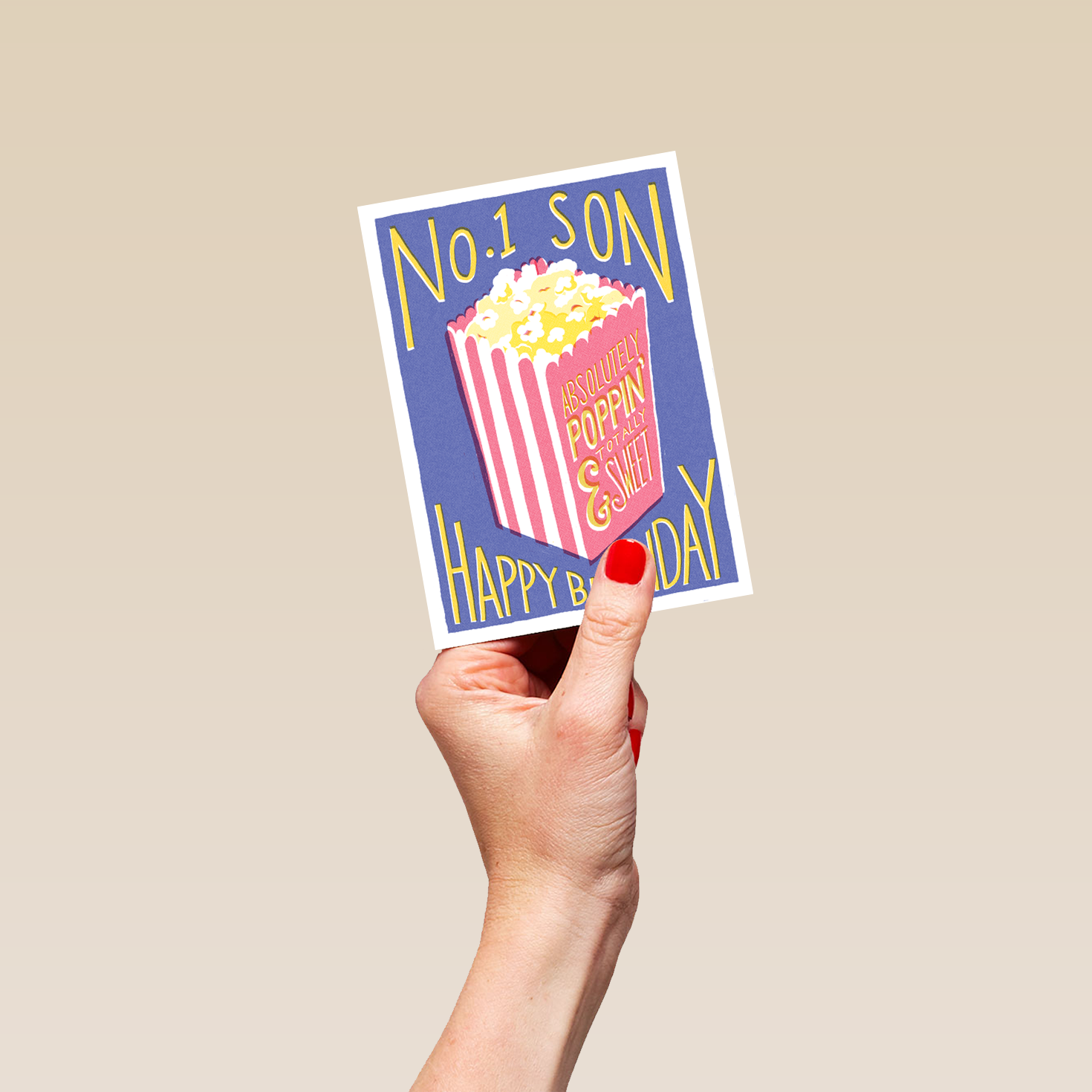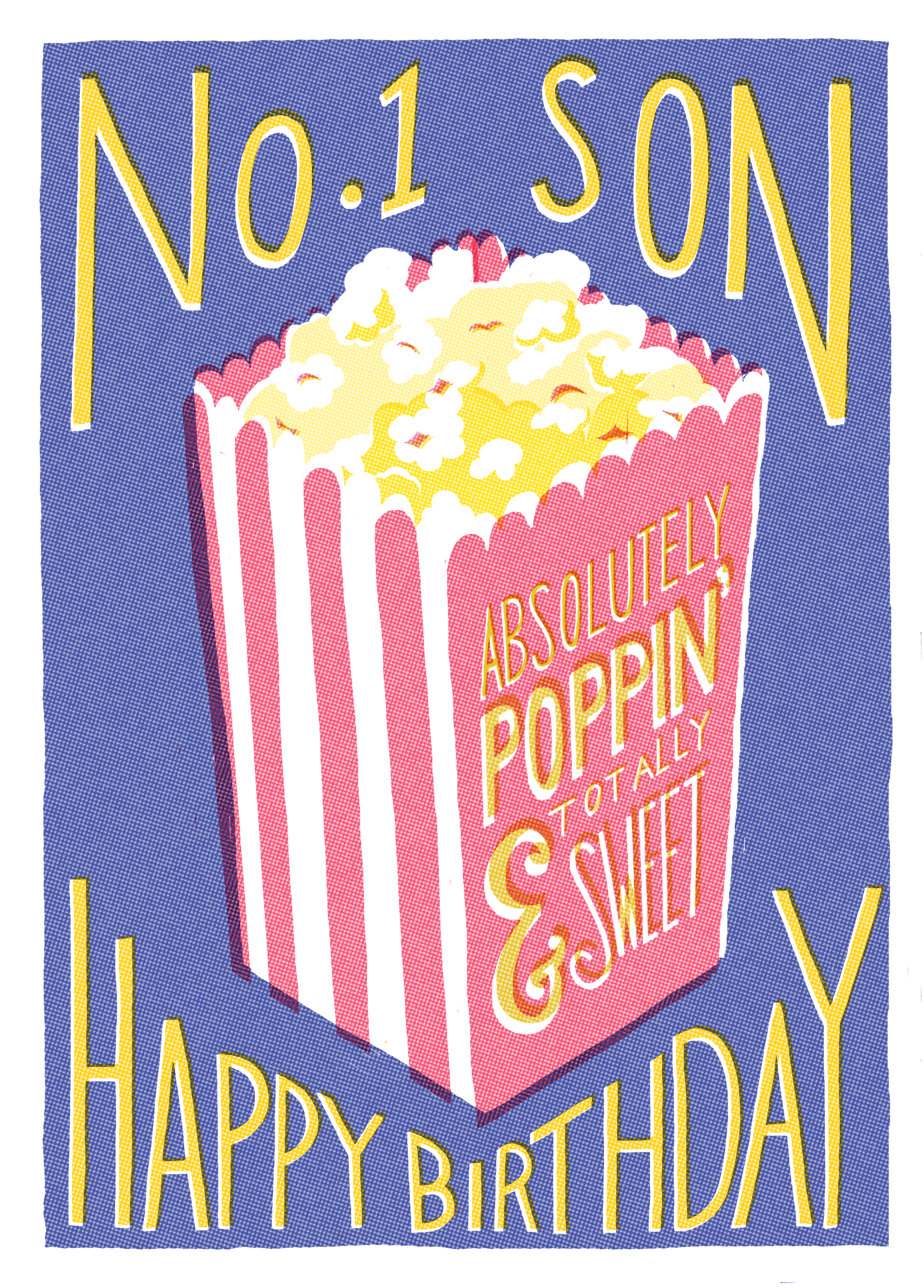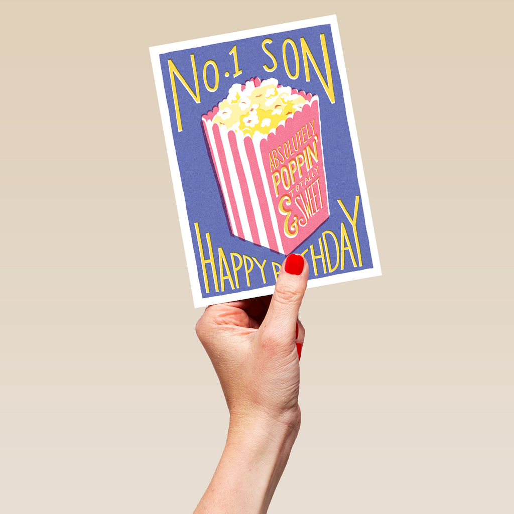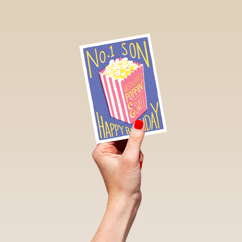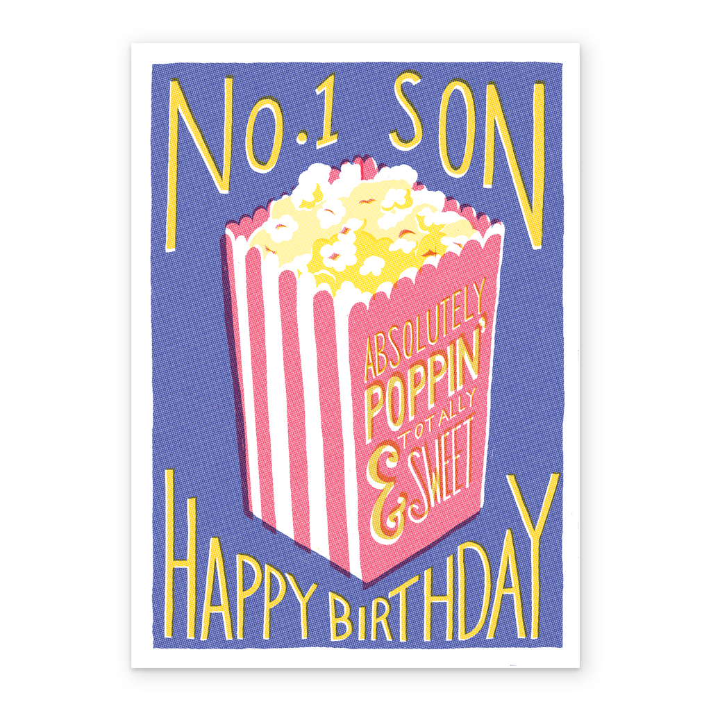 Printed on premium-quality board, this card features a retro and vintage print style with popcorn bucket illustration, with the message 'No. 1 Son, Happy Birthday', and comes complete with a co-ordinating white envelope.