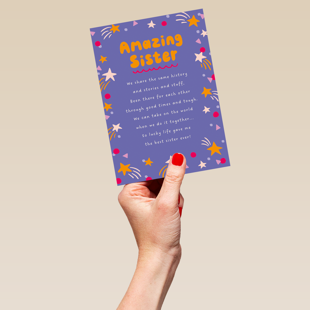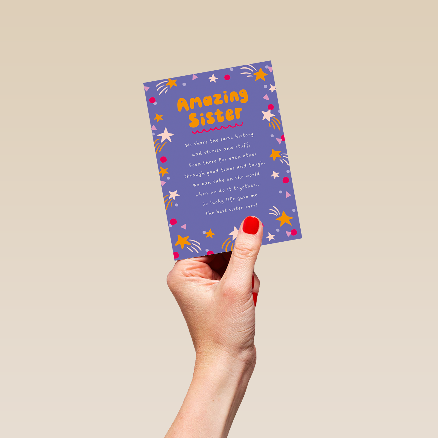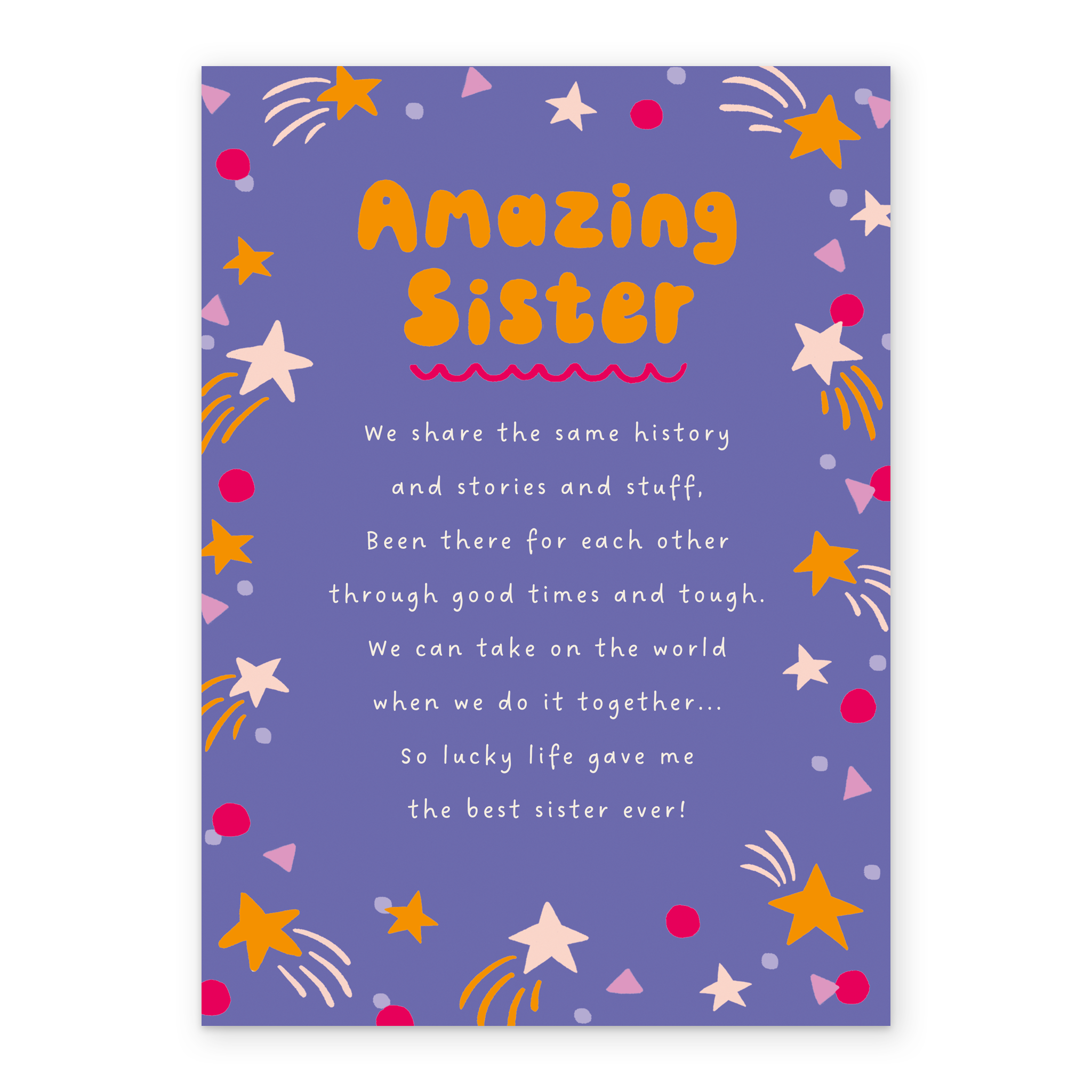 Printed on premium-quality board, this card features a purple background with shooting stars and a heartfelt verse, with the message 'Amazing Sister. We share the same history and stories and stuff, Been there for each other through good times and tough. We can take on the world when we do it together… So lucky life gave me the best sister ever!', and comes complete with a co-ordinating white envelope.