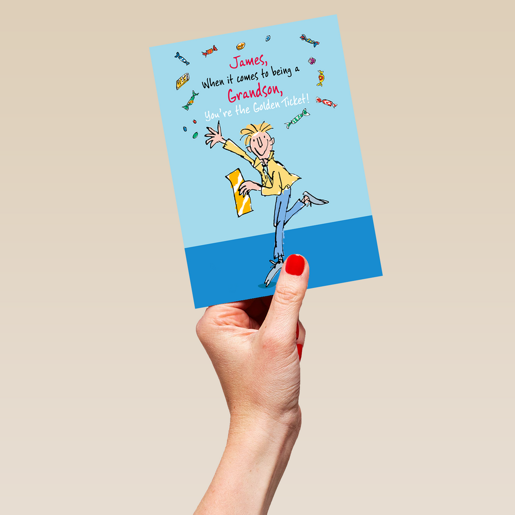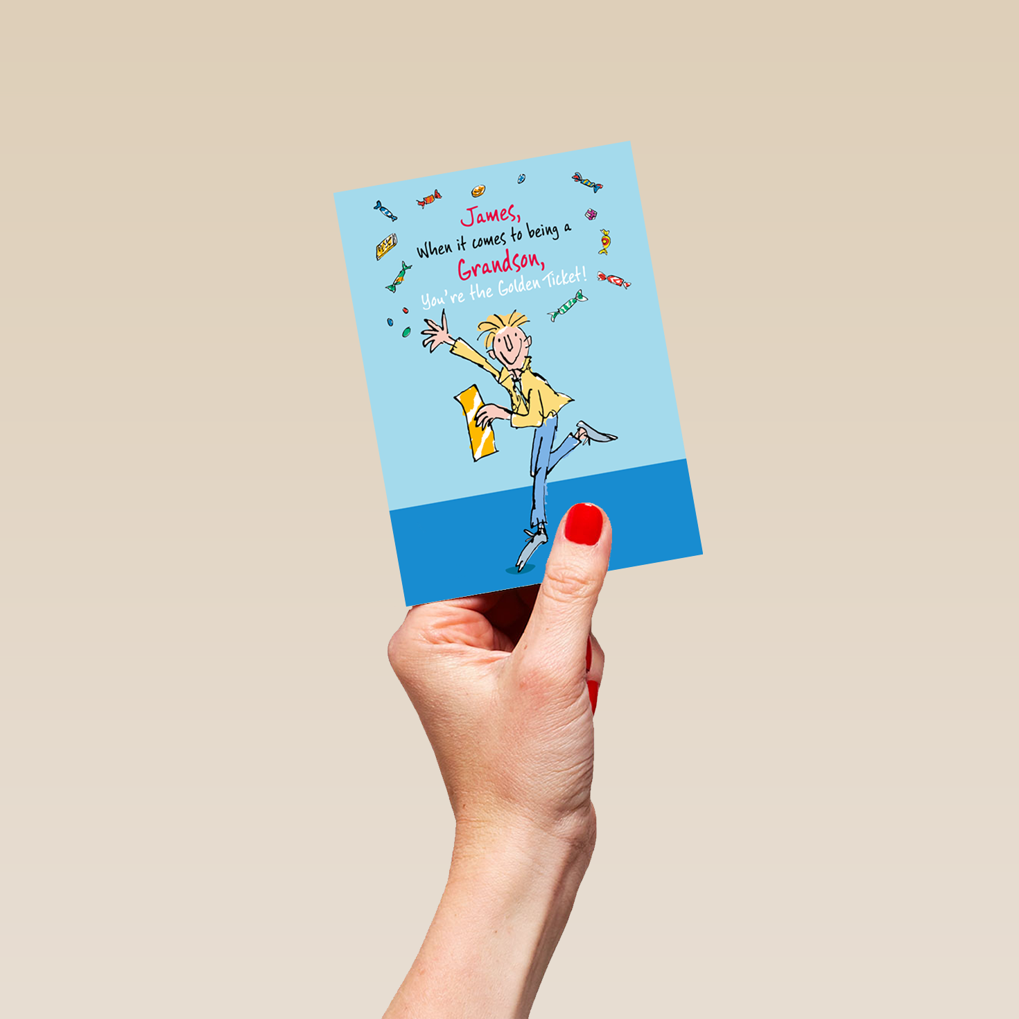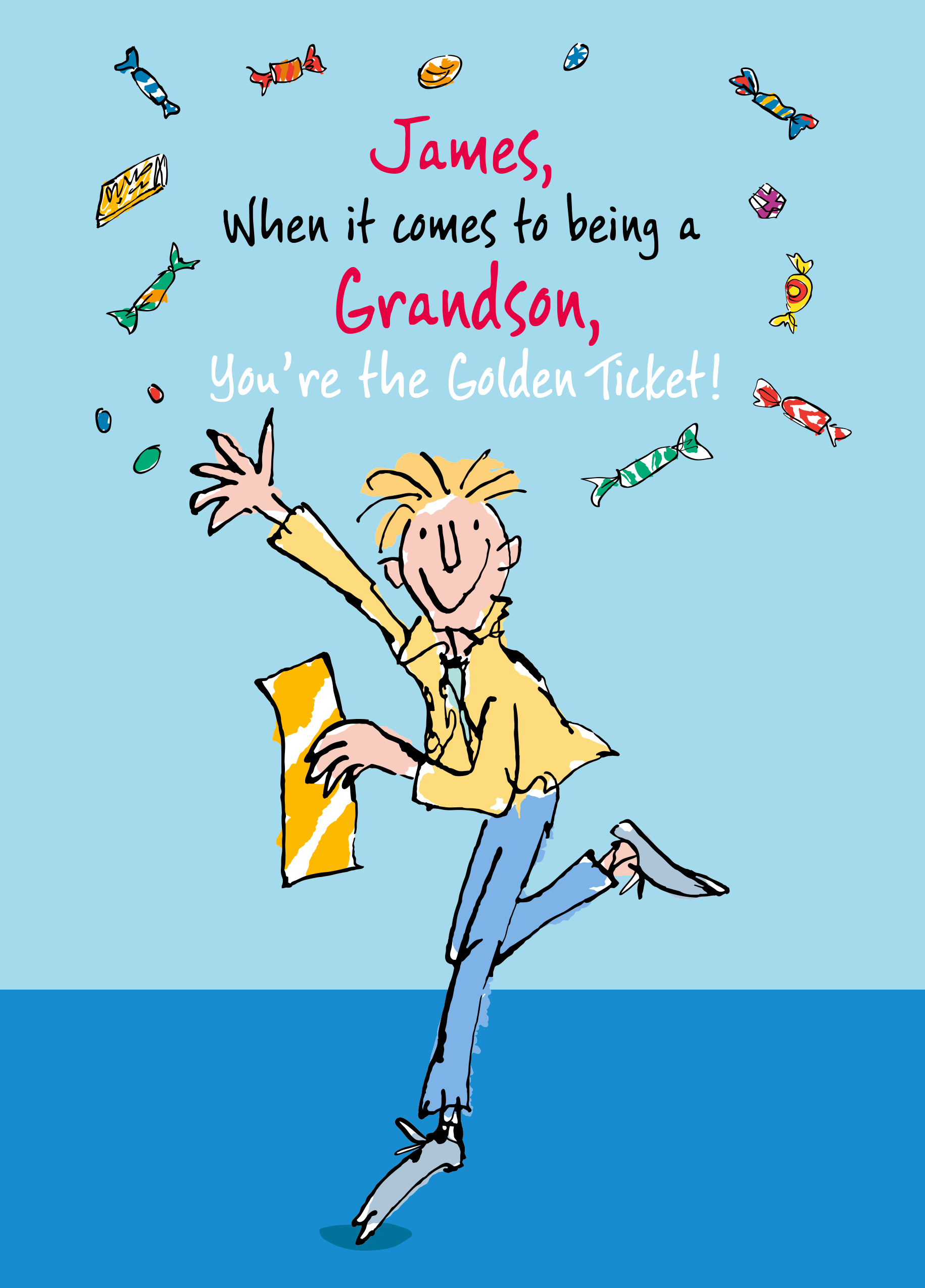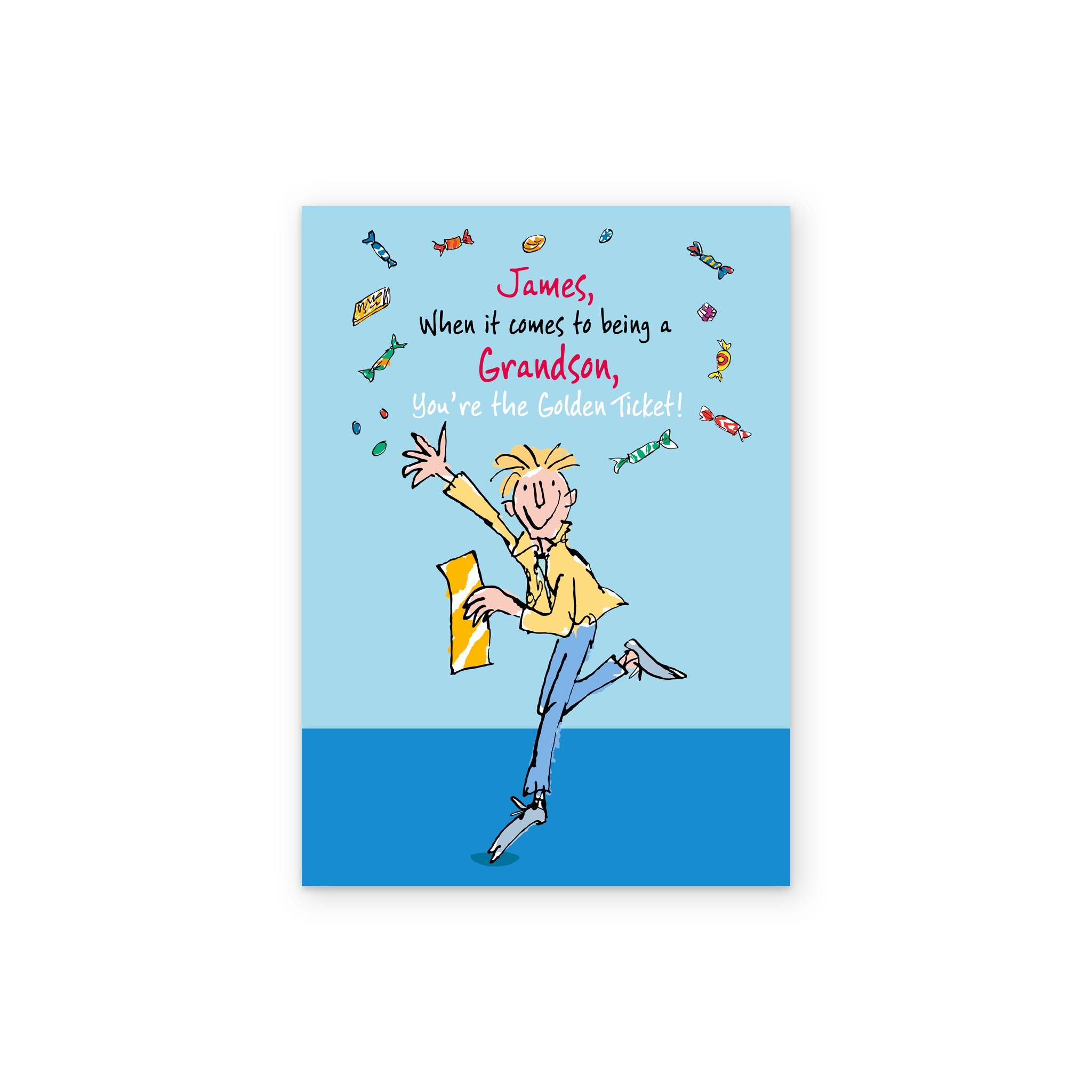 Printed on premium-quality board, this card features a classic illustration of Charlie Bucket and his golden ticket against a sweet-scattered, blue background with red, black and white lettering, with the message '[NAME], When it comes to being a Grandson, you're the Golden Ticket!', space to personalise a name, and comes complete with a co-ordinating white envelope.