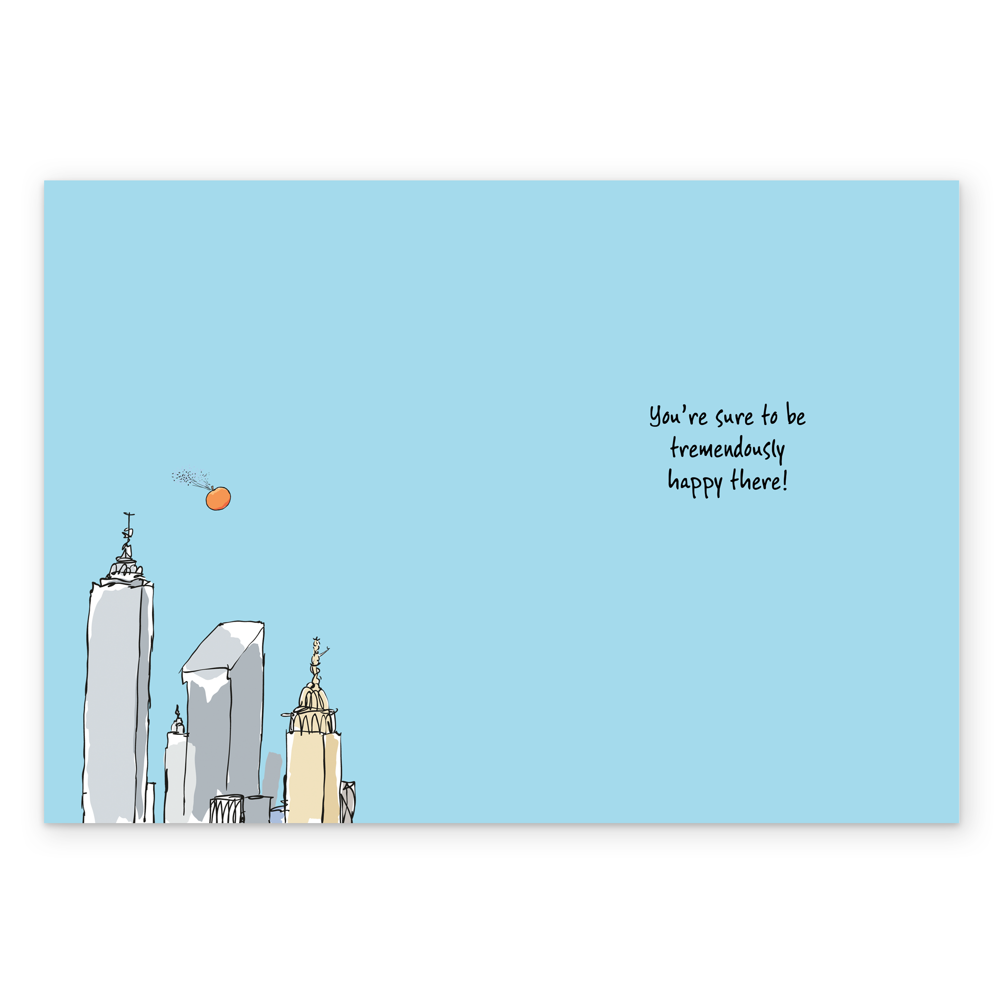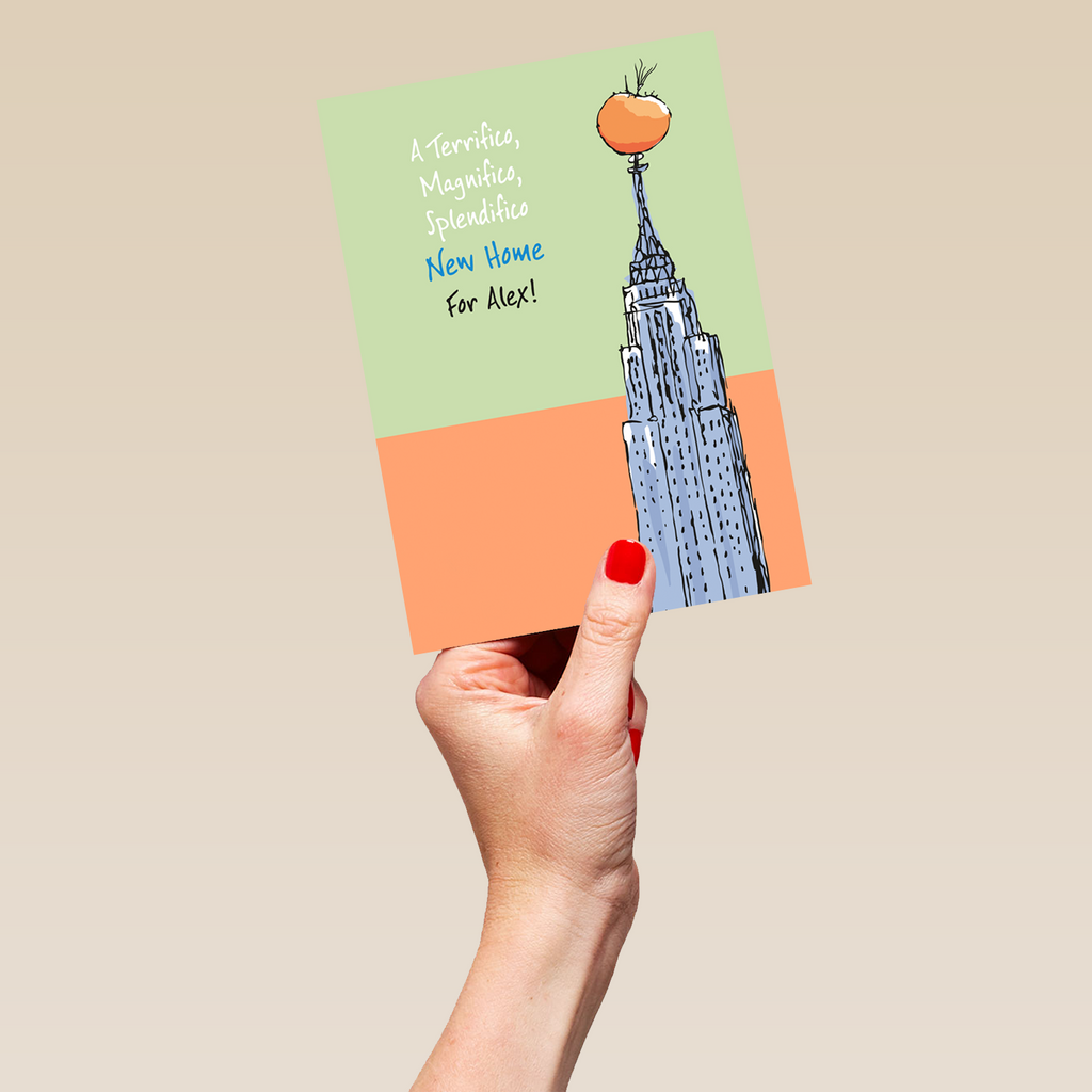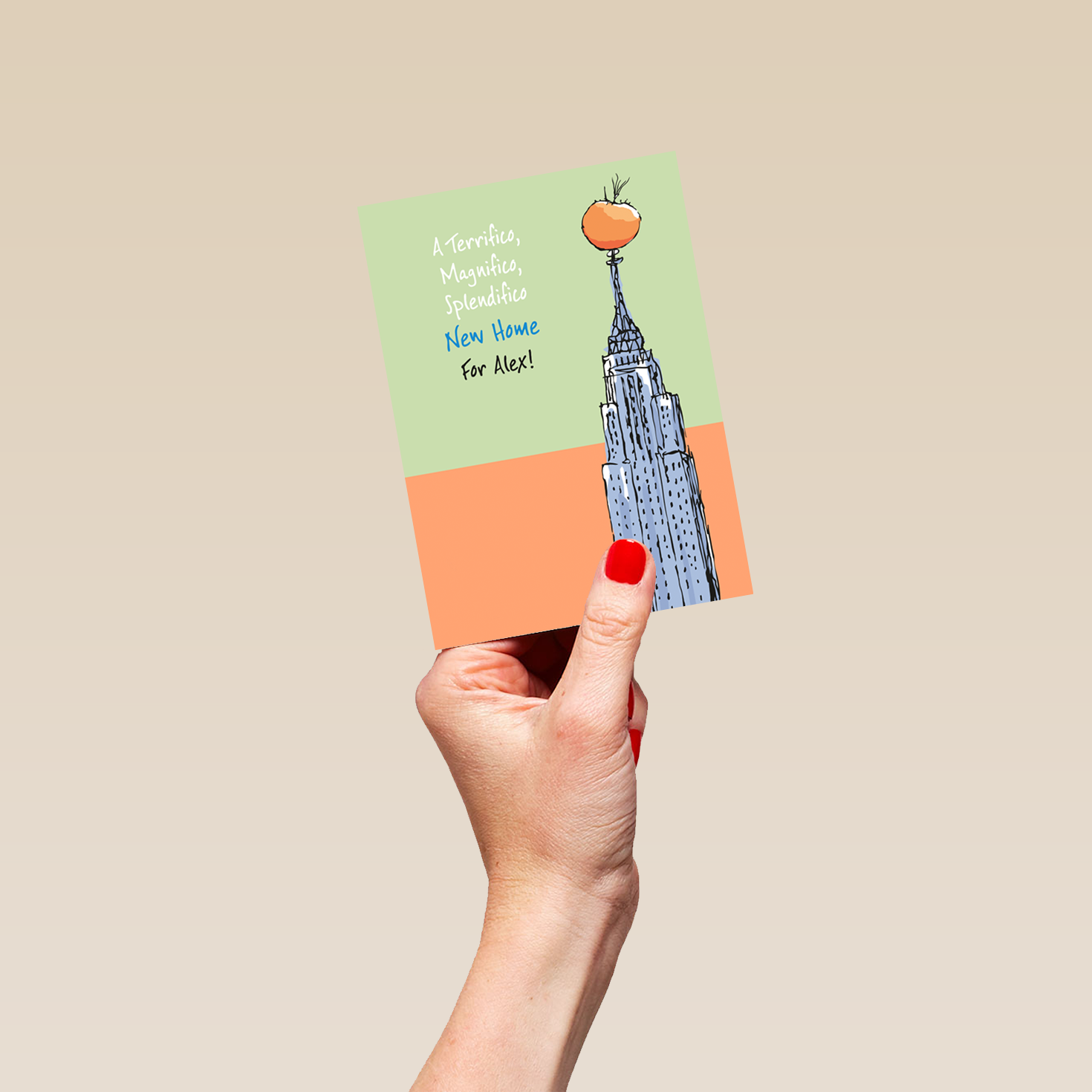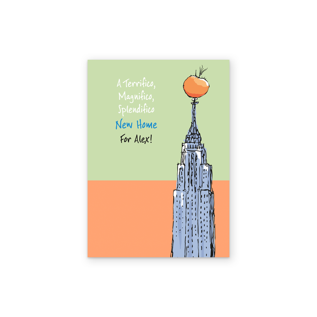 Printed on premium-quality board, this card features a classic illustration of the Giant Peach atop the Empire State Building set against a green and orange background with white, blue and black lettering, with the message 'A Terrifico, Magnifico, Splendifico New Home for [NAME]!', space to personalise a name, and comes complete with a co-ordinating white envelope.