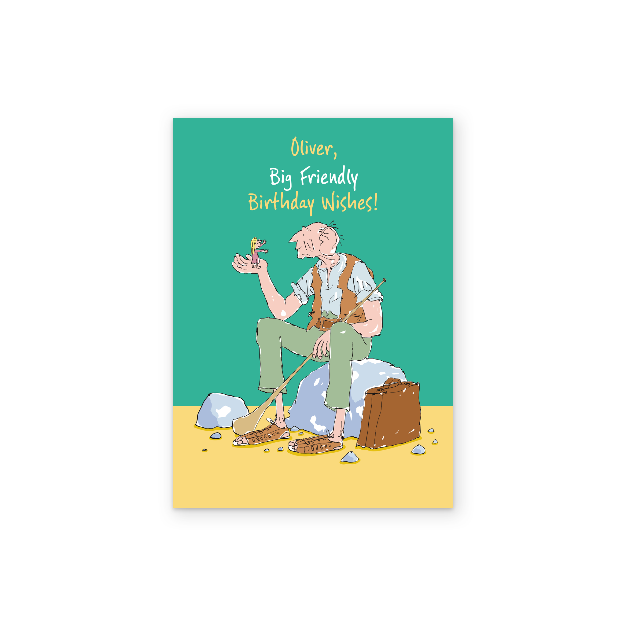 Printed on premium-quality board, this card features a classic illustration of The BFG and Sophie set against a teal green background with yellow and white lettering, with the message '[NAME], Big Friendly Birthday Wishes!', space to personalise a name, and comes complete with a co-ordinating white envelope.