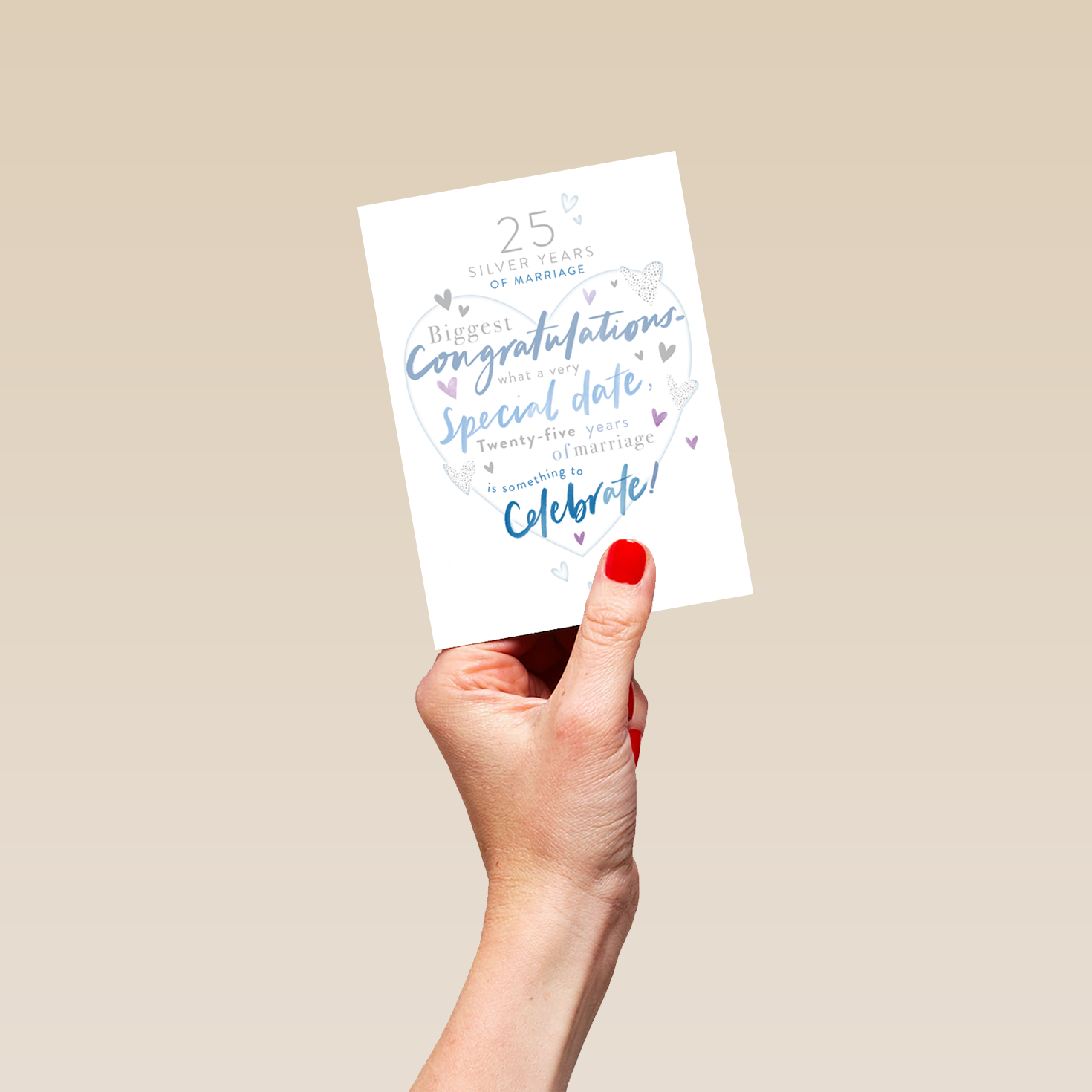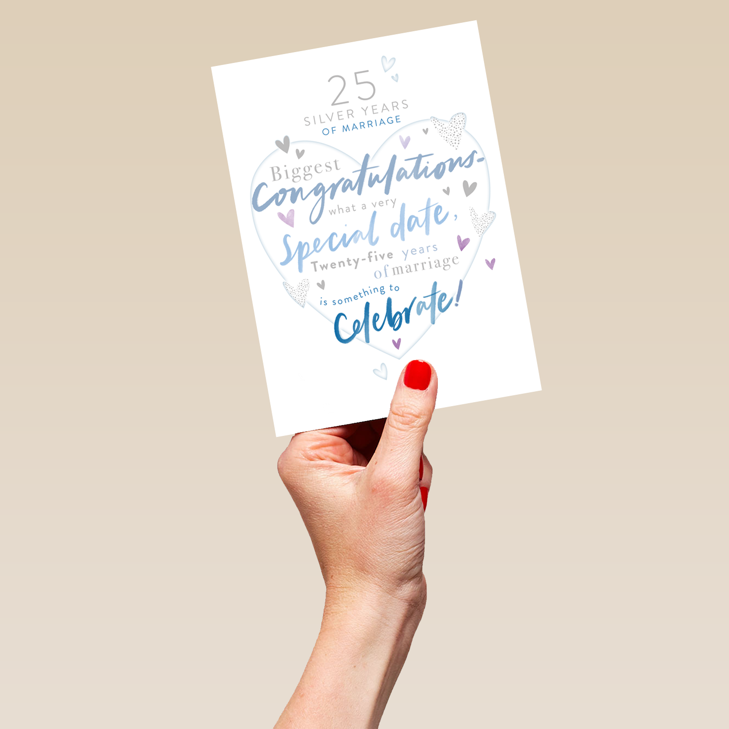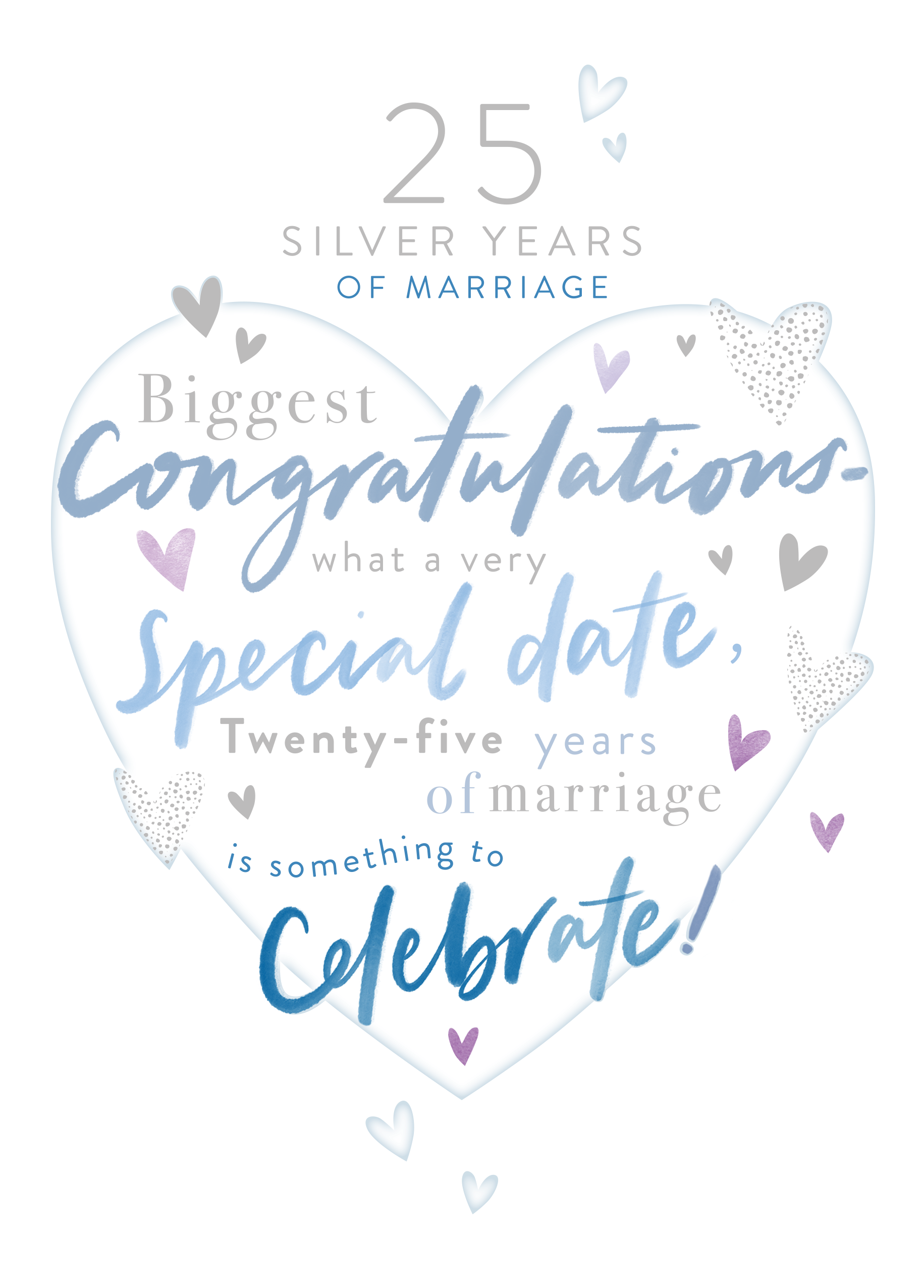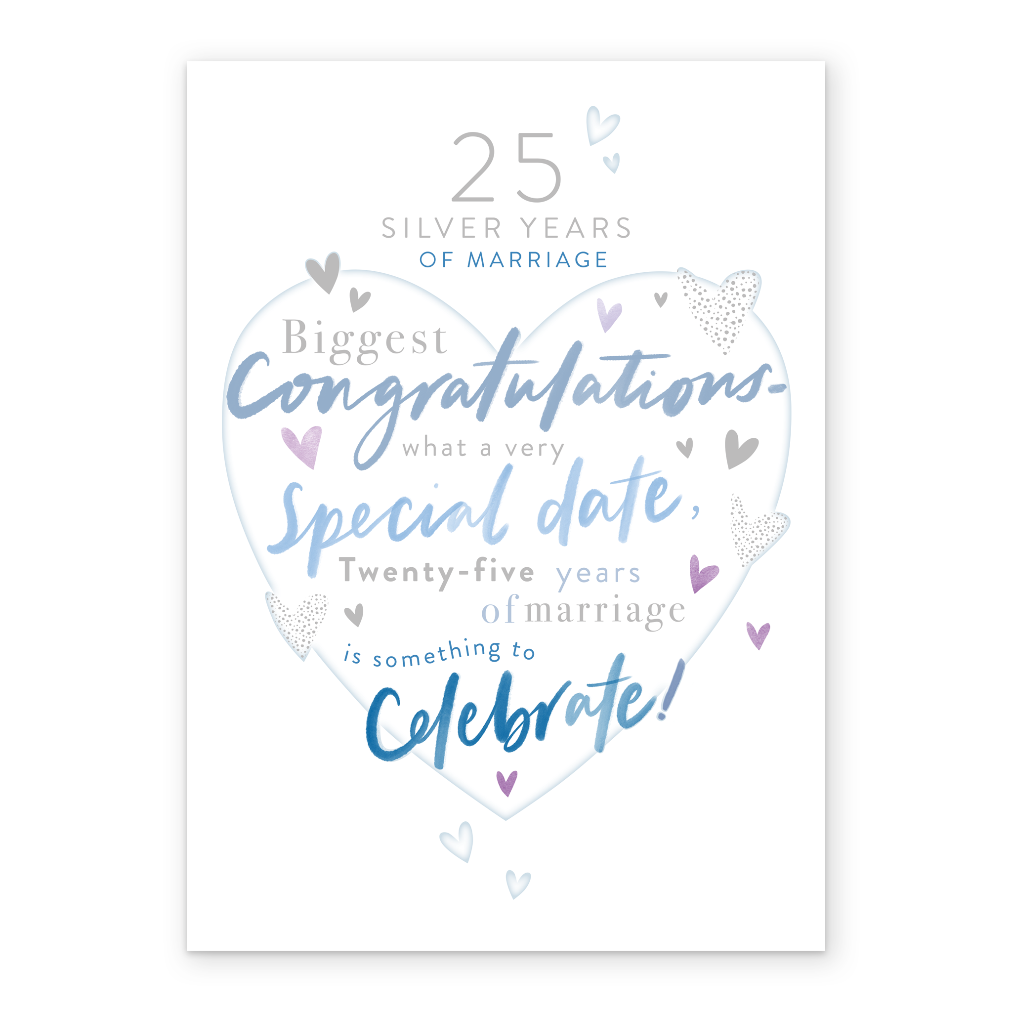 Printed on premium-quality board, this card features a white background with a large silver heart-shape, surrounded by smaller heart shapes, with silver and blue lettering above and filled with silver and blue lettering, with the message '25 Silver Years of Marriage. Biggest congratulations - what a very SPECIAL DATE, Twenty-five years of marriage is something to CELEBRATE!', and comes complete with a co-ordinating white envelope.