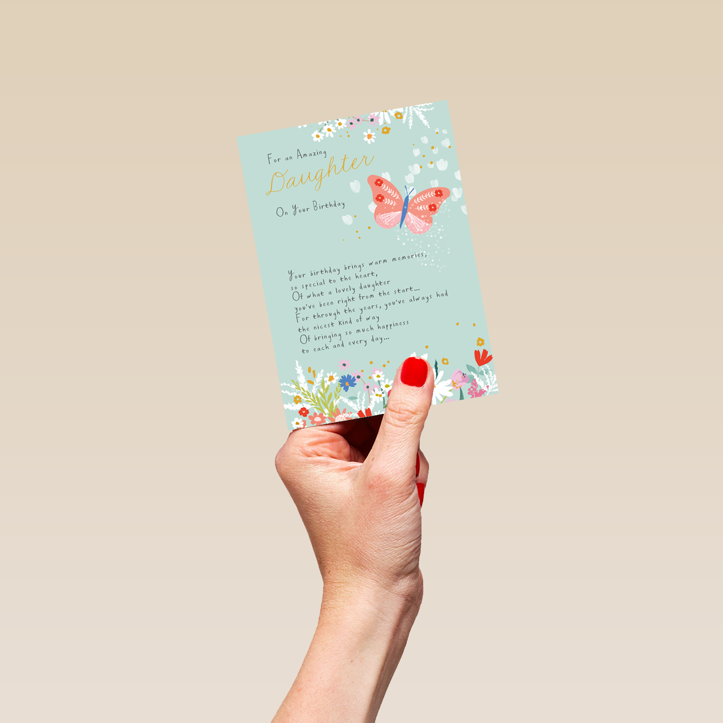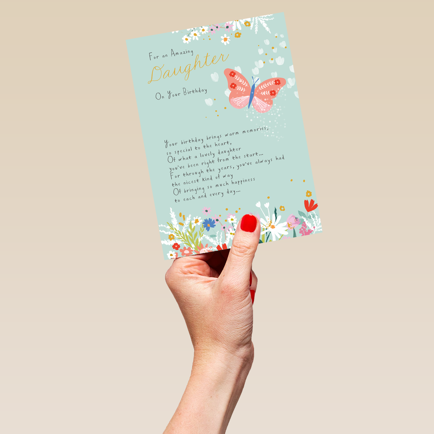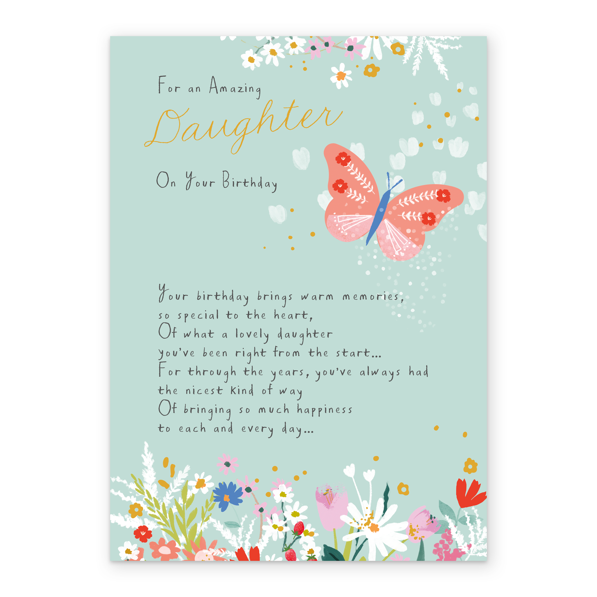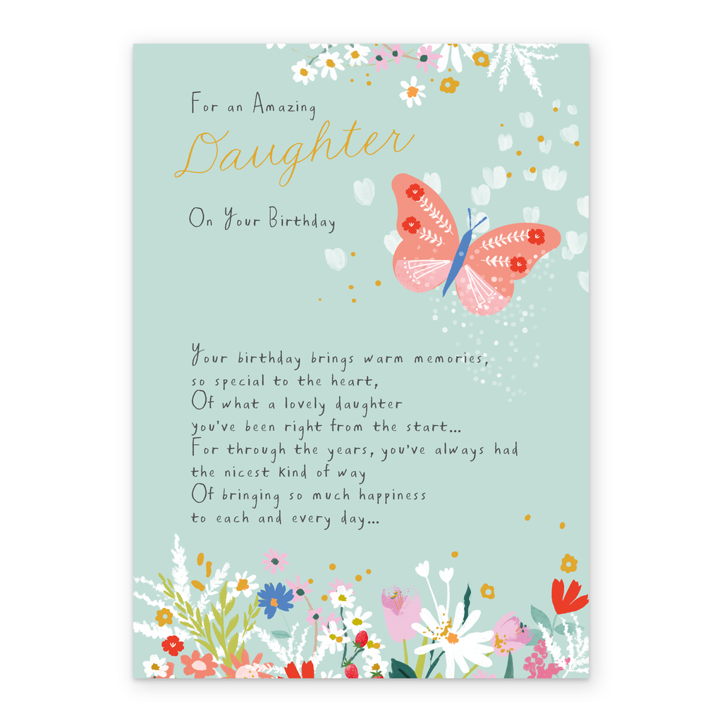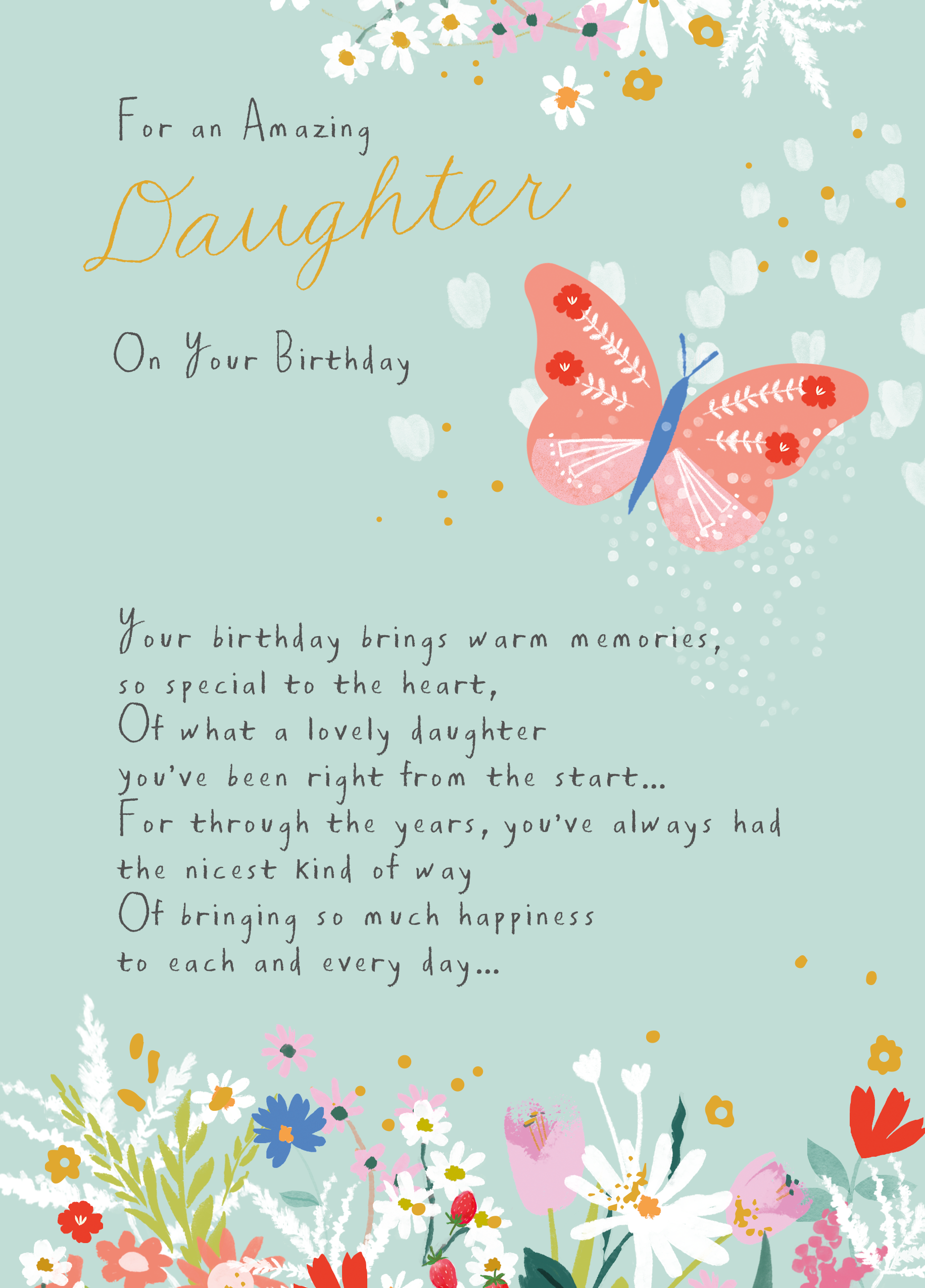 Printed on premium-quality board, this card features a heartfelt poem with illustrations of a butterfly and flowers, with the message 'For an amazing daughter on your birthday Your birthday brings warm memories, so special to the heart. Of what a lovely daughter you've been right from the start… For through the years, you've always had the nicest kind of way Of bringing so much happiness to each and every day...', and comes complete with a co-ordinating white envelope.