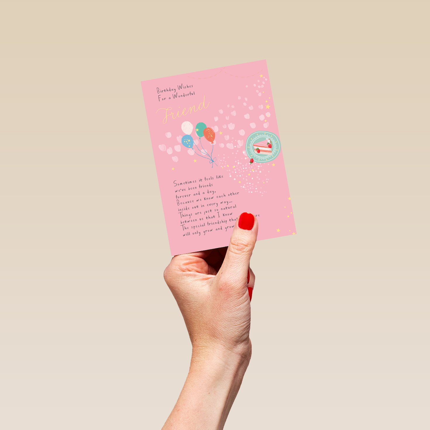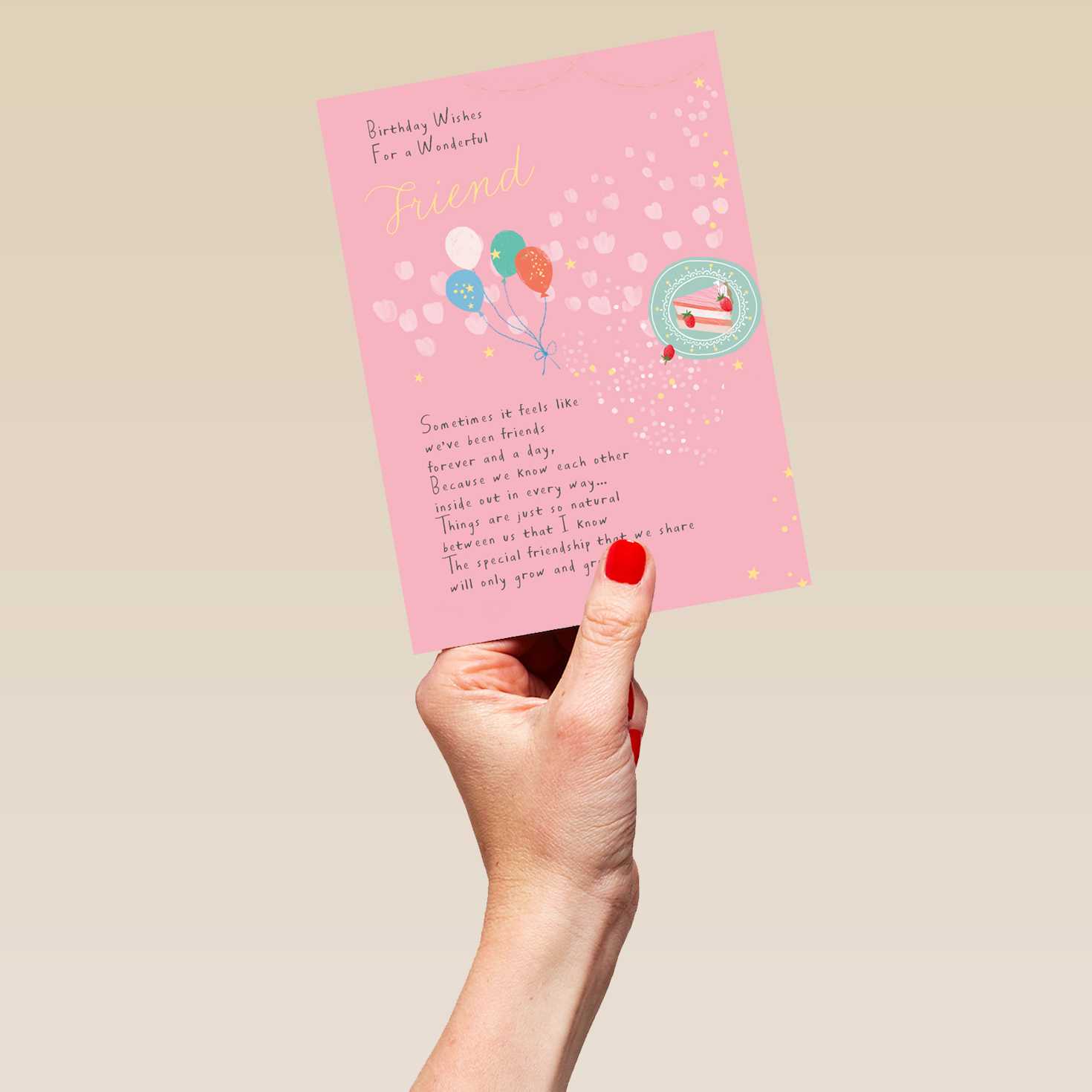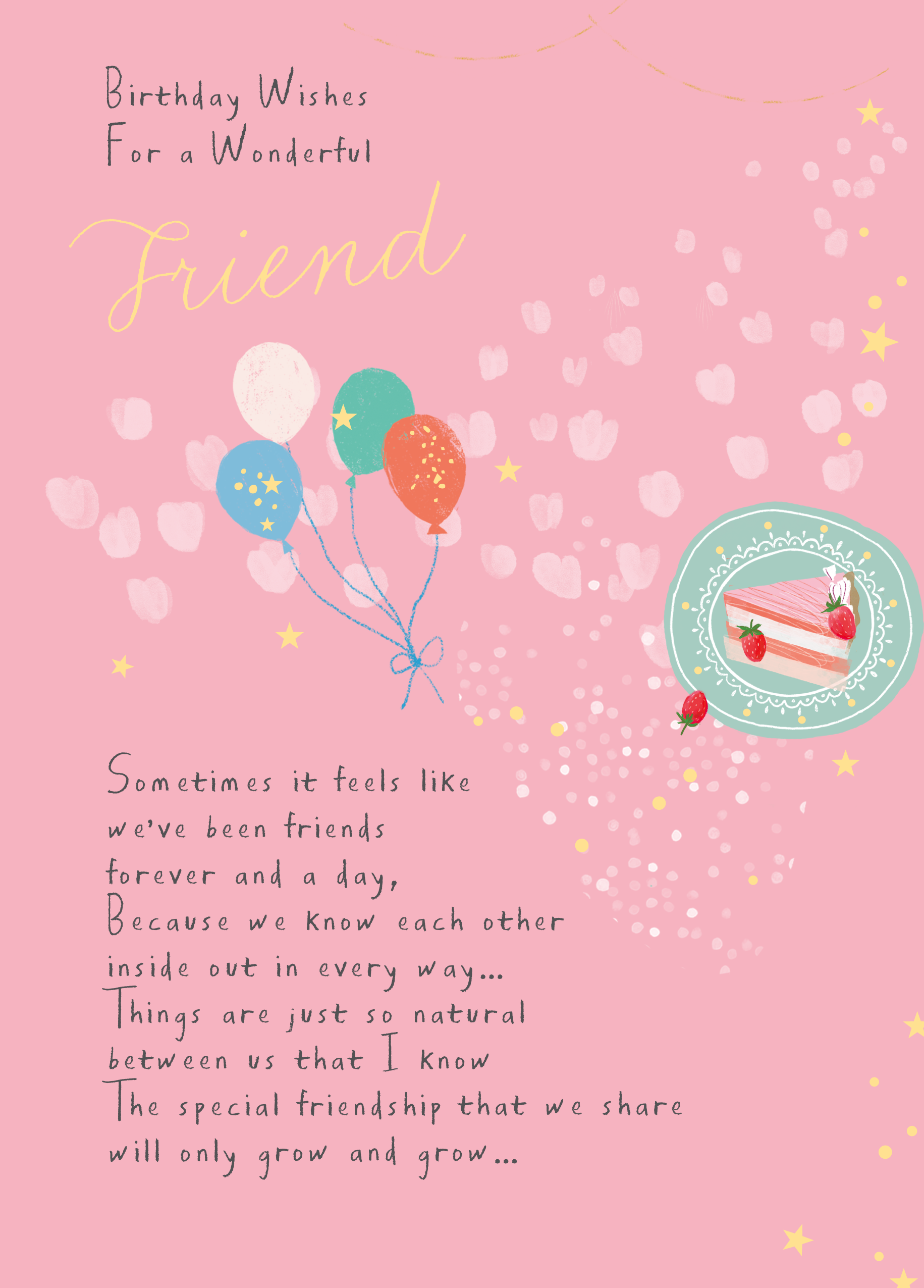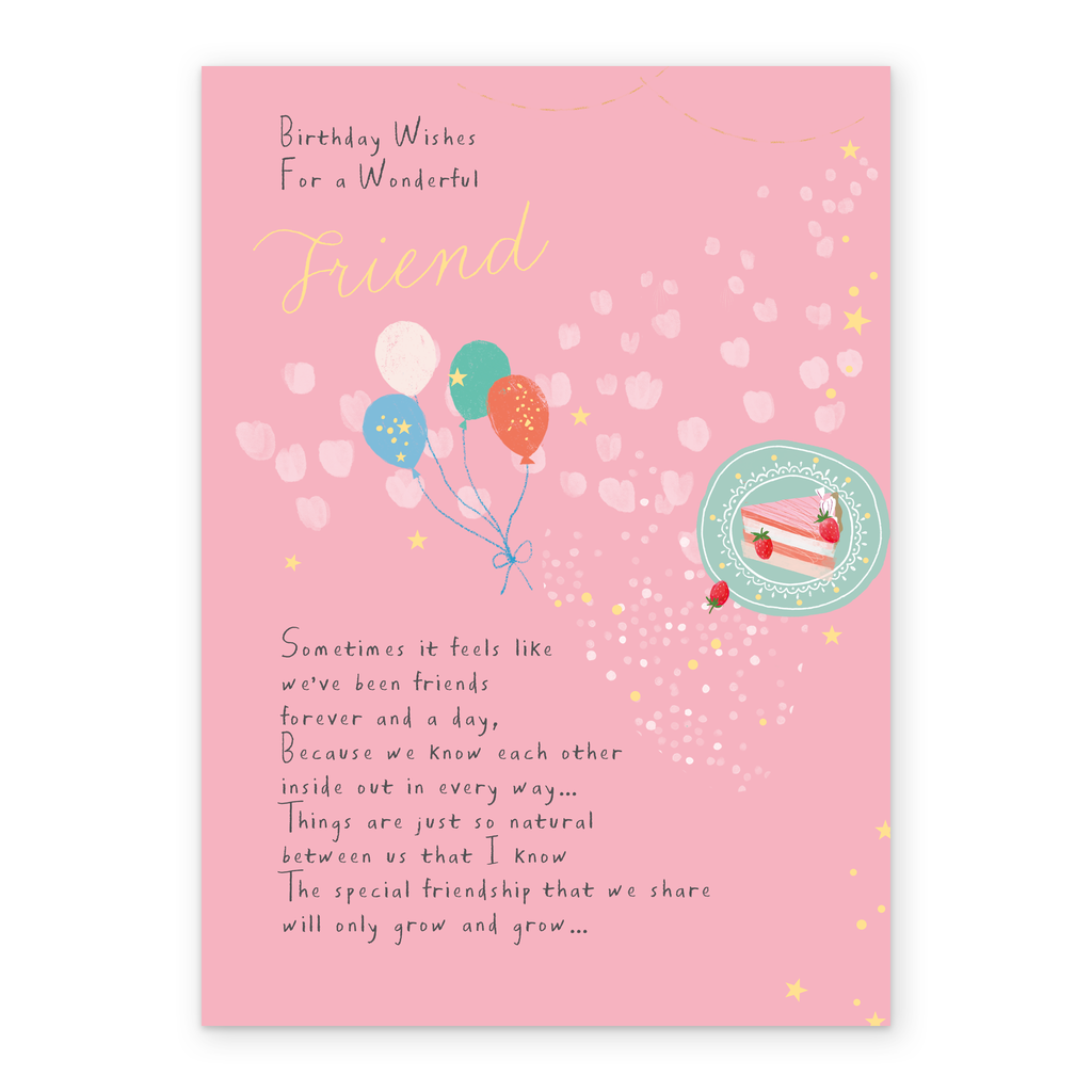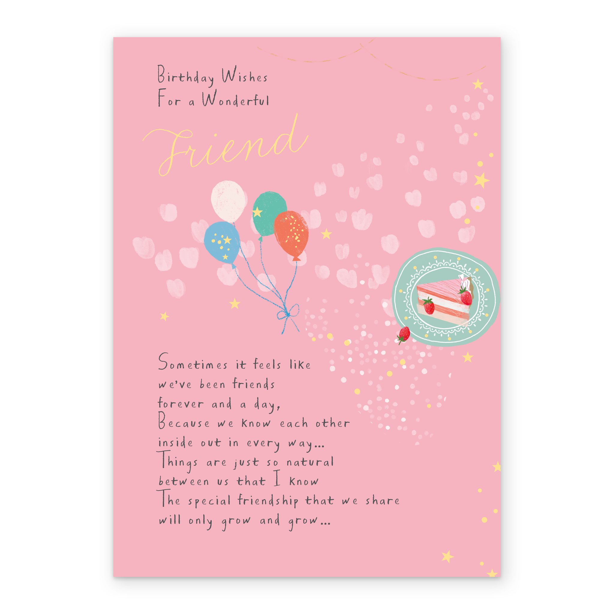 Printed on premium-quality board, this card features a heartfelt poem with an illustration of balloons and a slice of cake, with the message 'Birthday wishes for a wonderful friend Sometimes it feels like we've been friends forever and a day, Because we know each other inside out in every way… Things are just so natural between us that I know The special friendship that we share will only grow and grow...', and comes complete with a co-ordinating white envelope.