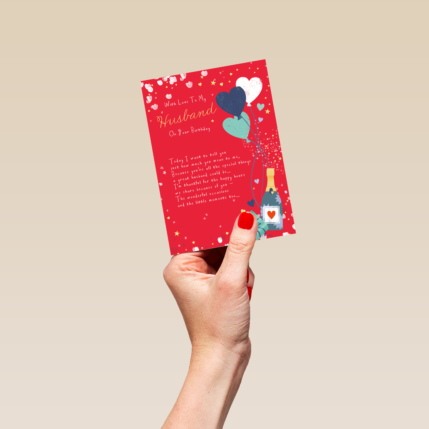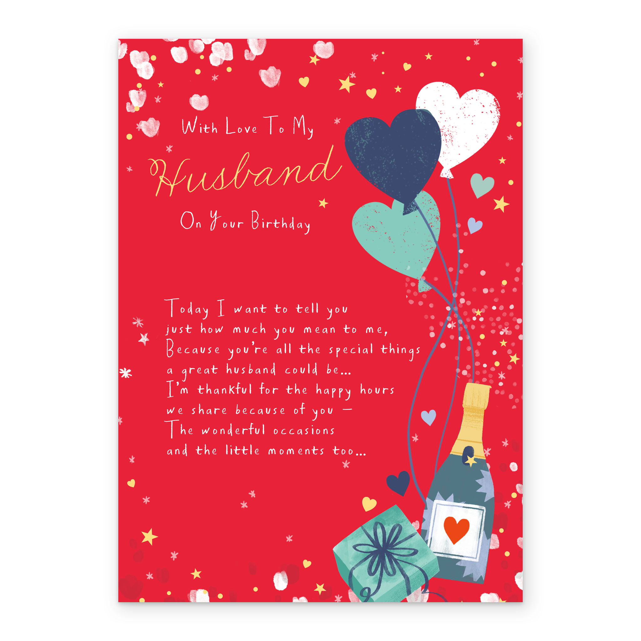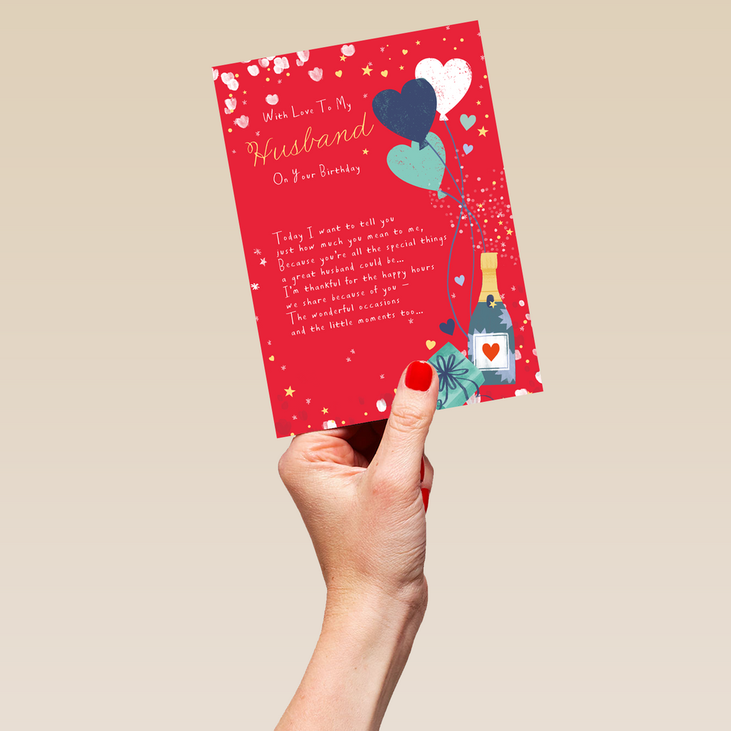 Printed on premium-quality board, this card features a heartfelt poem with an illustration of a champagne bottle, balloons and a present, with the message 'With Love to my husband on your birthday. Today I want to tell you just how much you mean to me, because you're all the special things a great husband could be… I'm thankful for all the happy hours we share because of you - The wonderful occasions and the little moments too...', and comes complete with a co-ordinating white envelope.