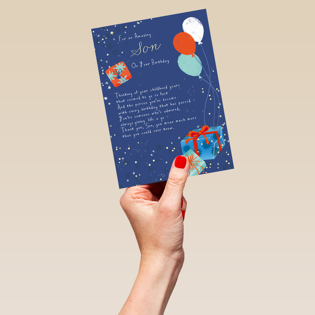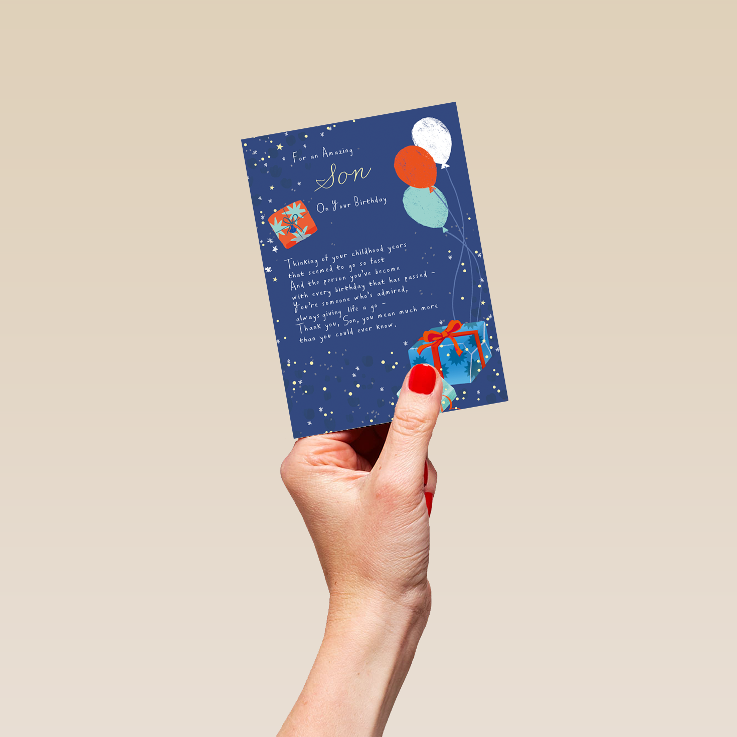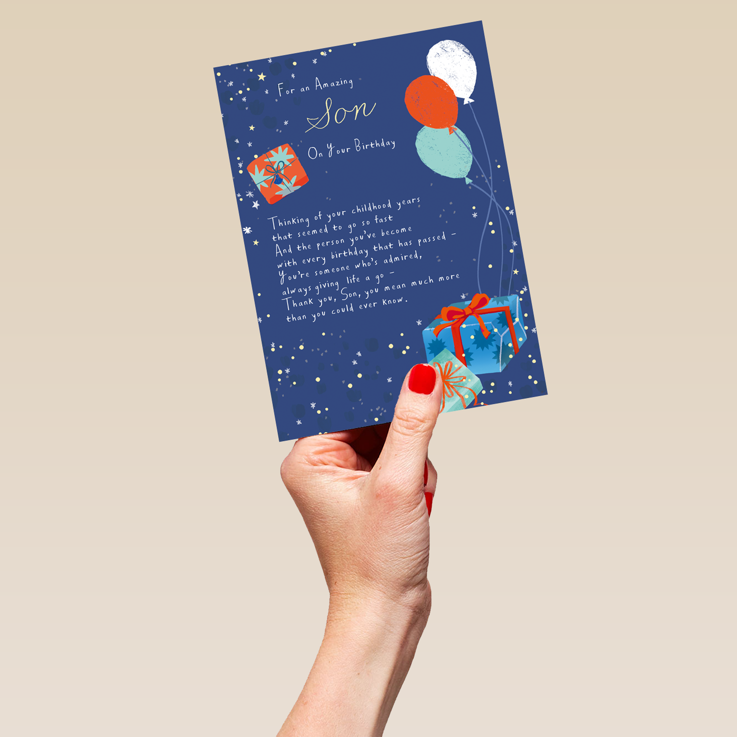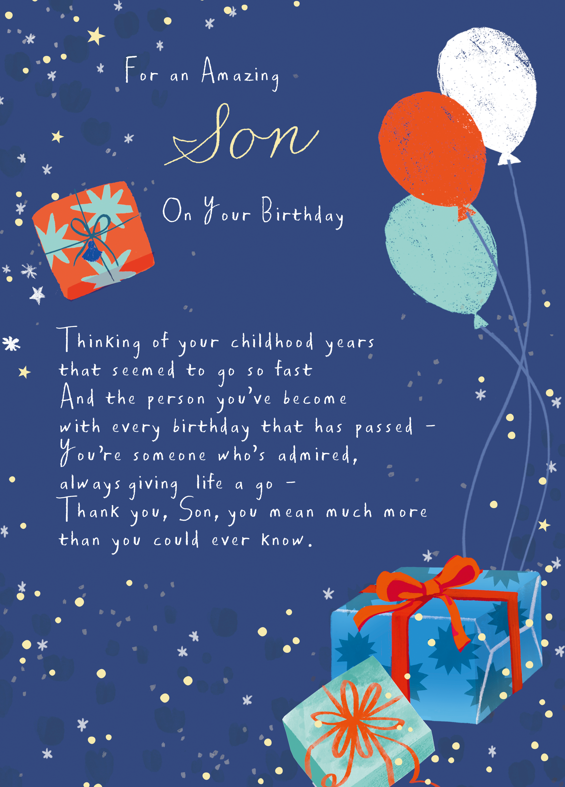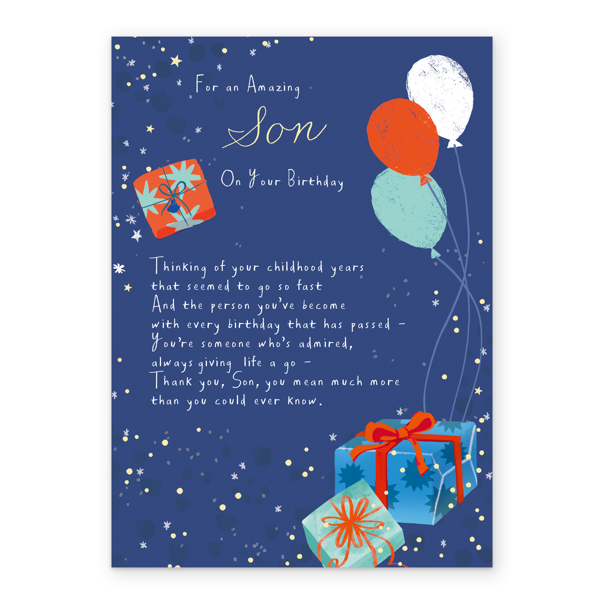 Printed on premium-quality board, this card features a heartfelt poem with illustrations of balloons and presents, with the message 'For an amazing son on your birthday Thinking of your childhood years that seemed to go so fast And the person you've become with every birthday that has passed - You're someone who's admired, always giving life a go - Thank you, son, you mean much more than you could ever know', and comes complete with a co-ordinating white envelope.