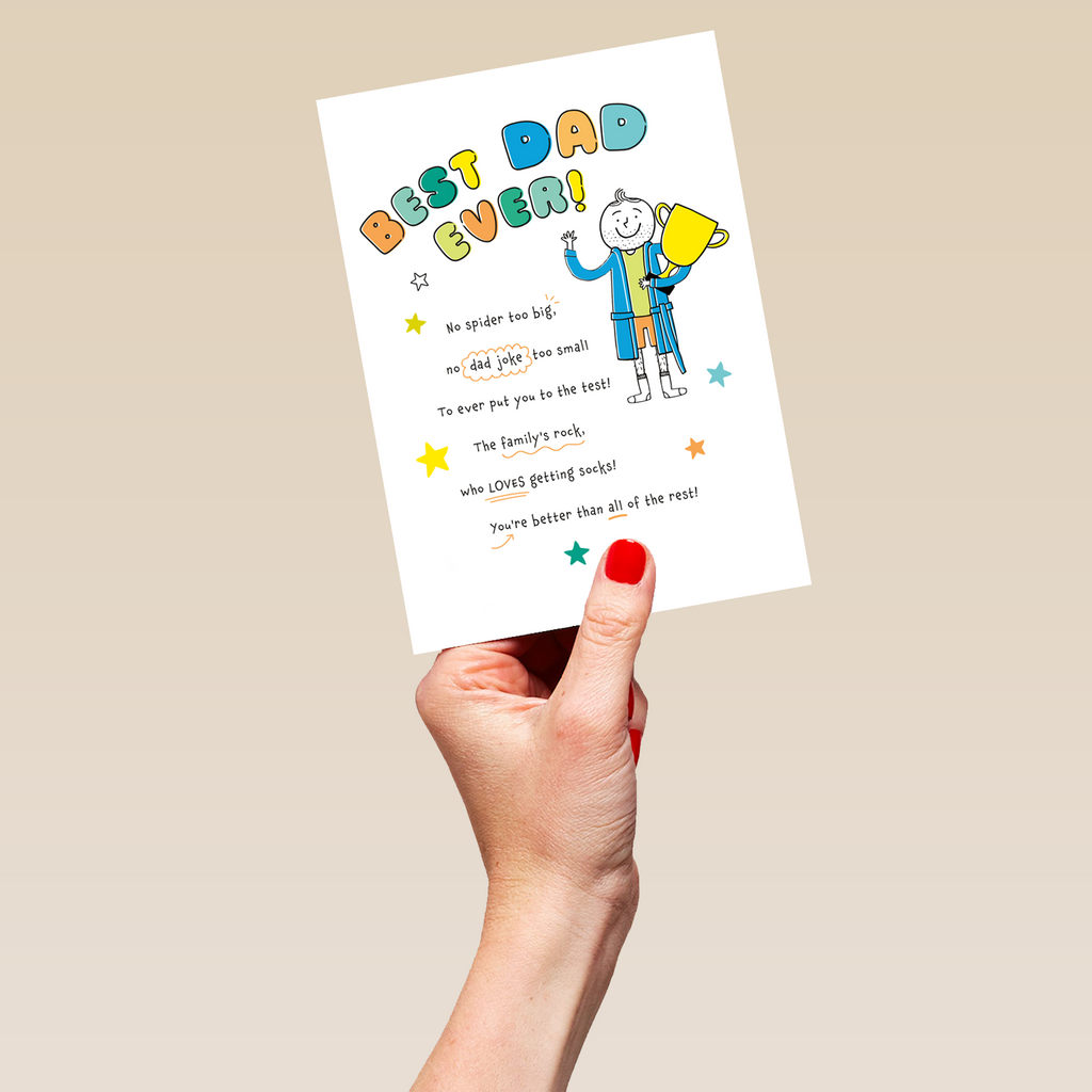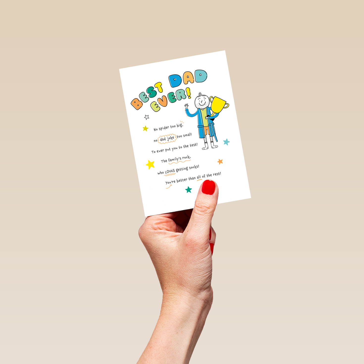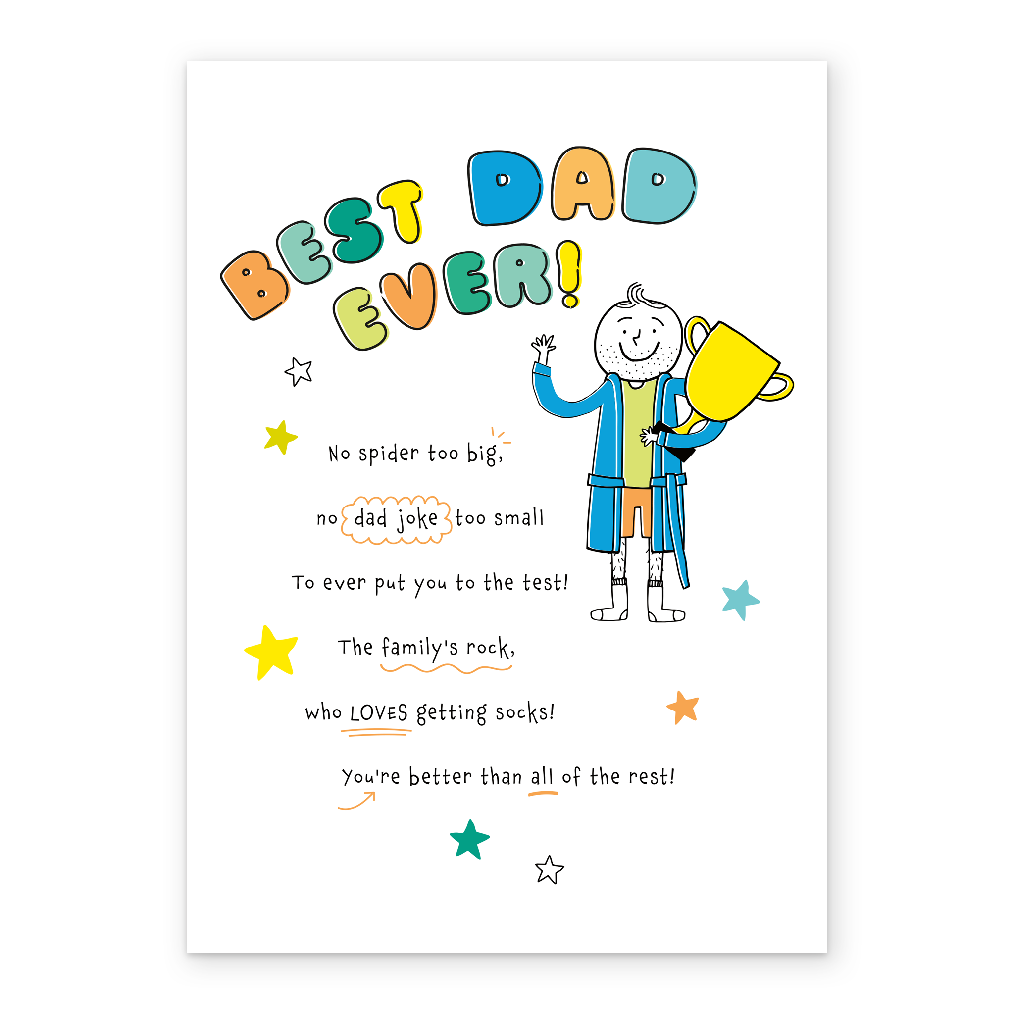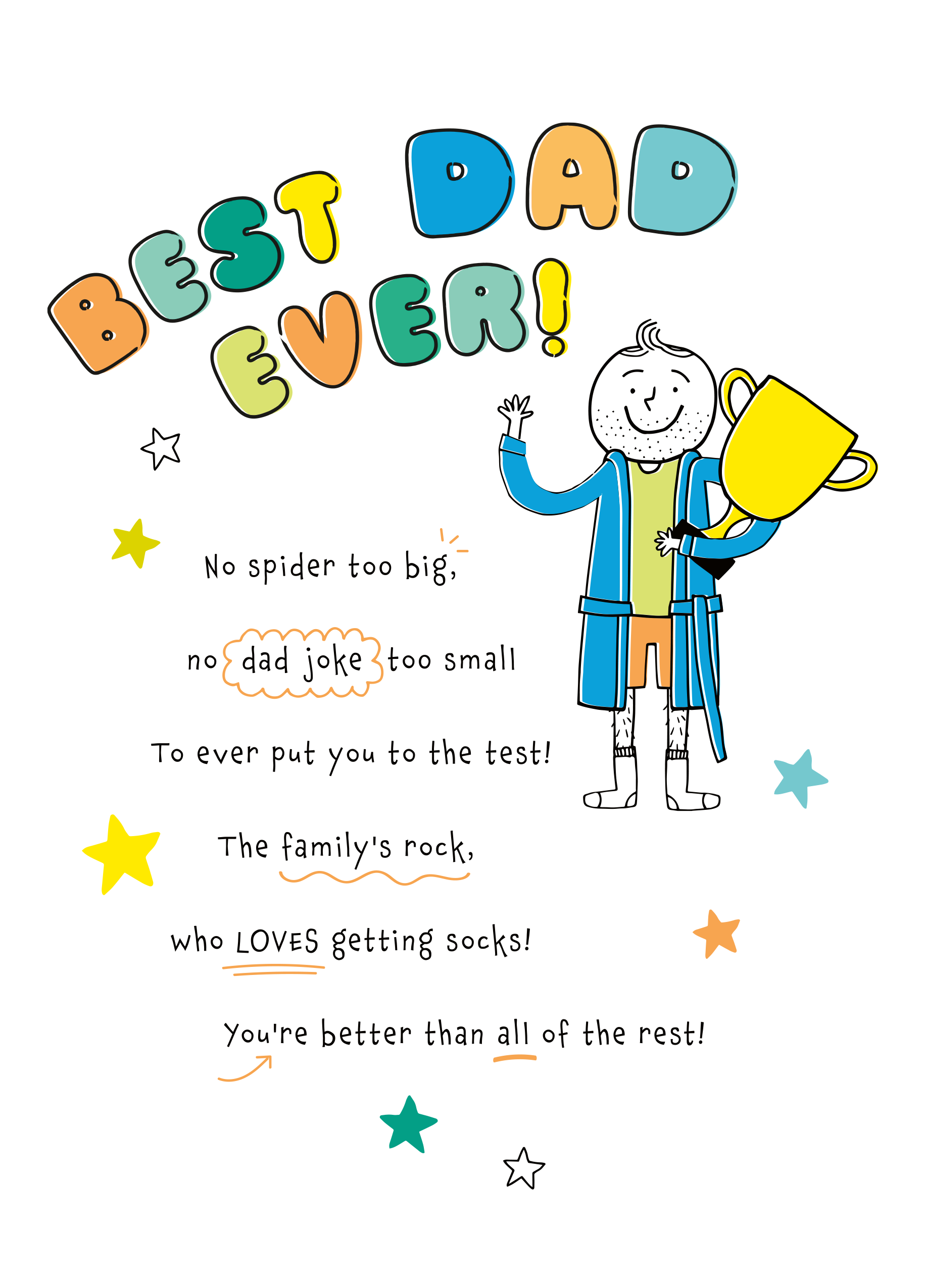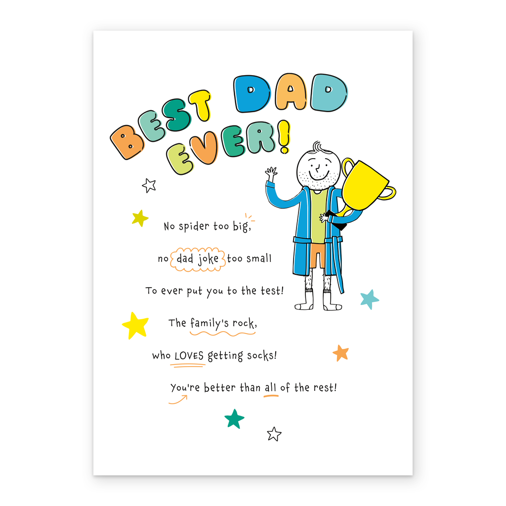 Printed on premium-quality board, this card features an illustration of a Dad wearing his dressing gown and holding a big trophy, with the message 'Best Dad ever! No spider too big, no dad joke too small To ever put you to the test! The family's rock, who LOVES getting socks! You're better than all of the rest!', and comes complete with a co-ordinating white envelope.