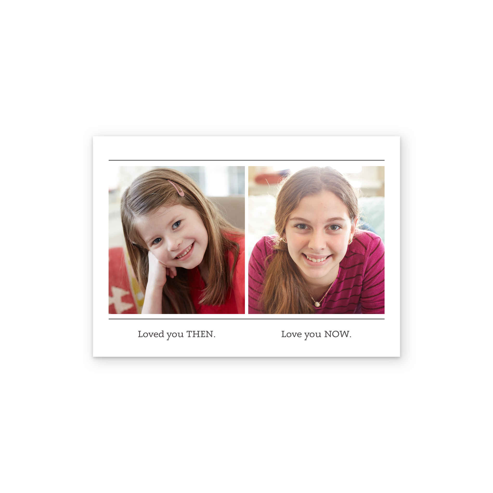 Printed on premium-quality board, this card features 2 large photo upload apertures against a plain white background above simple black lettering, with the message 'Loved you then. Love you now.', space to upload photos and personalise your message, and comes complete with a co-ordinating white envelope.