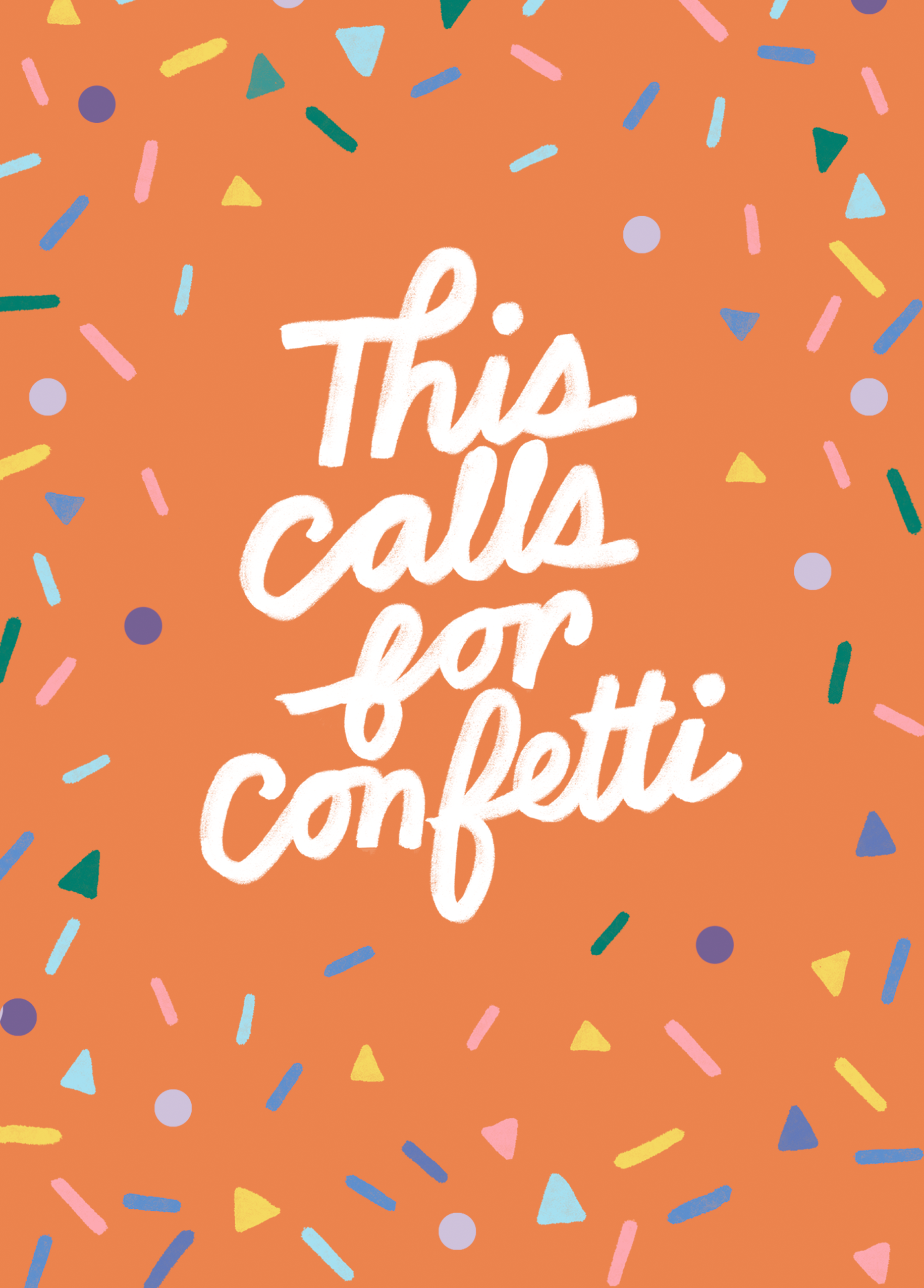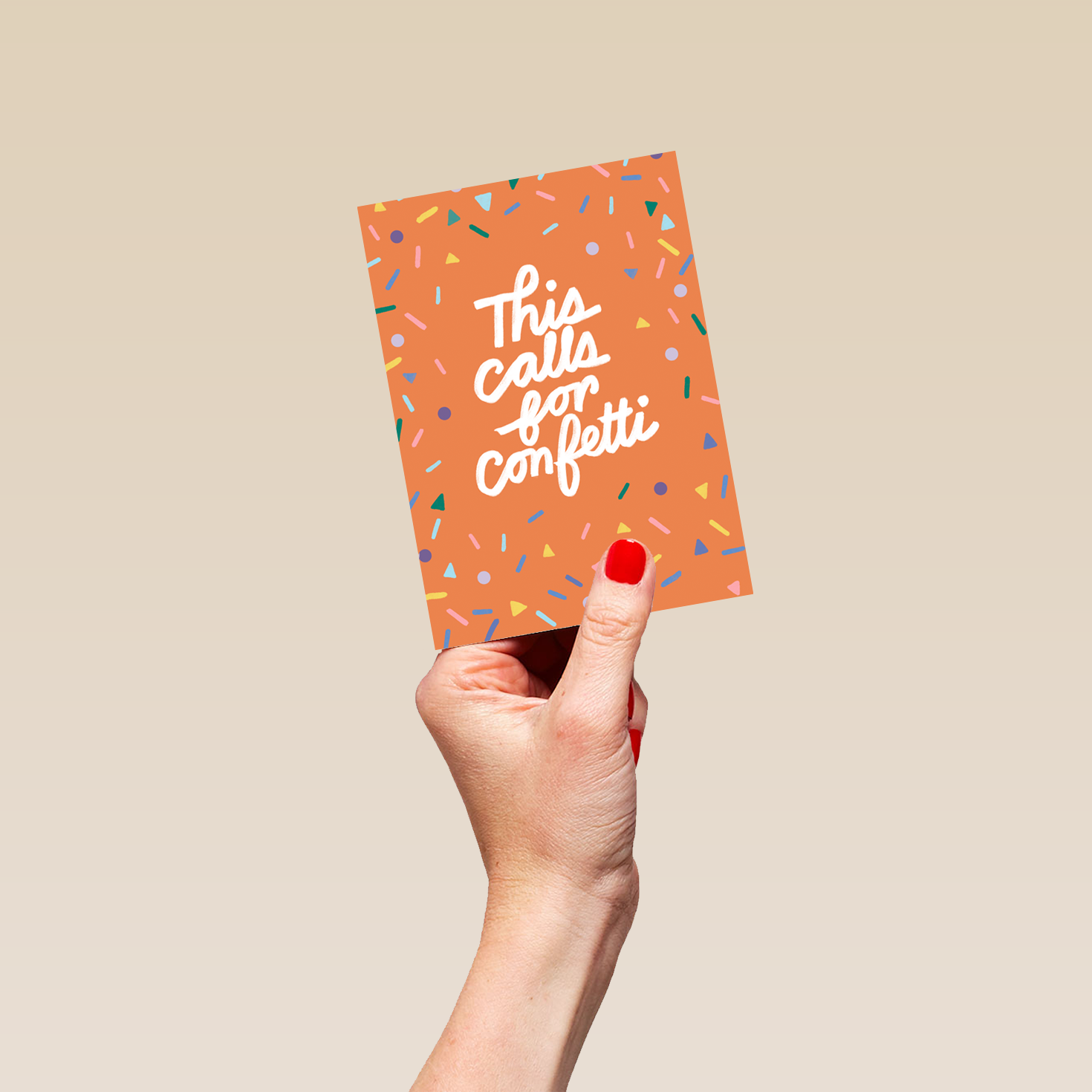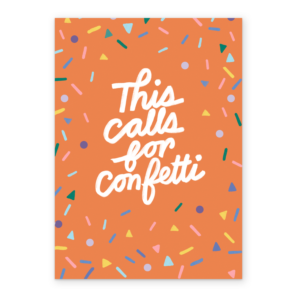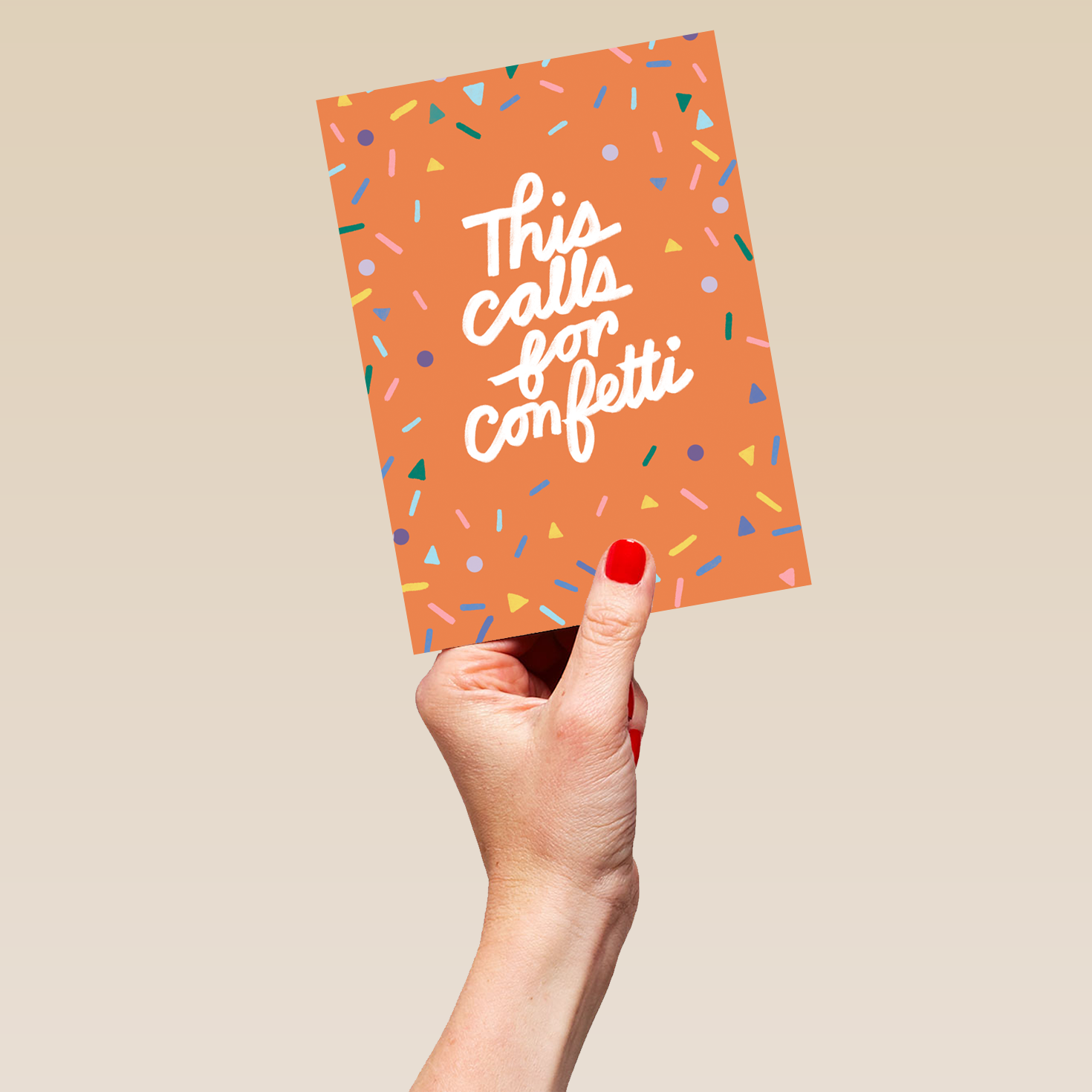 Printed on premium-quality board, this card features an orange background with lots of colourful confetti shapes, with the message 'This calls for confetti', and comes complete with a co-ordinating white envelope.