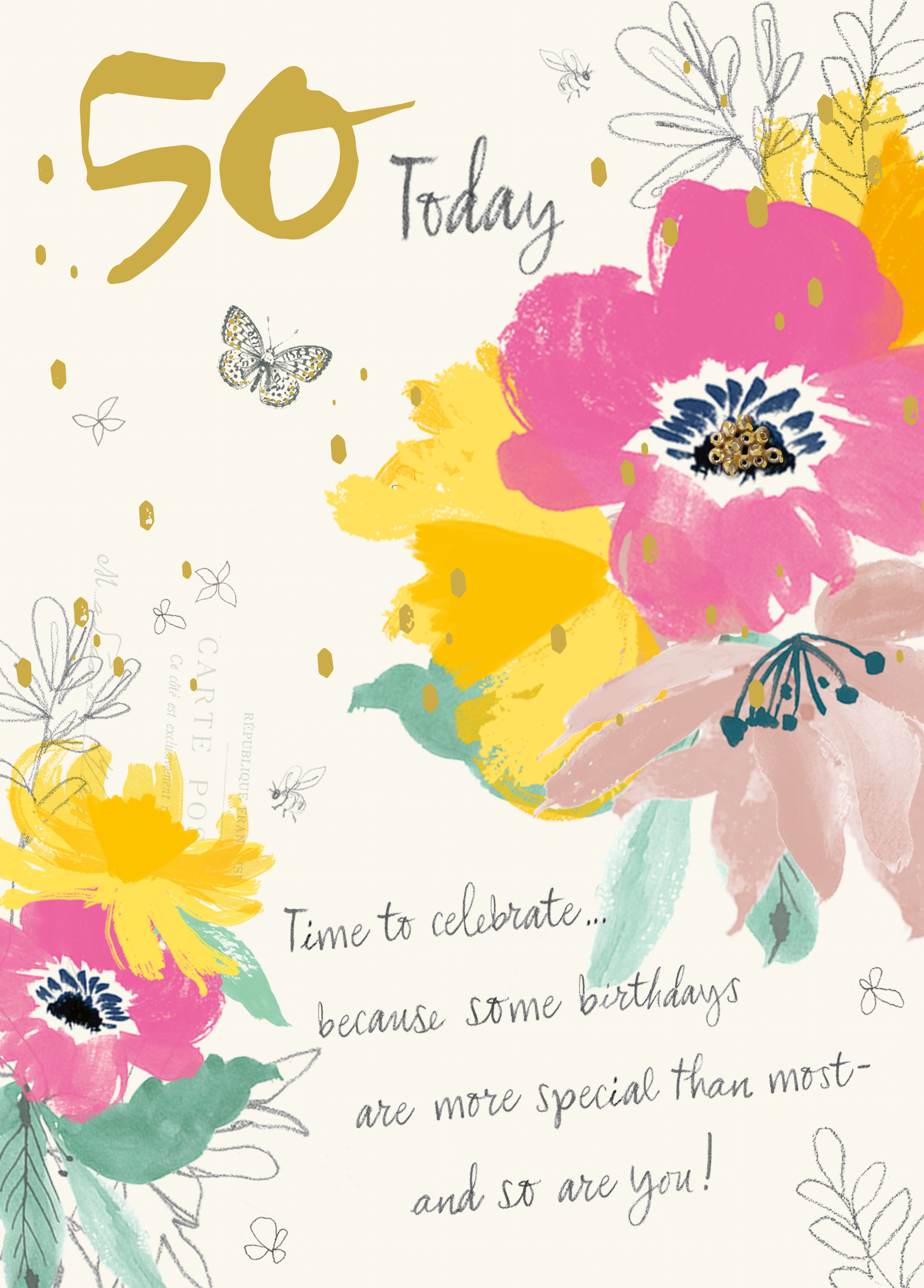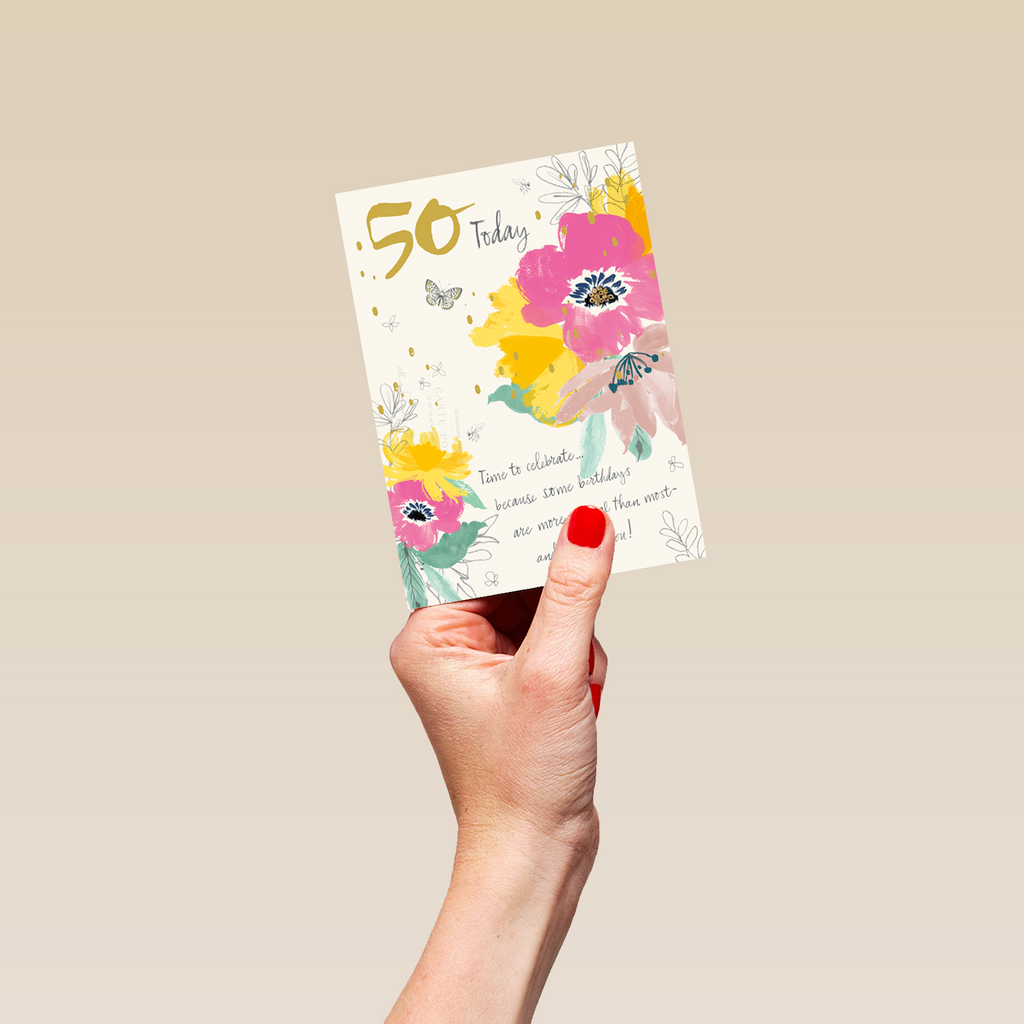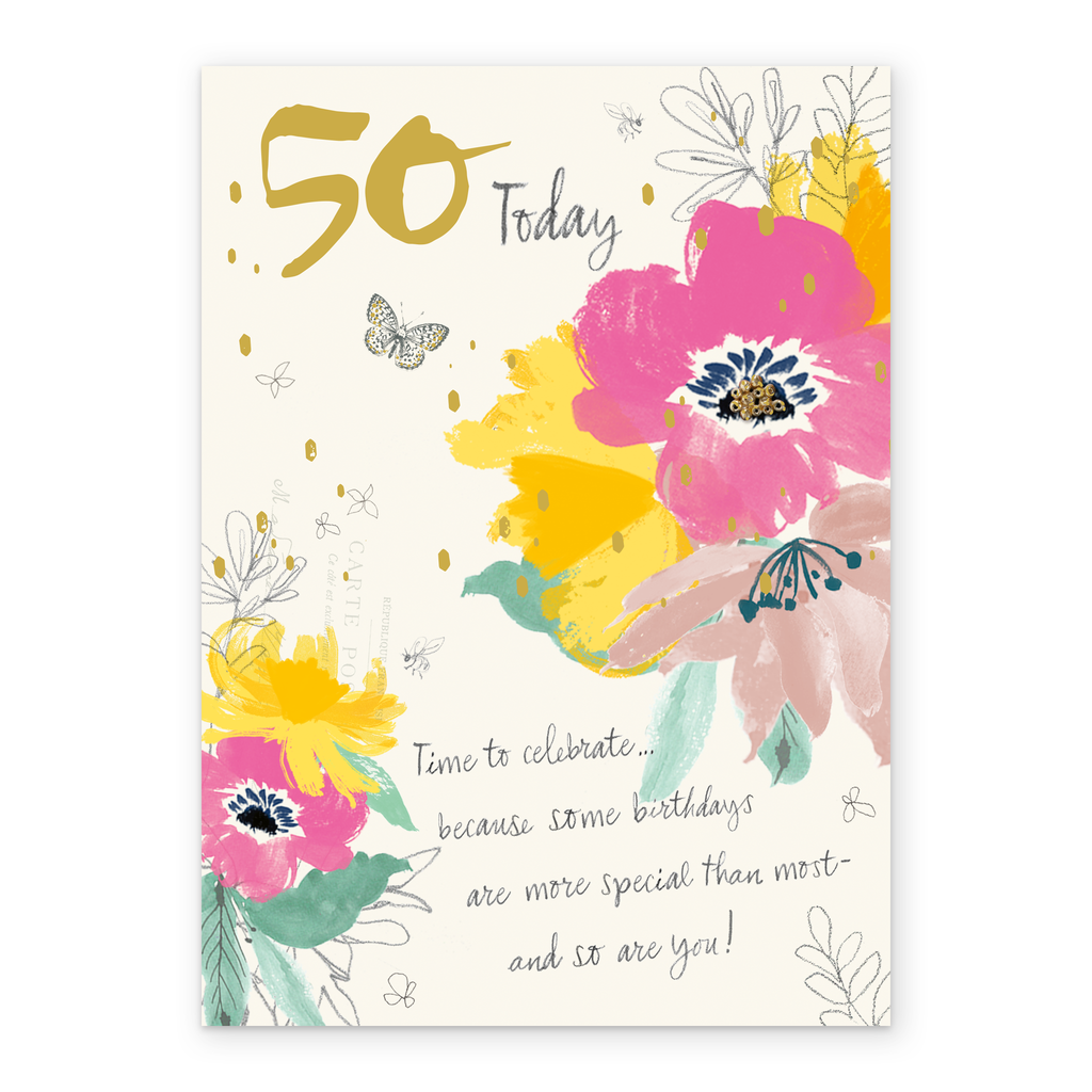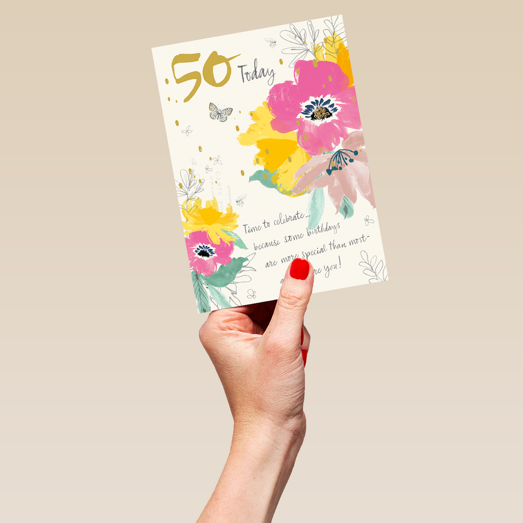 Printed on premium-quality board, this card features watercolour style florals, with the message '50 today. Time to celebrate… because some birthdays are more special than most - and so are you!', and comes complete with a co-ordinating white envelope.