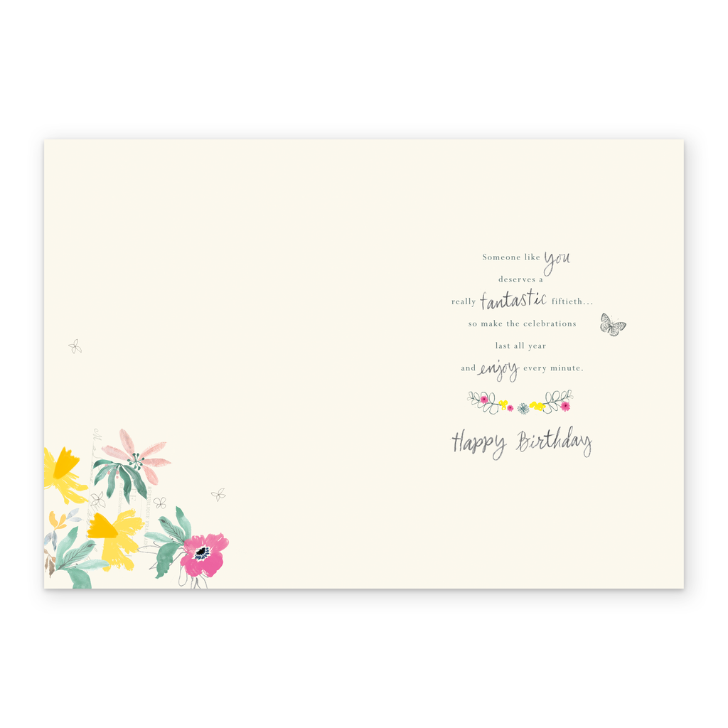 Message inside reads: Someone like you deserves a really fantastic fiftieth… so make the celebrations last all year and enjoy every minute. Happy Birthday
