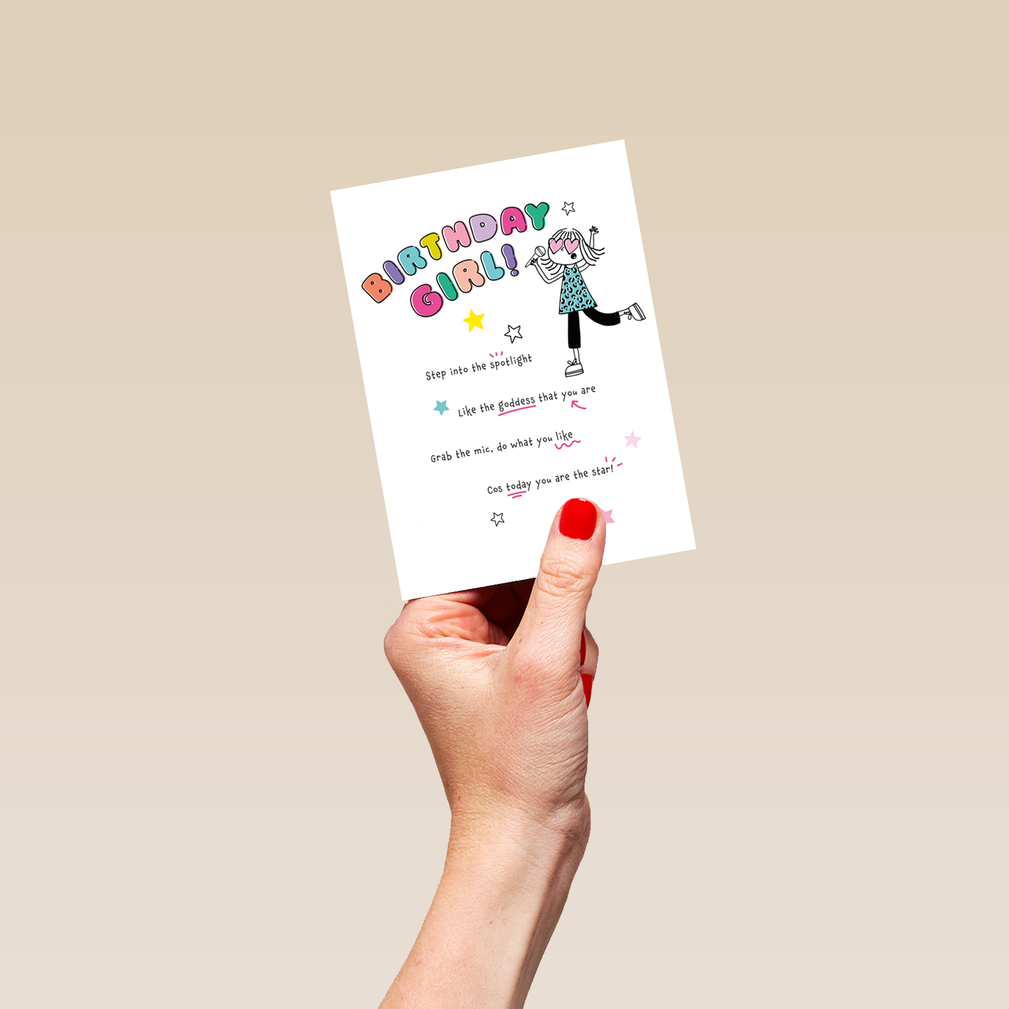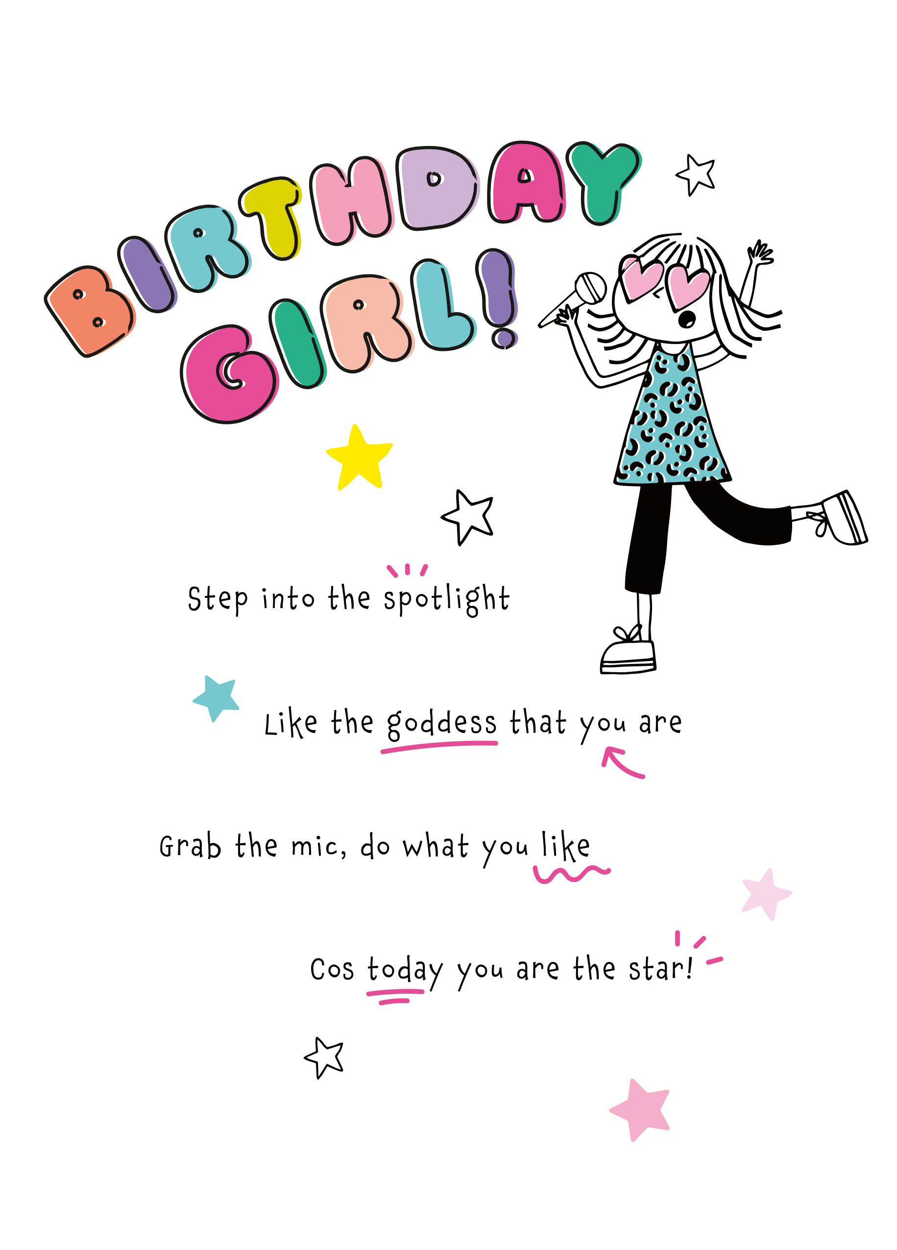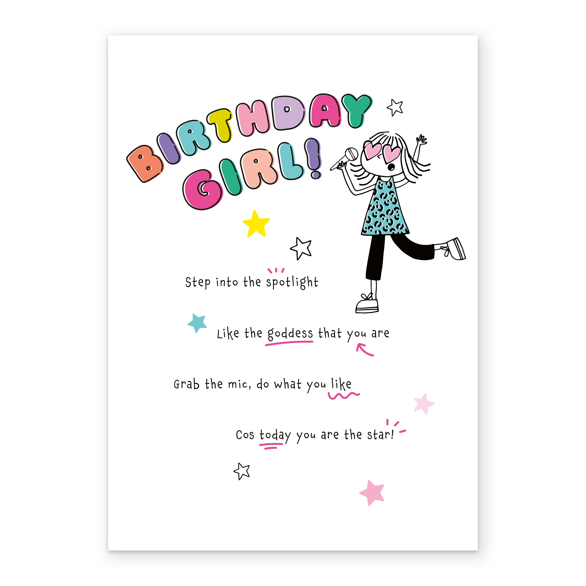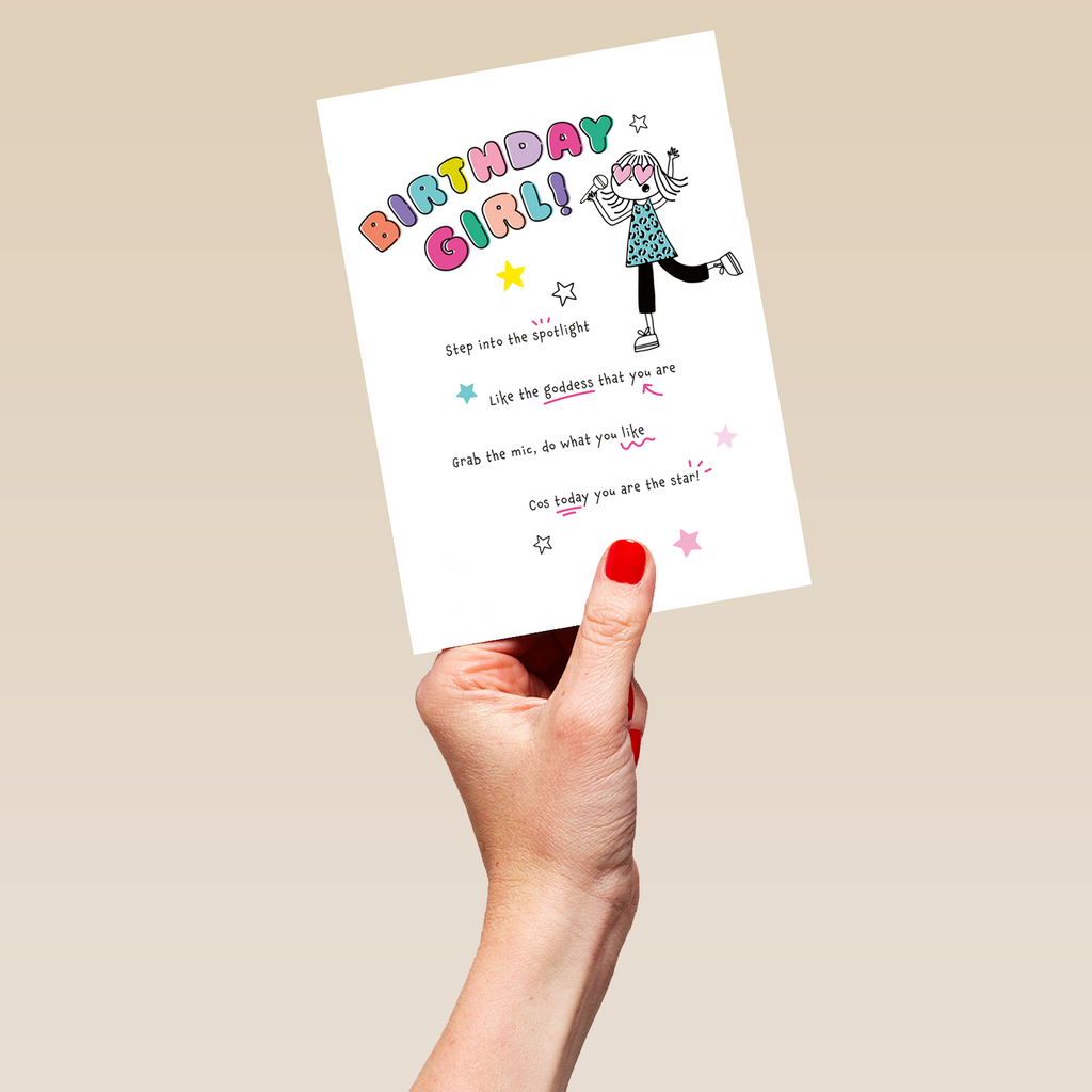 Printed on premium-quality board, this card features an illustration of a Birthday Girl wearing heart-shaped glasses and singing into a microphone, with the message 'Birthday Girl! Step into the spotlight Like the goddess that you are Grab the mic, do what you like Cos today you are the star!', and comes complete with a co-ordinating white envelope.