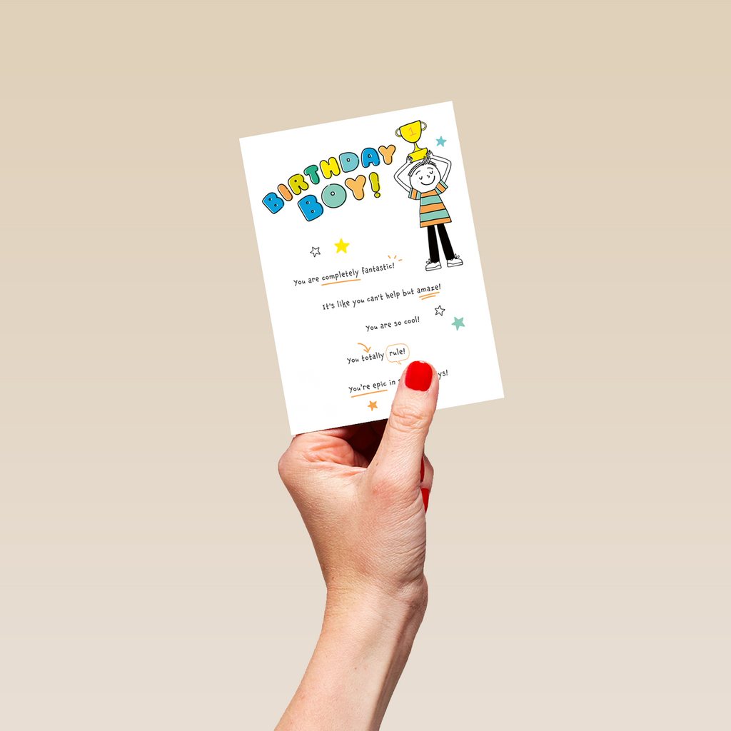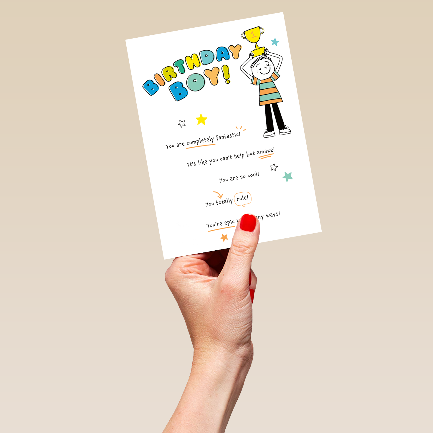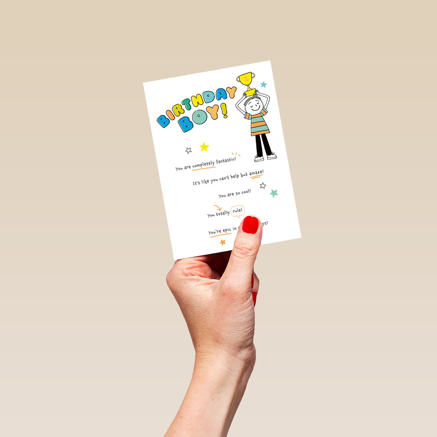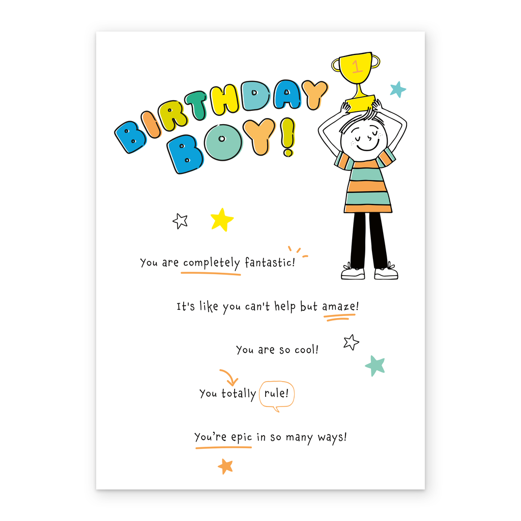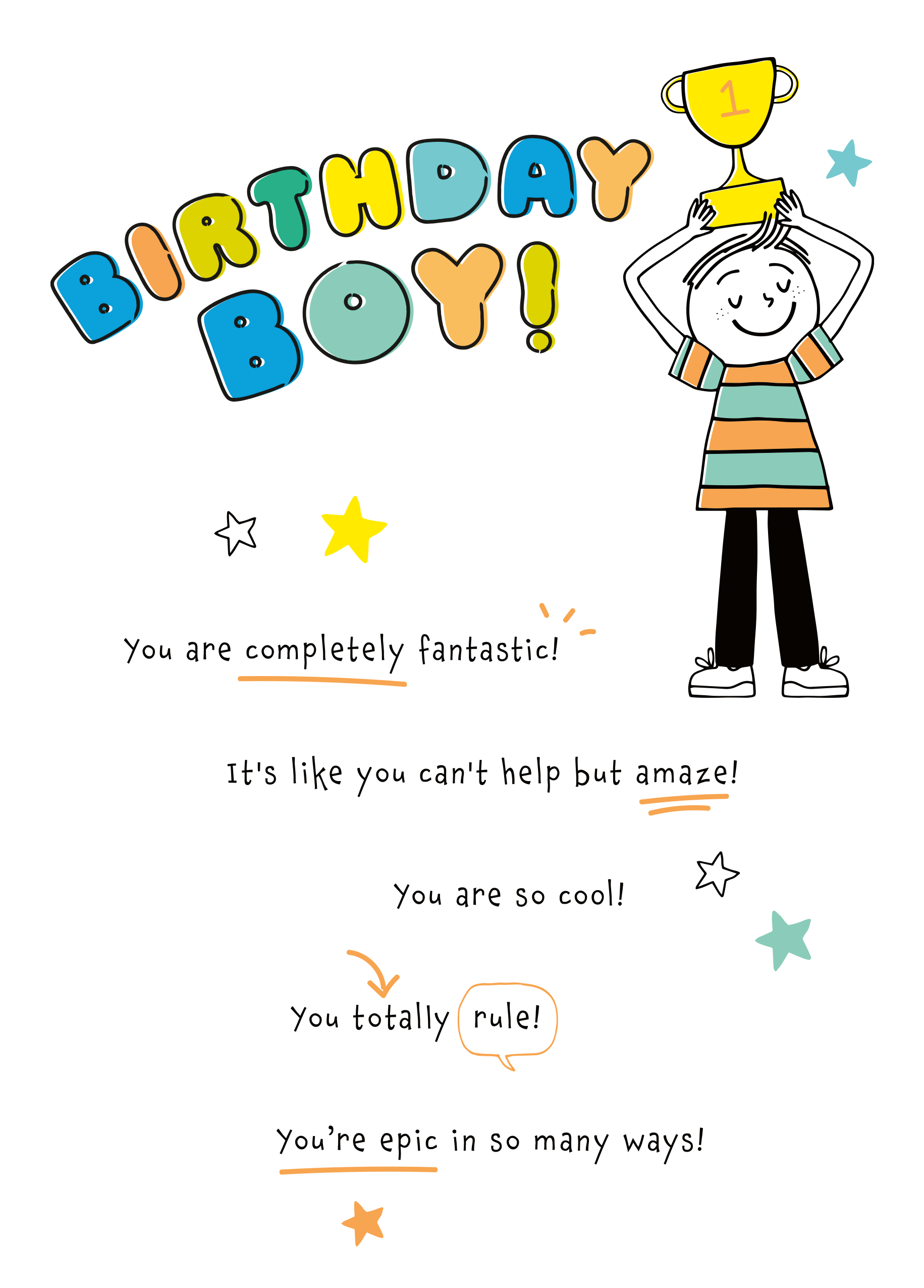 Printed on premium-quality board, this card features an illustration of the Birthday Boy holding a trophy up, with the message 'Birthday Boy! You are completely fantastic! It's like you can't help but amaze! You are so cool! You totally rule! You're epic in so many ways!', and comes complete with a co-ordinating white envelope.