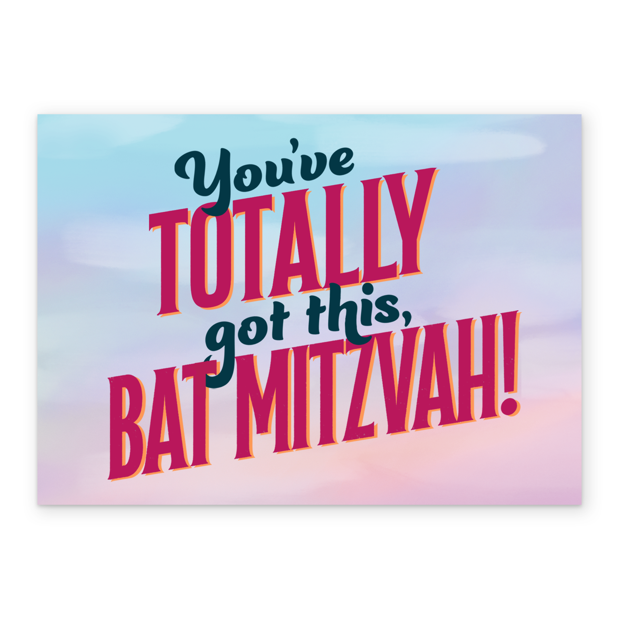 Printed on premium-quality board, this card features a blue and pink ombre styled background, with the message 'You've Totally Got This, Bat Mitzvah!', and comes complete with a co-ordinating white envelope.