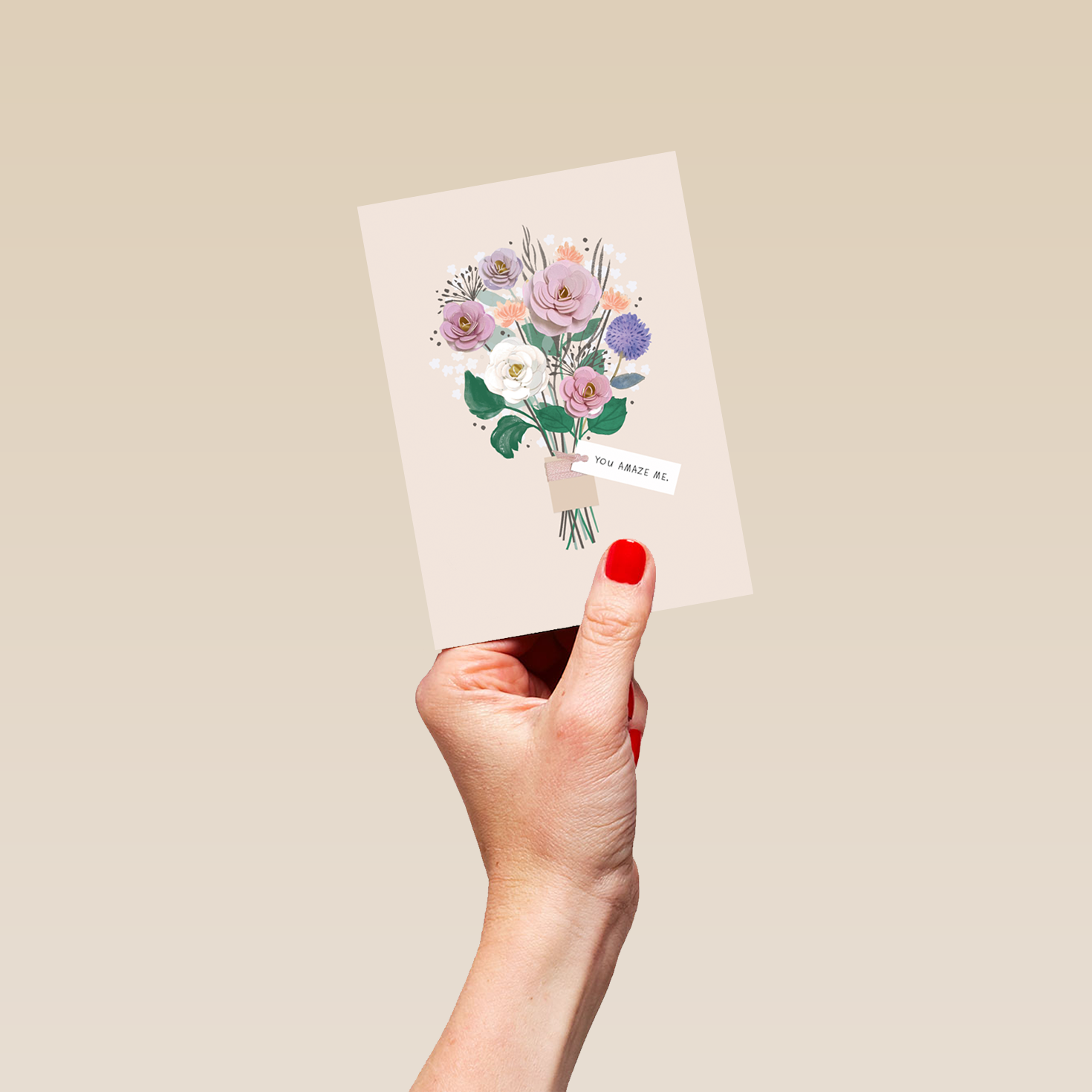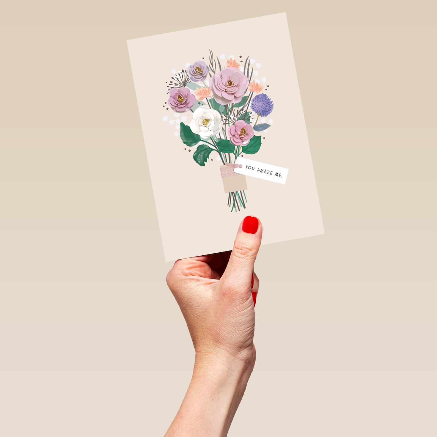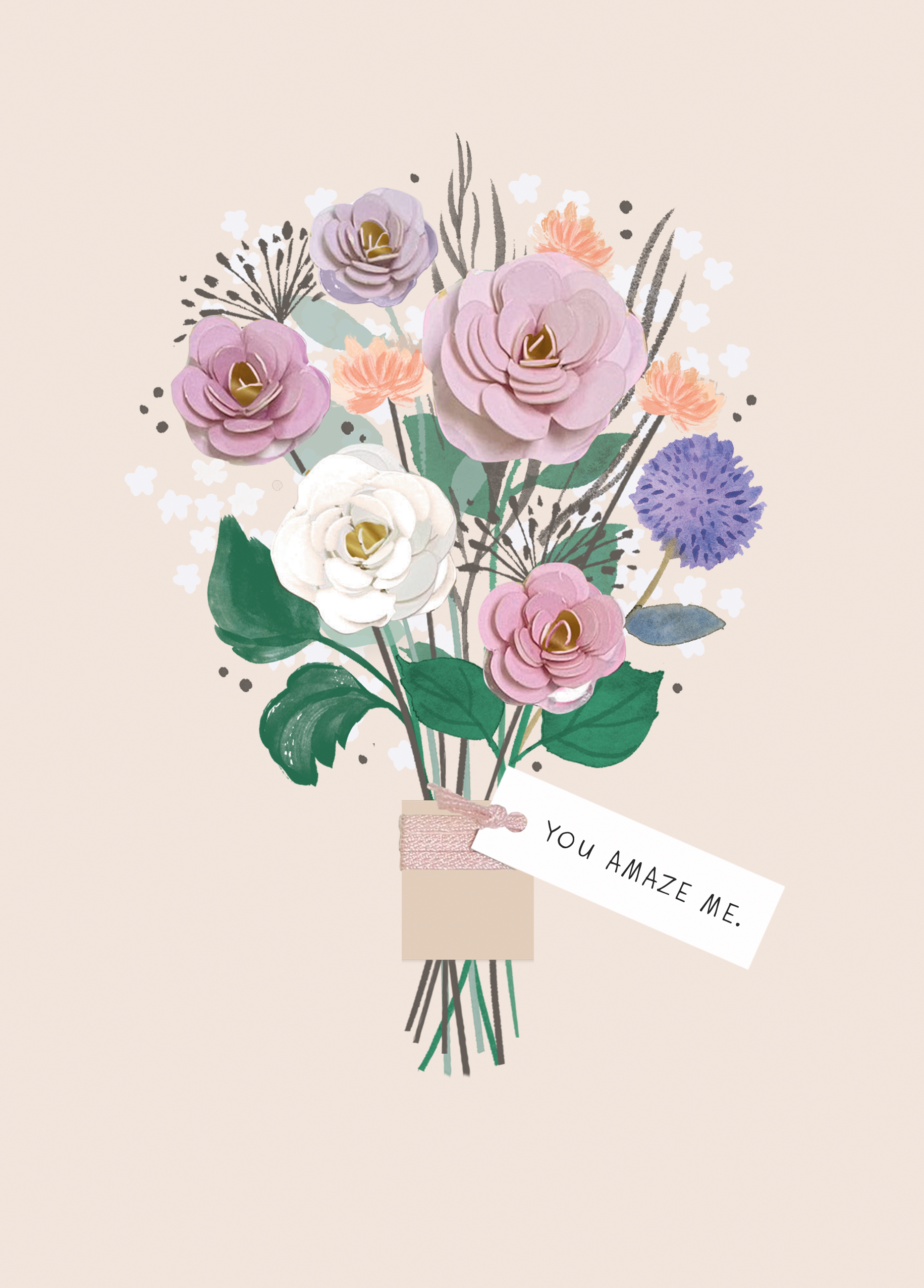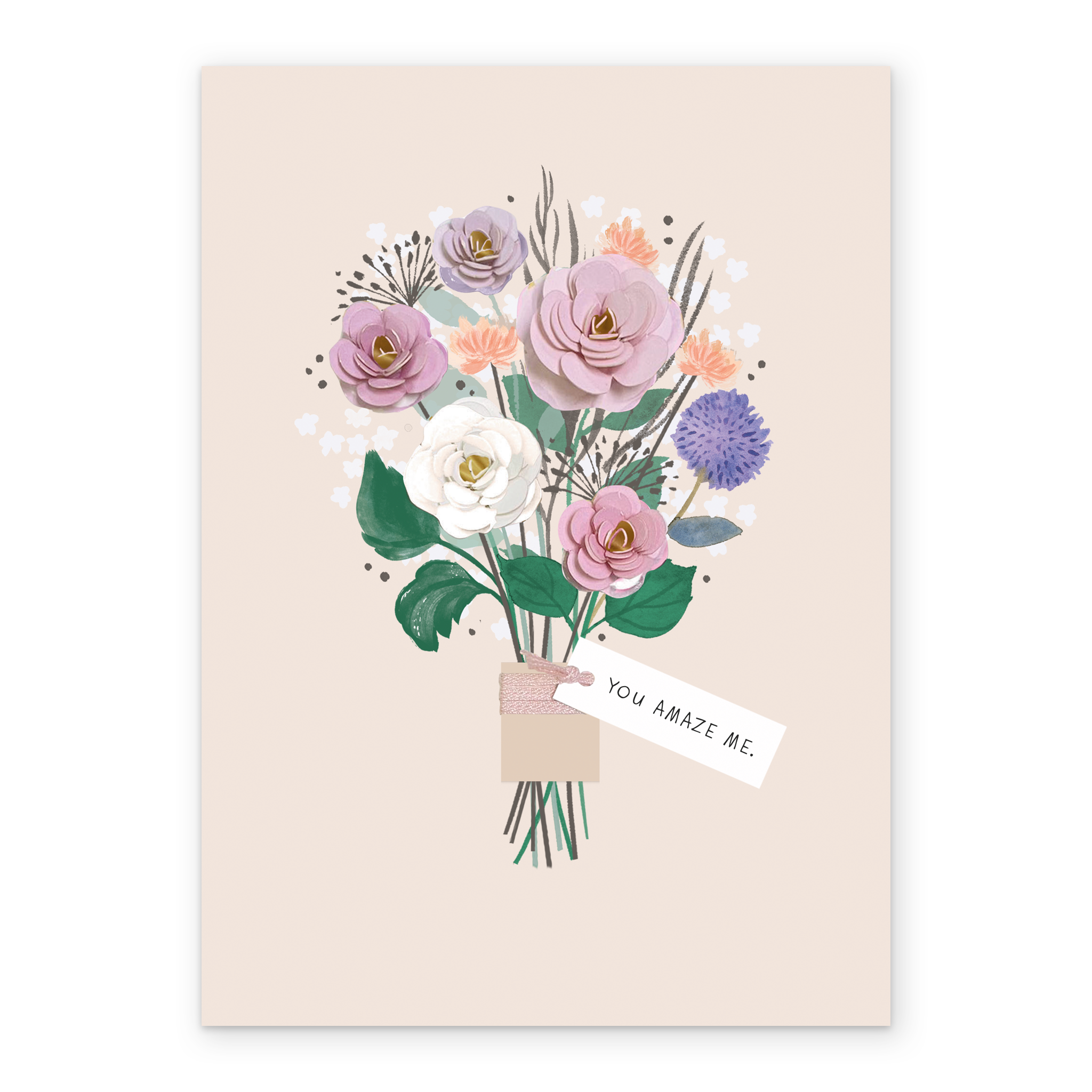 Printed on premium-quality board, this card features a beautiful image of a paper-crafted flower bouquet, containing white, purple and pink flowers, a small white tag with black lettering, with the message 'You Amaze Me.', space to personalise a name, and comes complete with a co-ordinating white envelope.