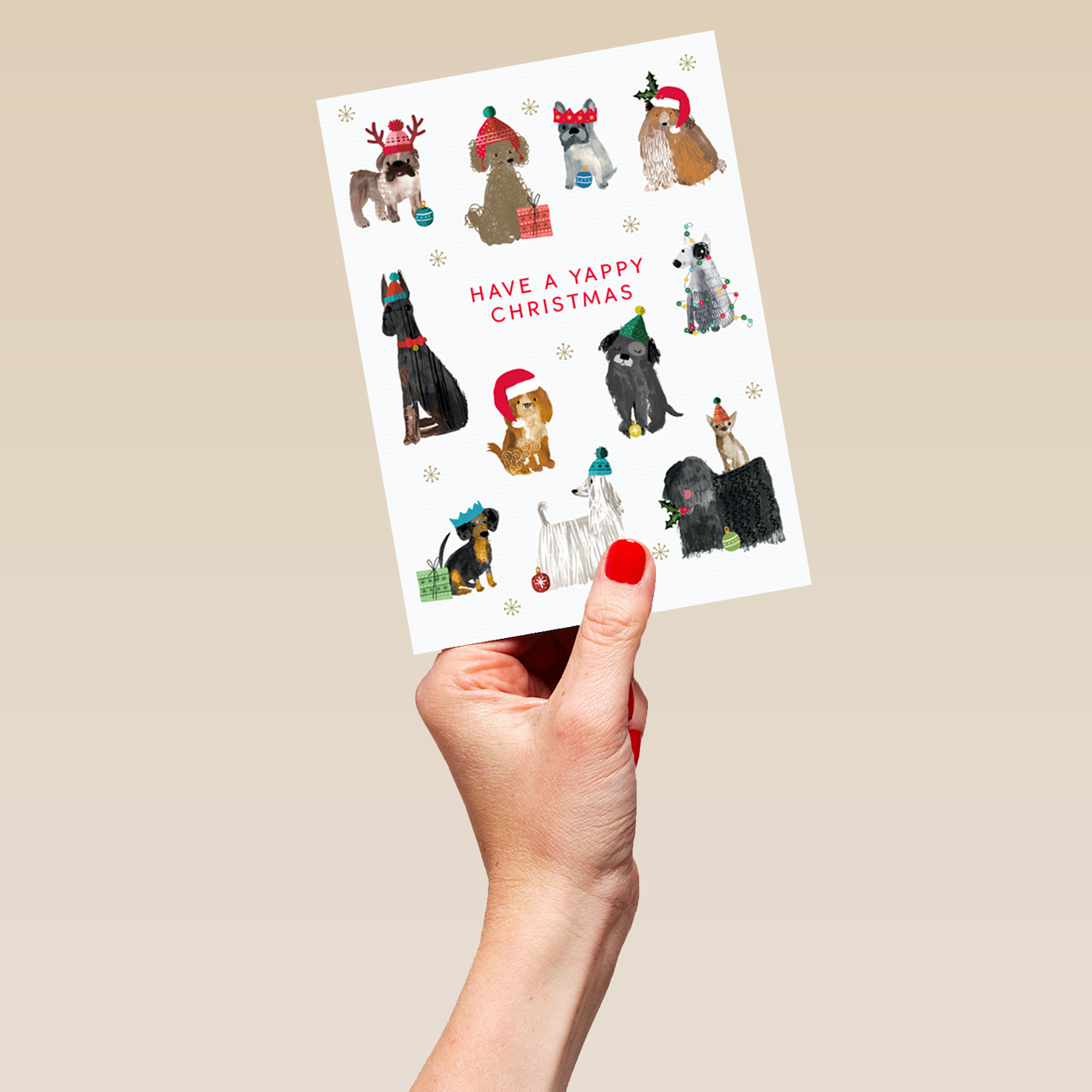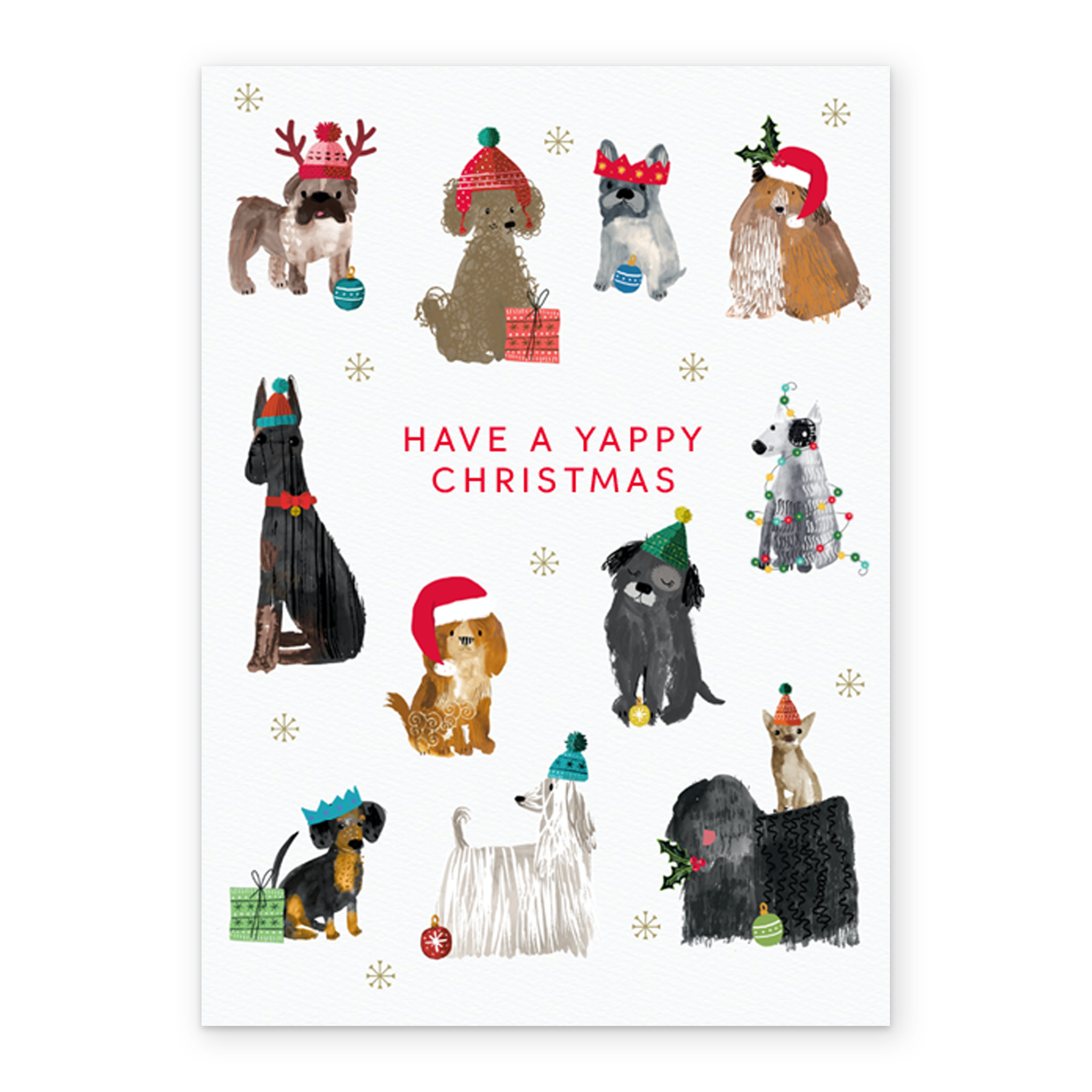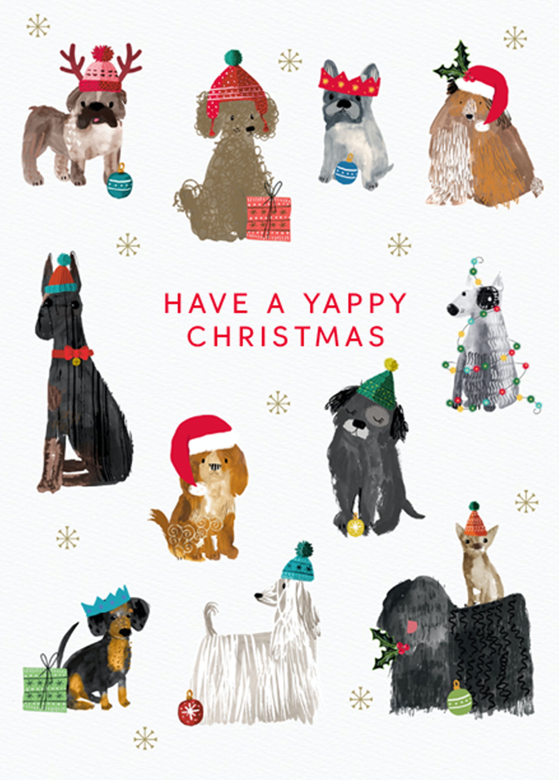 Show them you care with a personalised classic Christmas pet editable Yappy Xmas dogs card from Hallmark. Our greetings cards are printed on premium quality, FSC®-certified card & delivered nationwide. This card is available as standard 12cm by 16.7cm and large 15.5cm by 21.6cm.