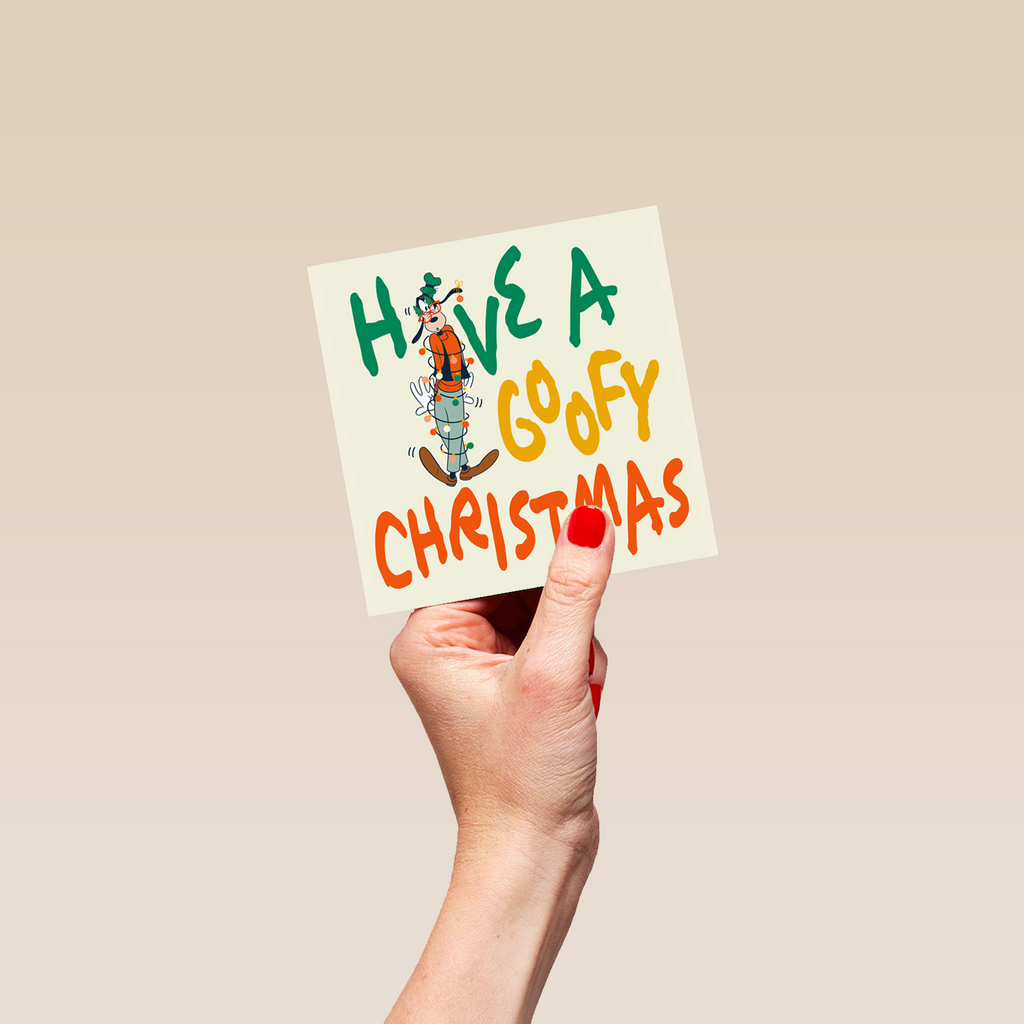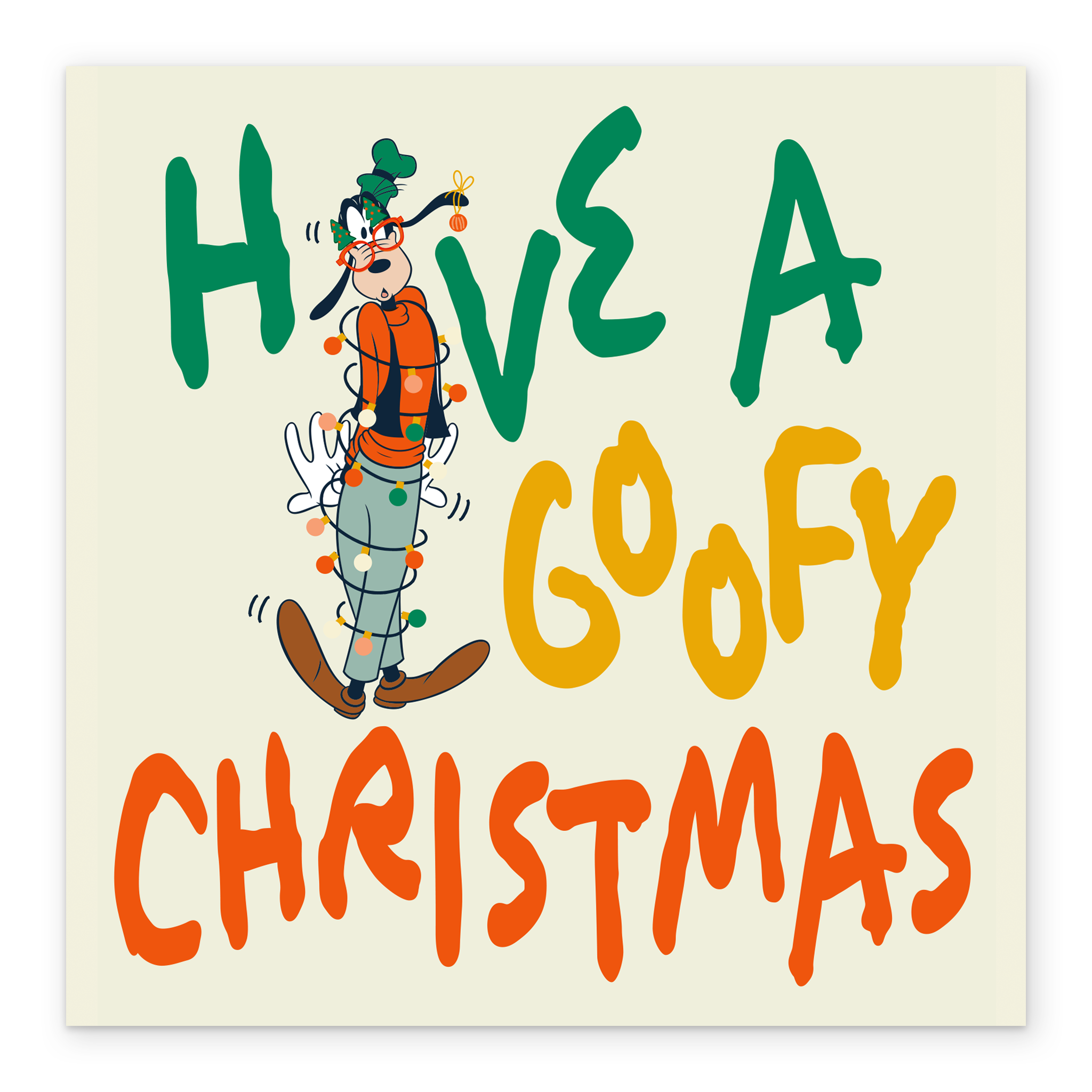 Printed on premium-quality board, this card features Disney's Goofy tangled in Christmas lights, with the message 'Have a Goofy Christmas', and comes complete with a co-ordinating white envelope.