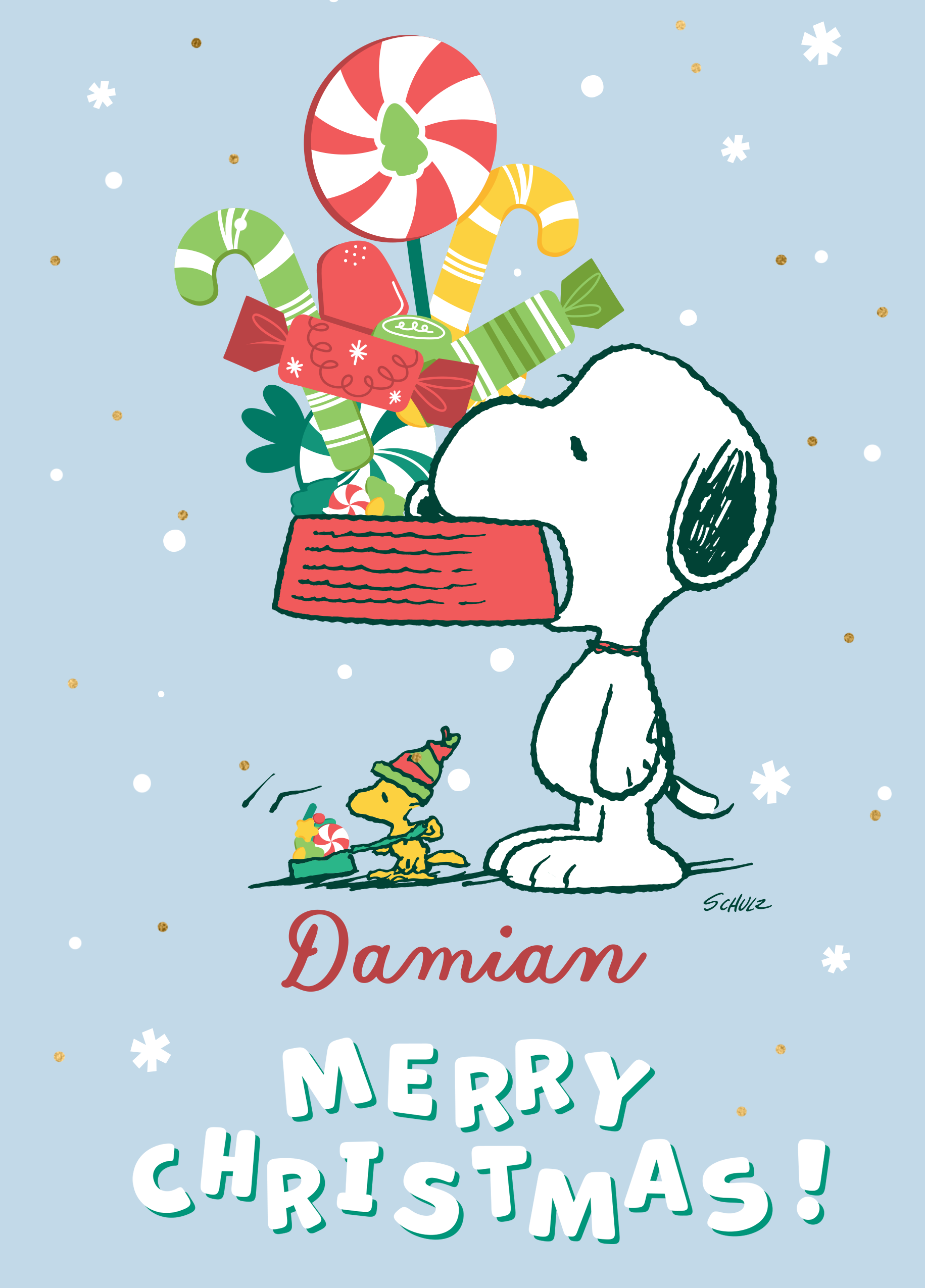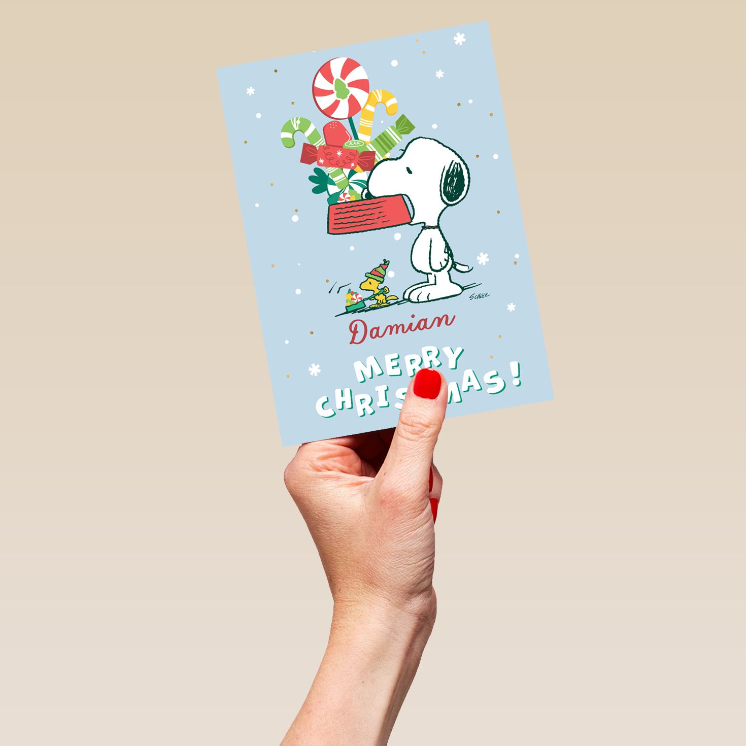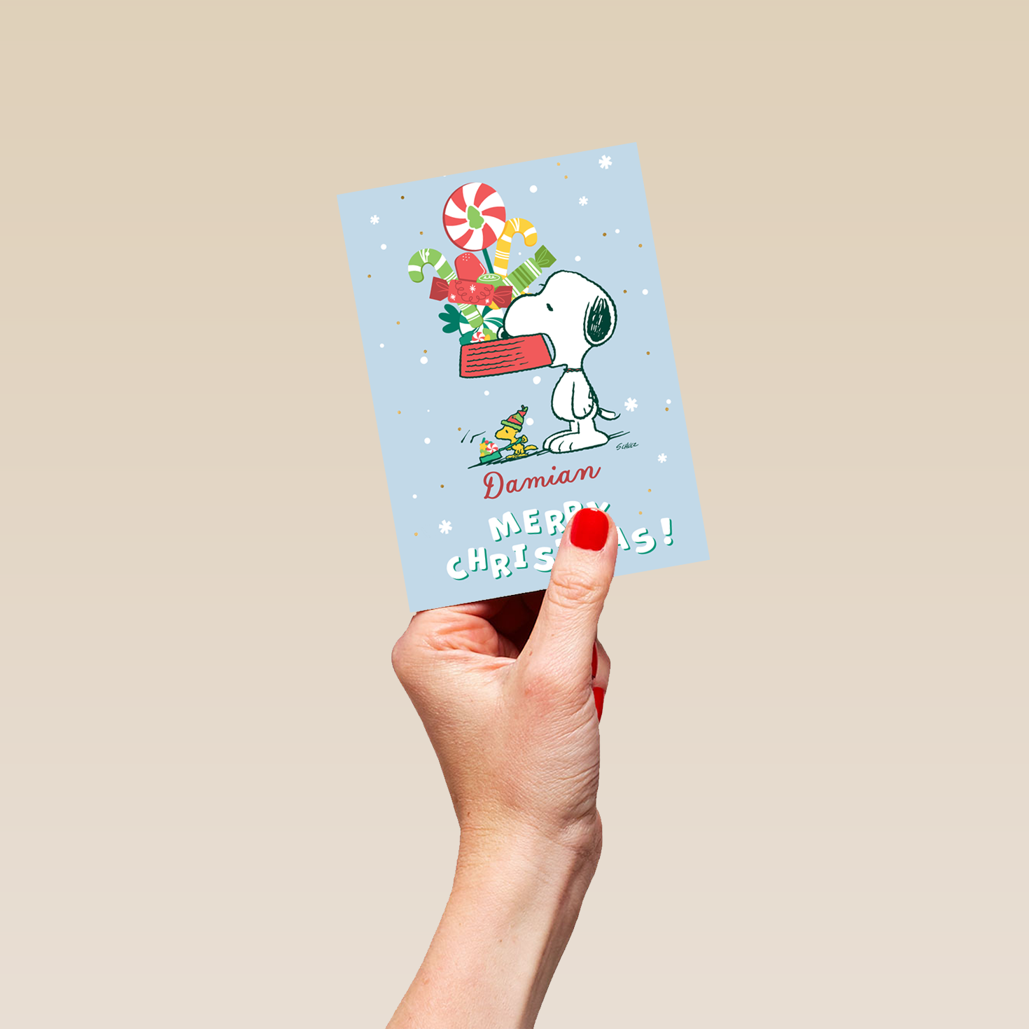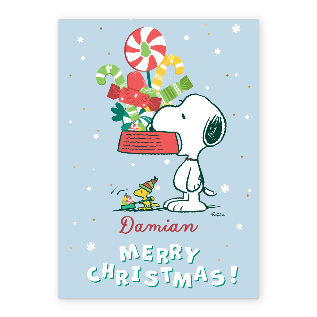 Printed on premium-quality board, this card features SNOOPY holding his dog bowl full of Christmas treats and WOODSTOCK with a little bowl of treats, with the message 'Merry Christmas!', space to personalise a name, and comes complete with a co-ordinating white envelope.