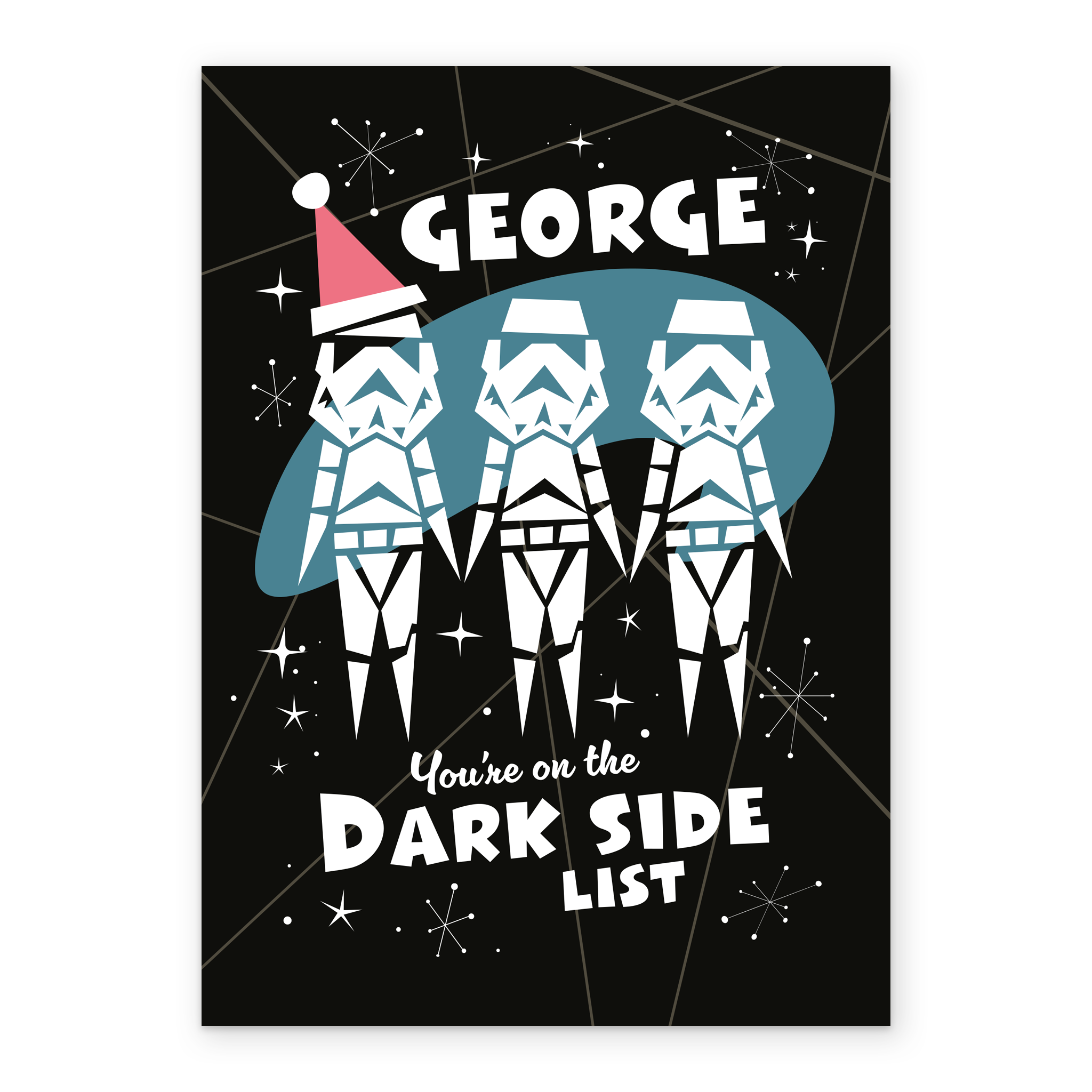 Printed on premium-quality board, this card features three Stormtroopers from Star Wars™ with one wearing a Santa hat, with the message 'You're on the Dark Side list', space to personalise a name, and comes complete with a co-ordinating white envelope.