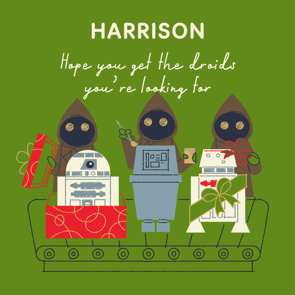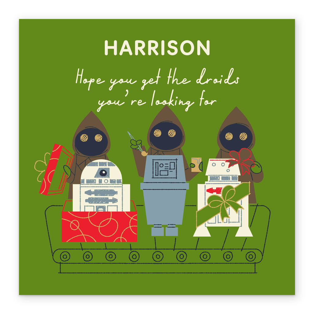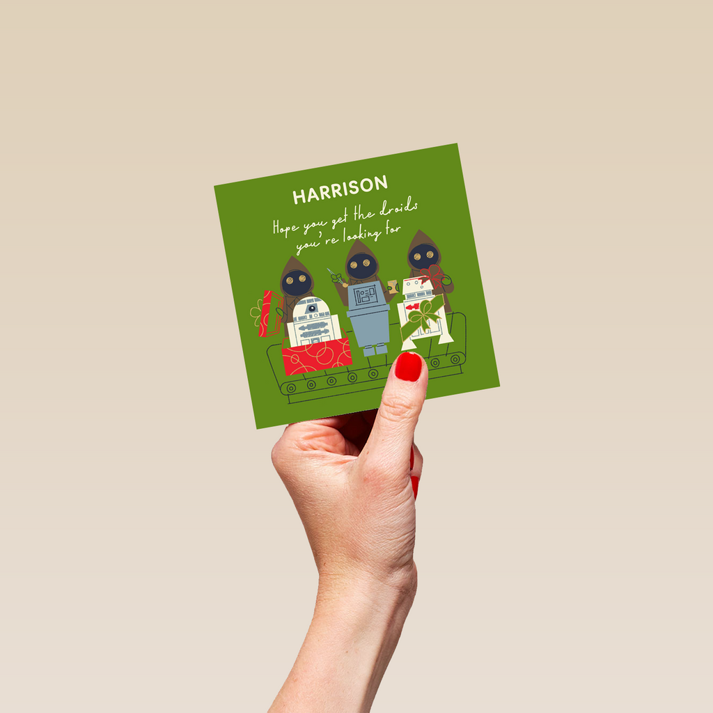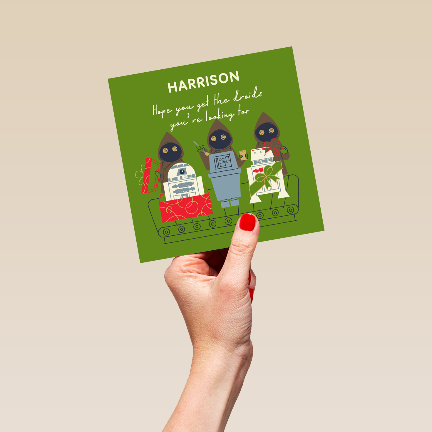 Printed on premium-quality board, this card features a trio of Jawas from Star Wars wrapping up different droids on a conveyor belt, including R2-D2, with the message '[Name] Hope you'll get the droids ypu're looking for', space to personalise a name, and comes complete with a co-ordinating white envelope.