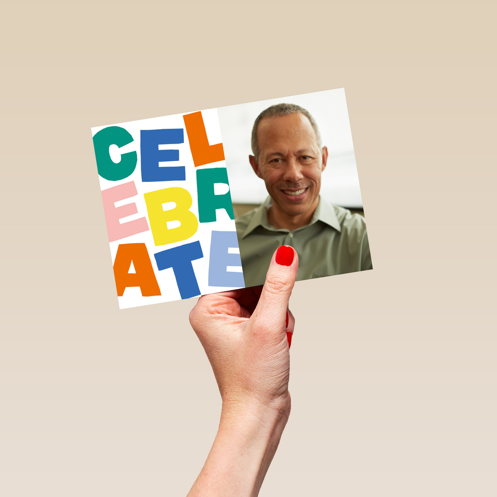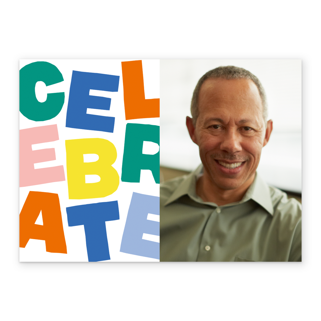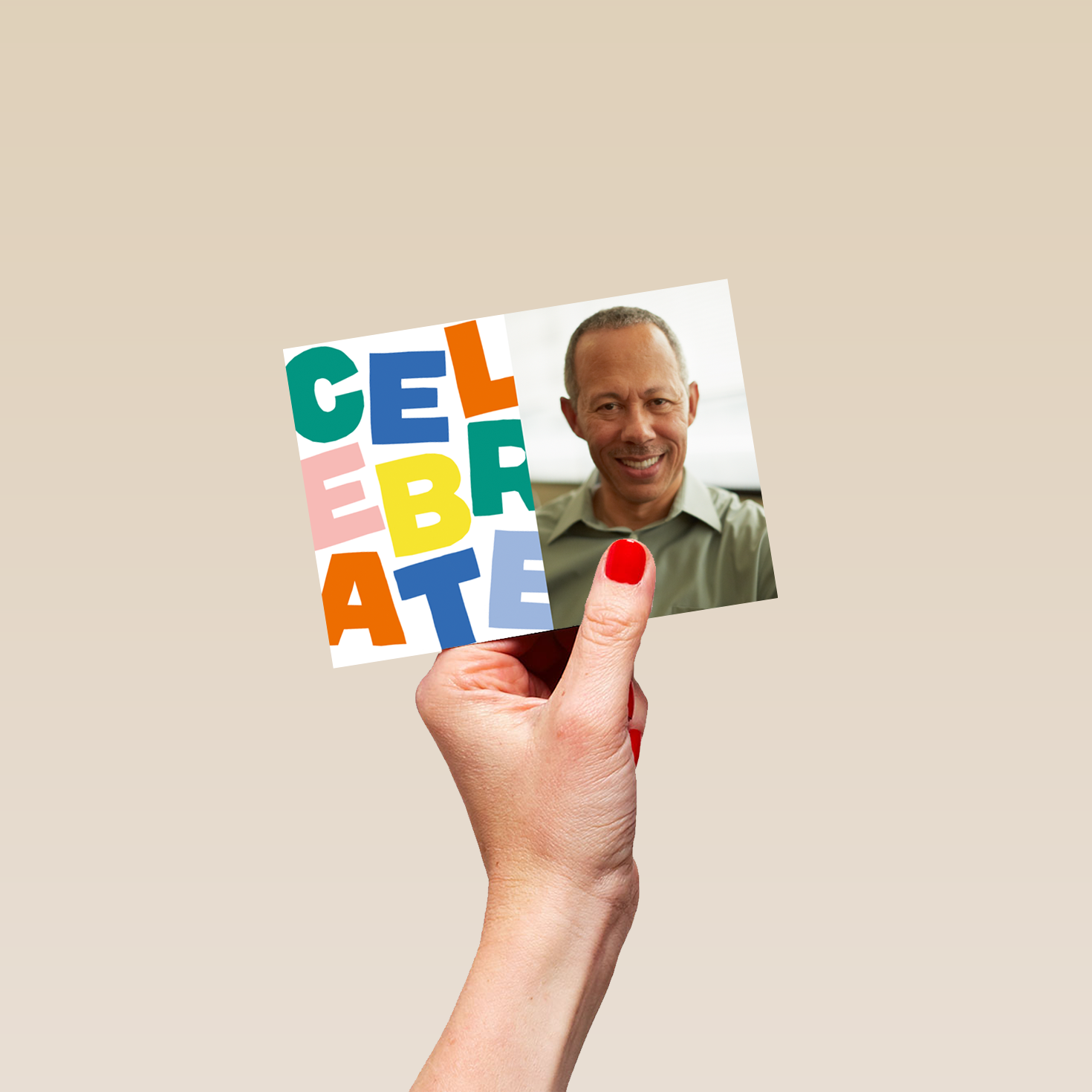 Printed on premium-quality board, this card features a white background, with the message 'Celebrate', space to upload a photo, and comes complete with a co-ordinating white envelope.