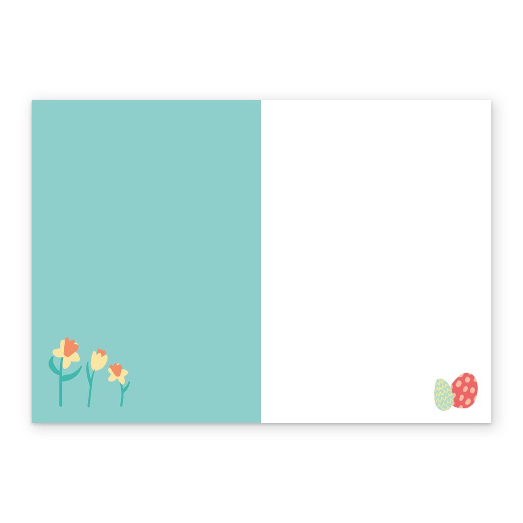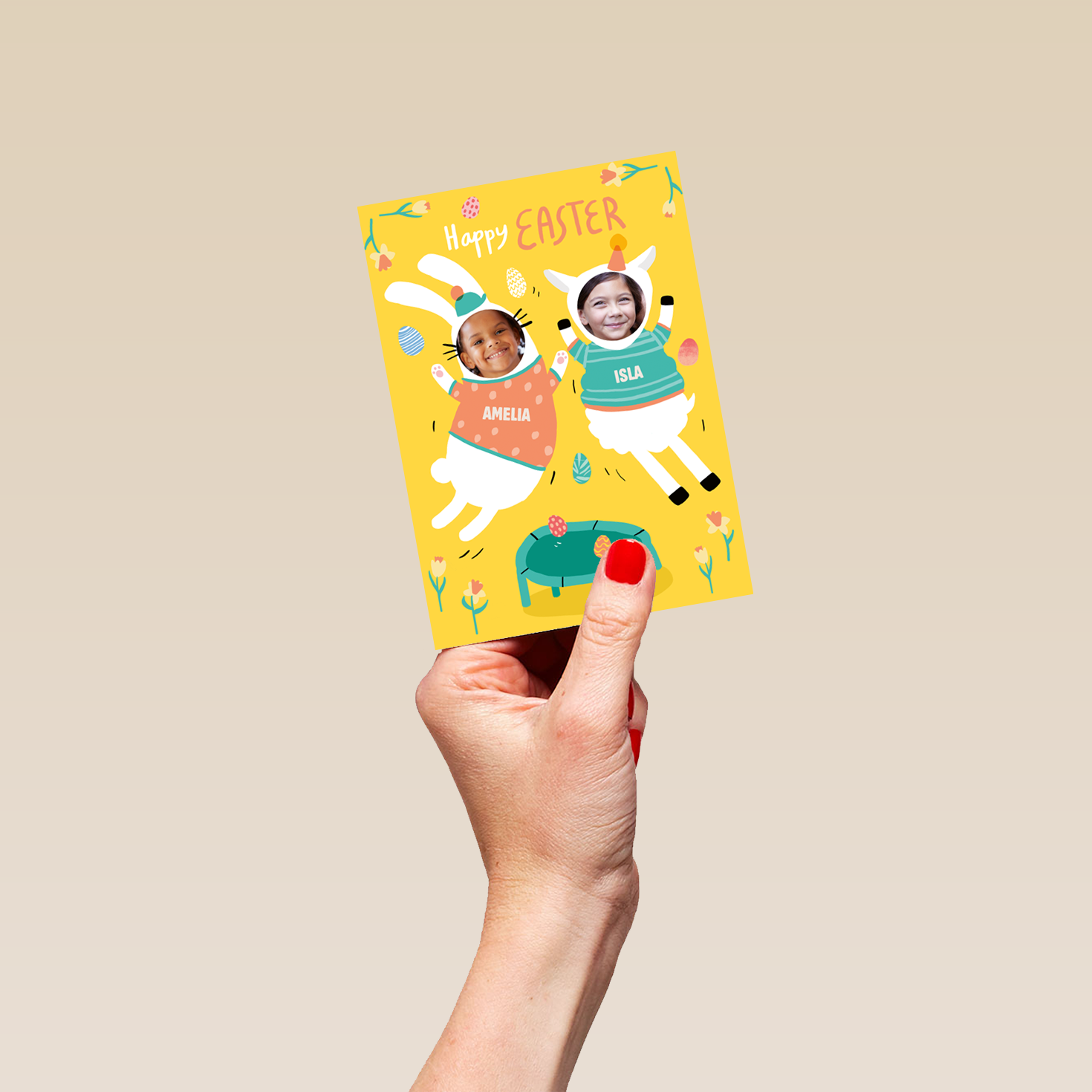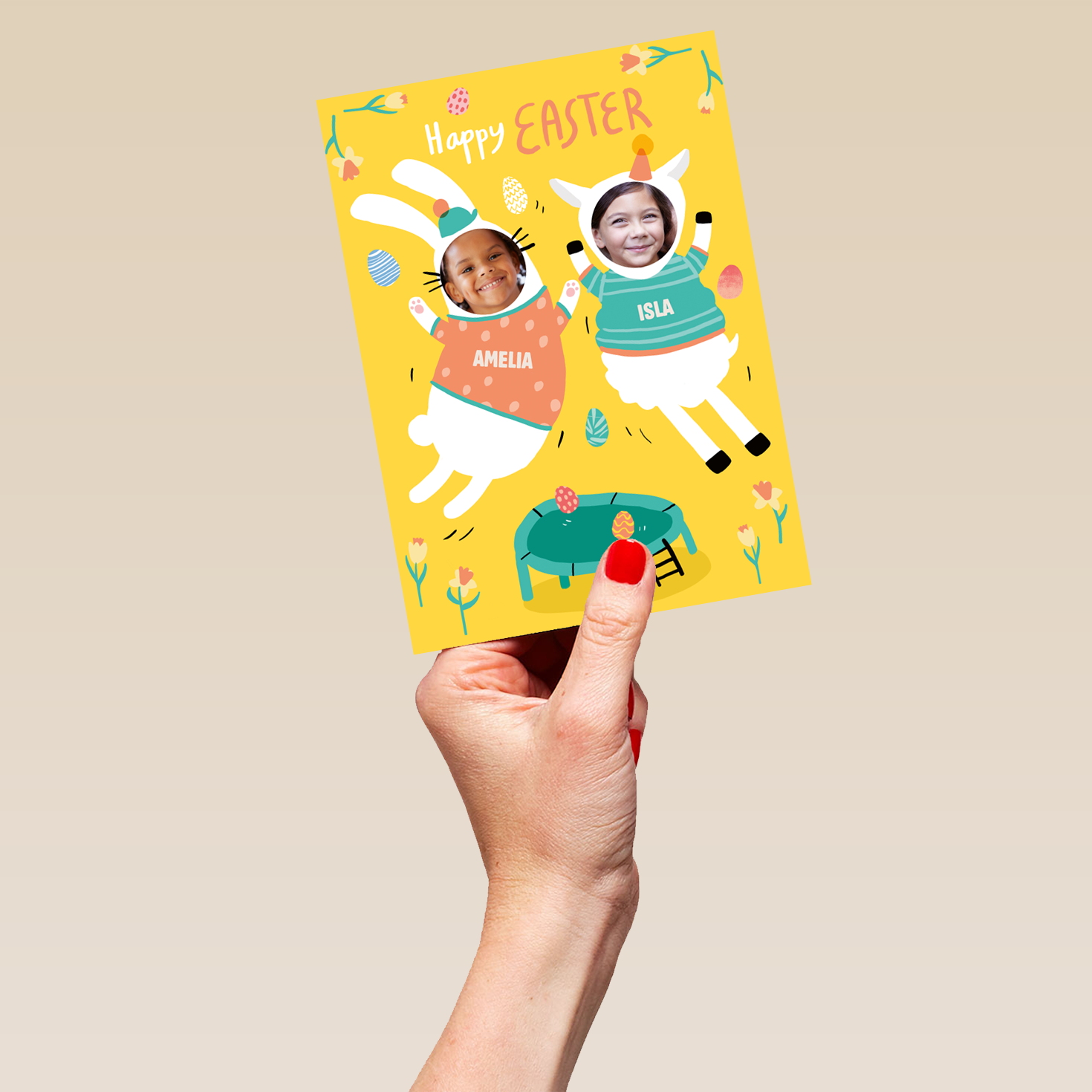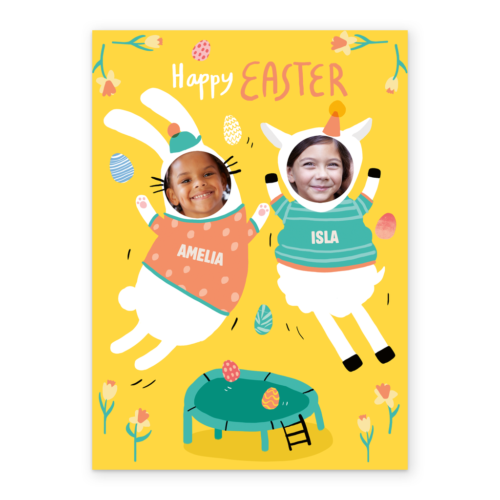Printed on premium-quality board, this card features spaces to upload photos; add the faces of your favourite people to turn them into a contemporary illustrated bunny and lamb, with spaces to personalise names on each colourful jumper, as the celebrate Easter on a trampoline with bright patterned eggs and daffodils on a bold yellow background, with the message 'Happy Easter', and comes complete with a co-ordinating white envelope.
