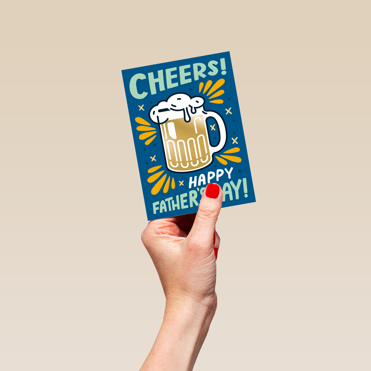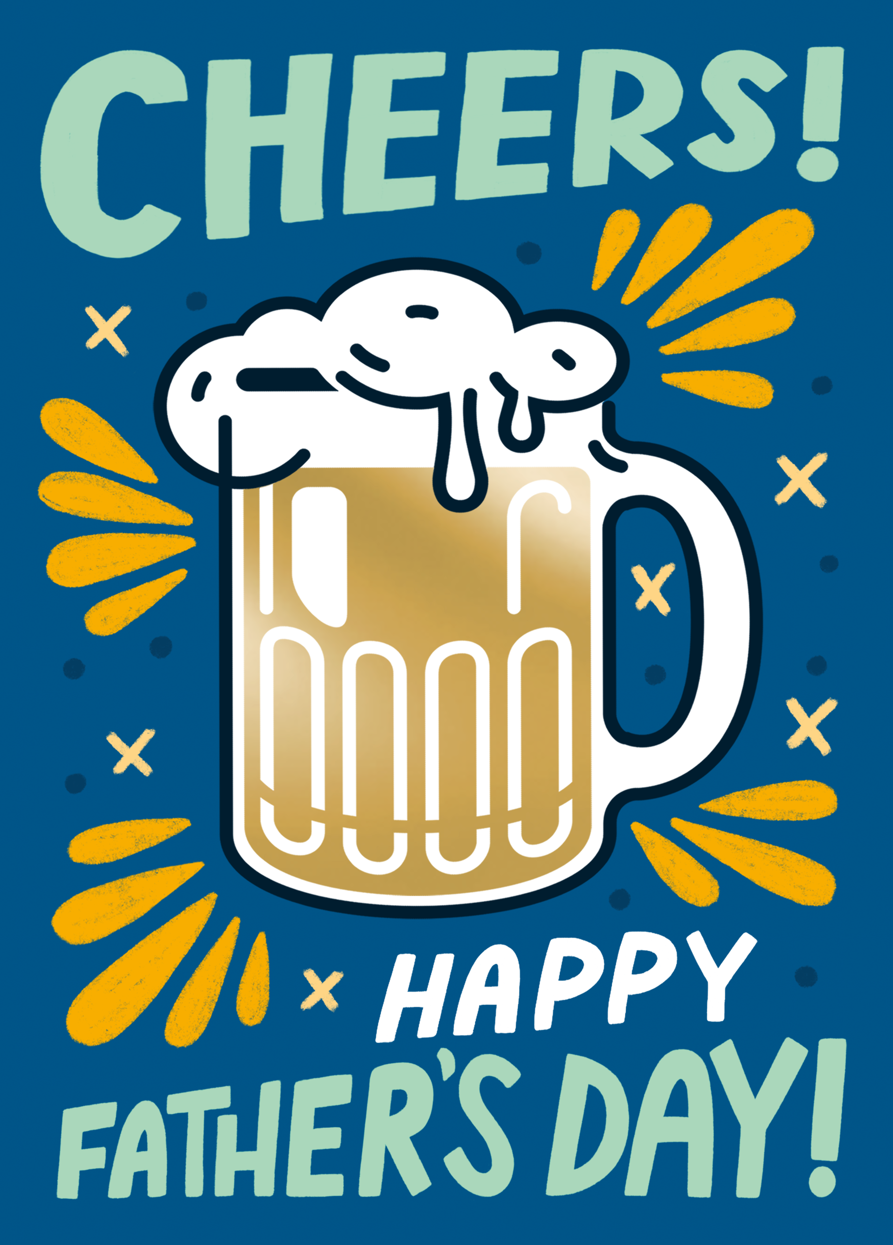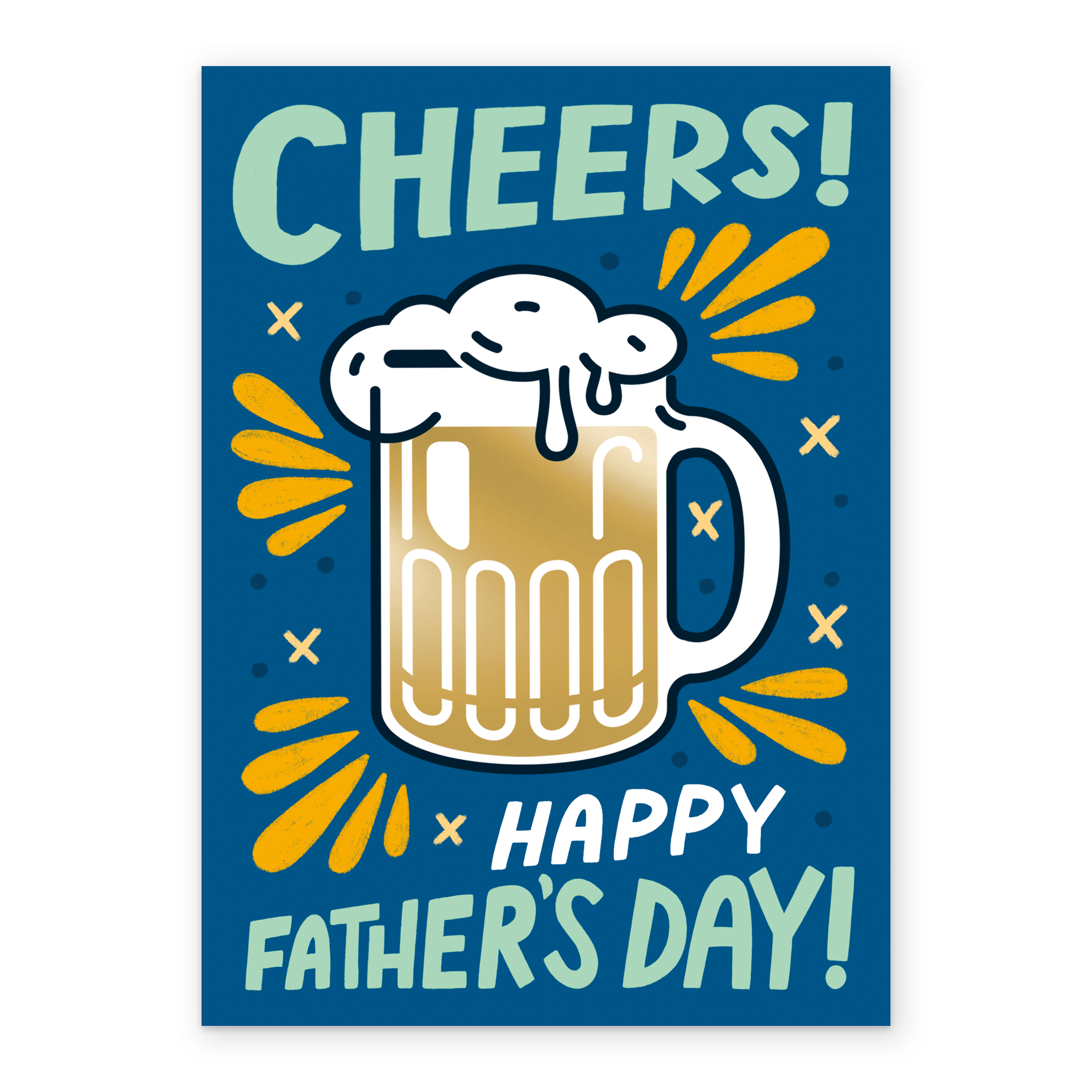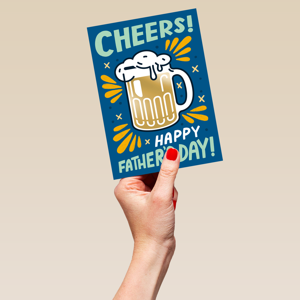 Printed on premium-quality board, this card features a retro style beer glass and word art design, with the message 'Cheers! Happy Father's Day!', and comes complete with a co-ordinating white envelope.
