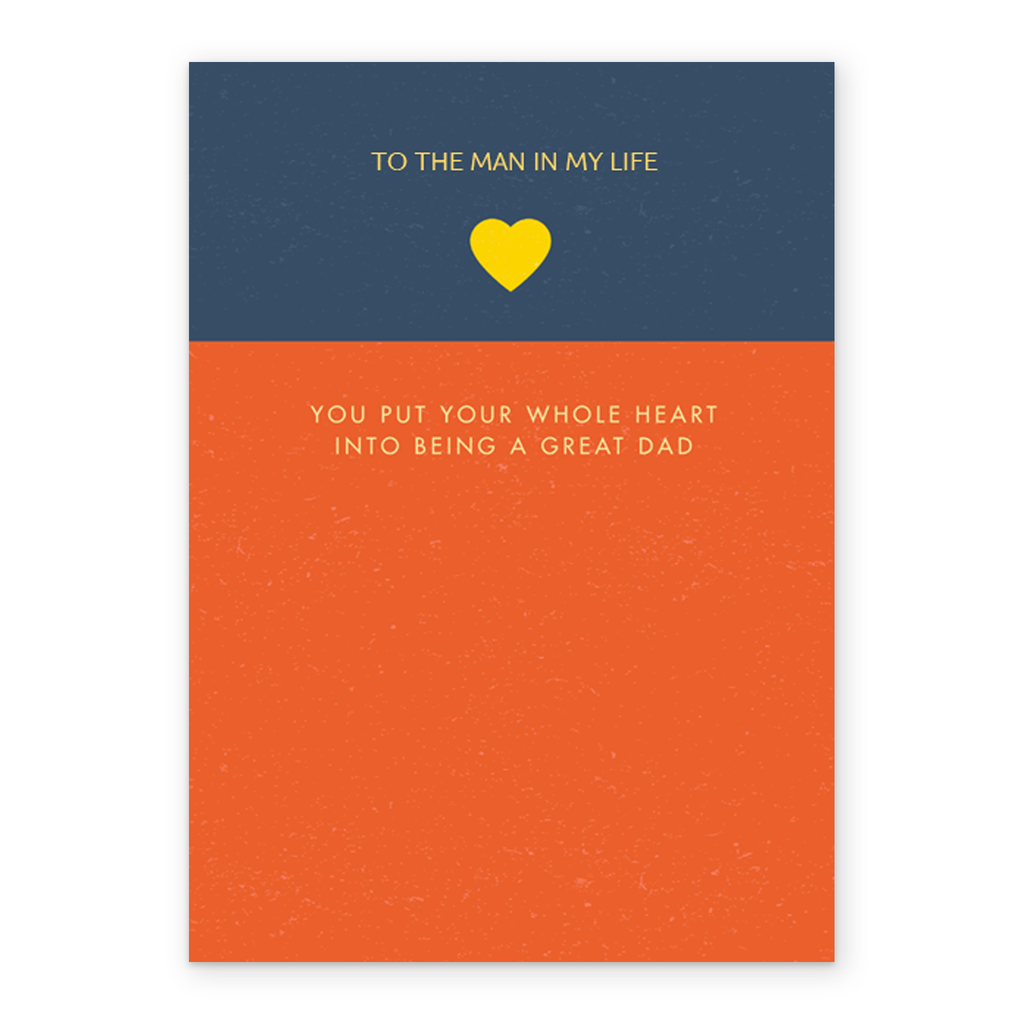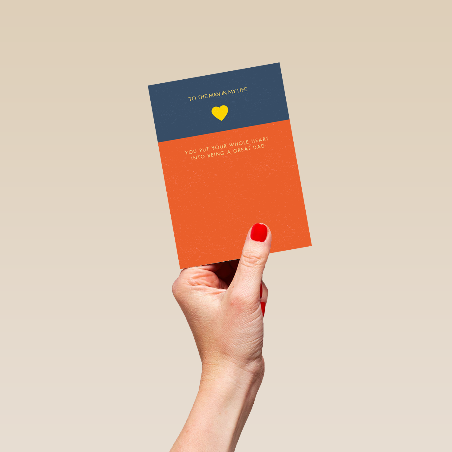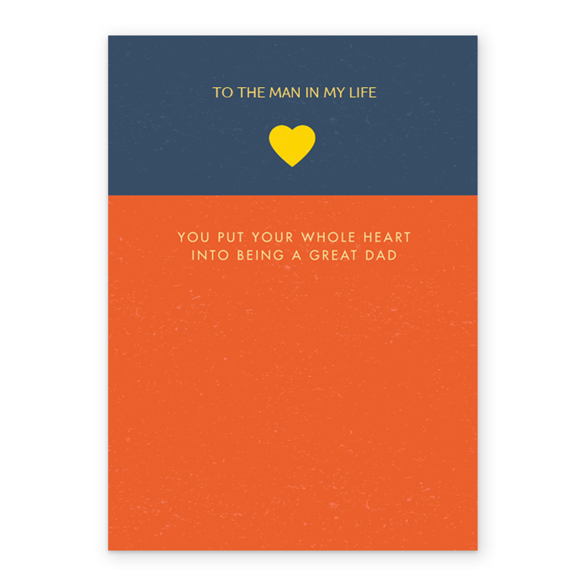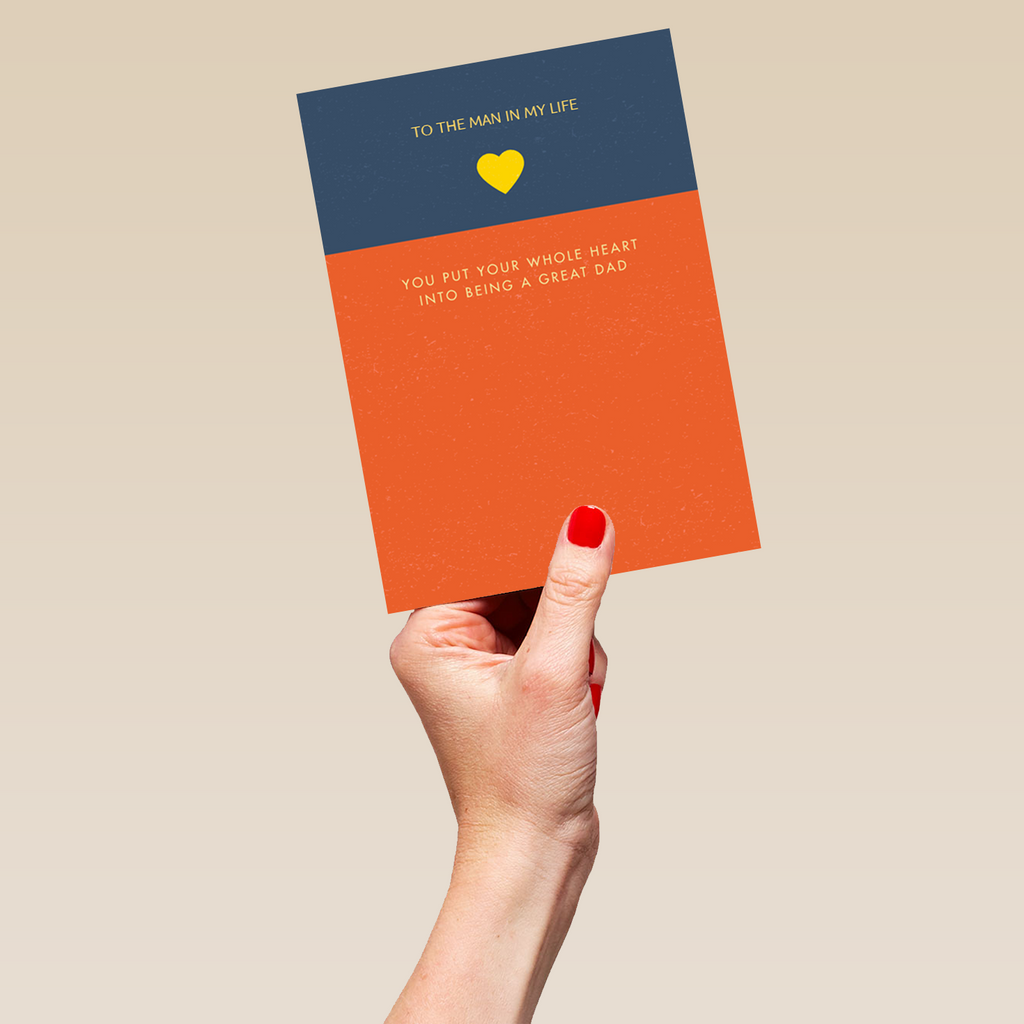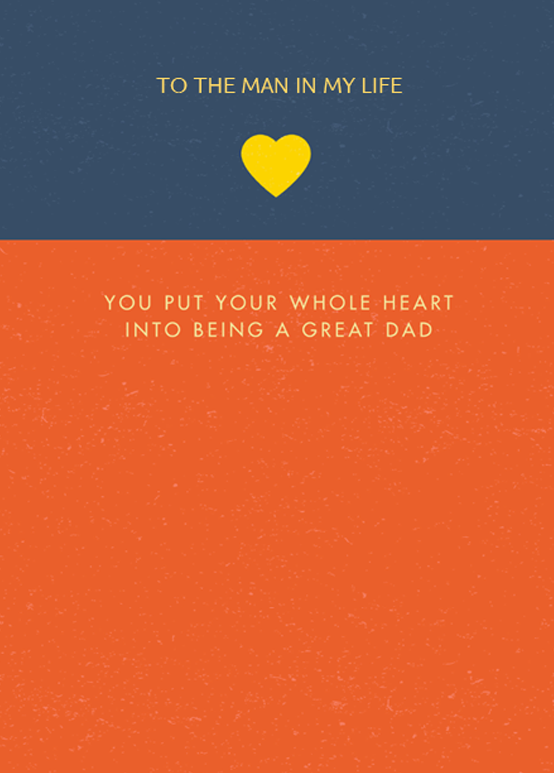 Show them you care with a personalised editable man in my life Father's Day heart card from Hallmark. Our Father's Day cards are printed on premium quality, FSC®-certified card & delivered nationwide. This card is available as standard 12cm by 16.7cm and large 15.5cm by 21.6cm.