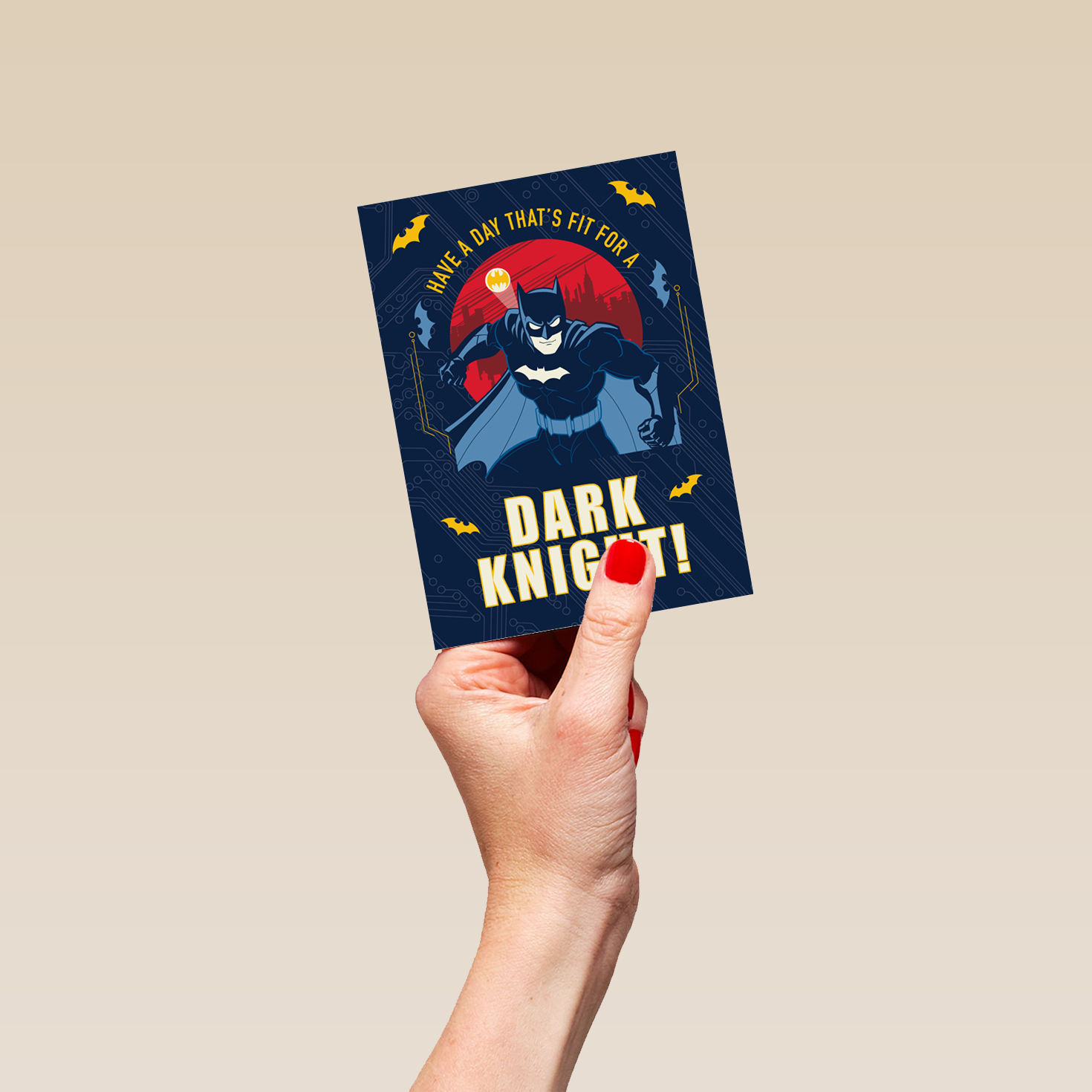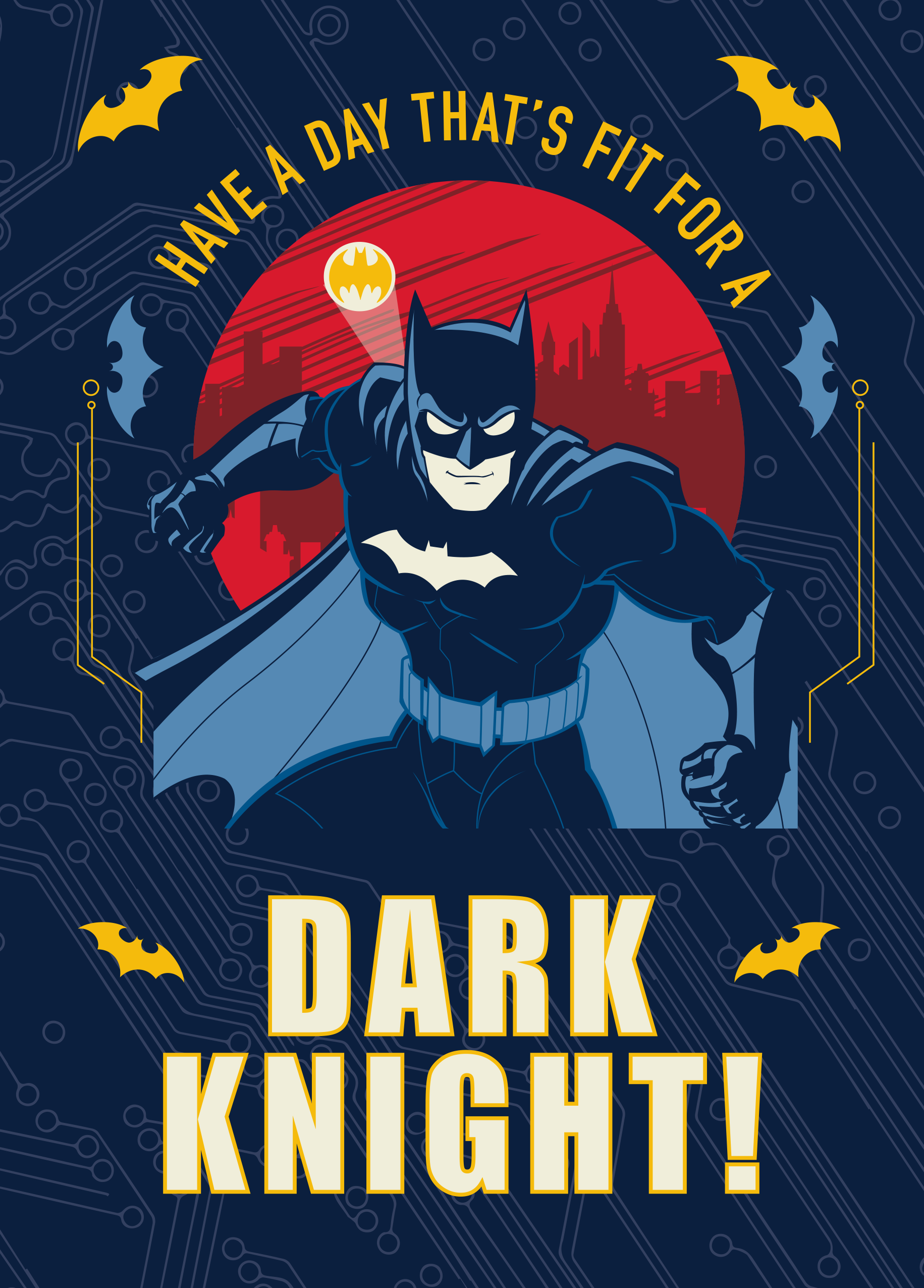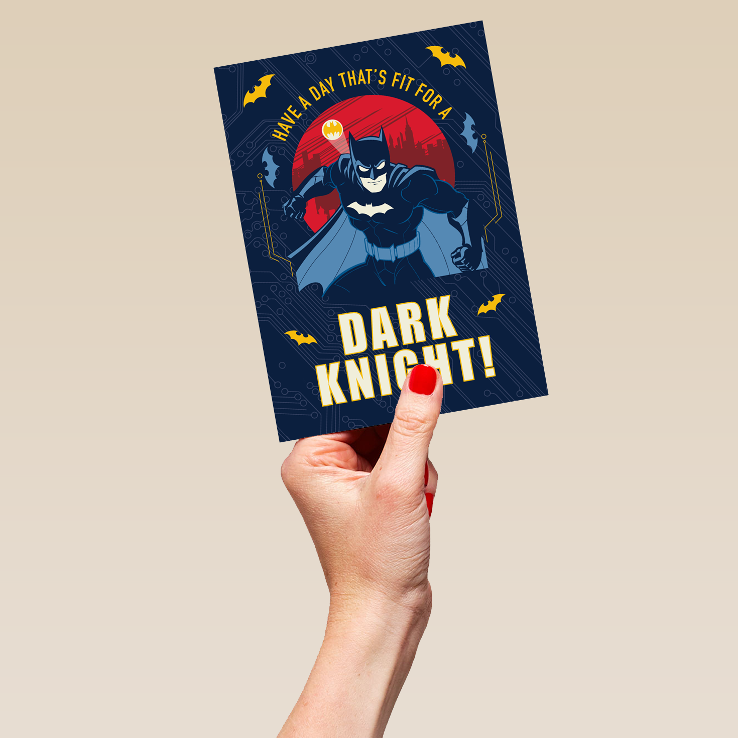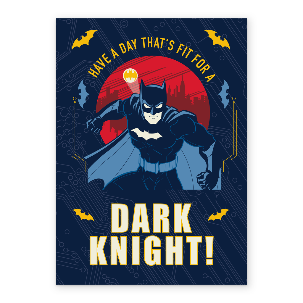 Printed on premium-quality board, this card features the dark knight himself, Batman, posing heroically infront of the Gotham skyline illuminated by the Bat-signal, on a contemporary blue background, with the message 'Have a day that’s fit for a dark knight!', and comes complete with a co-ordinating white envelope.