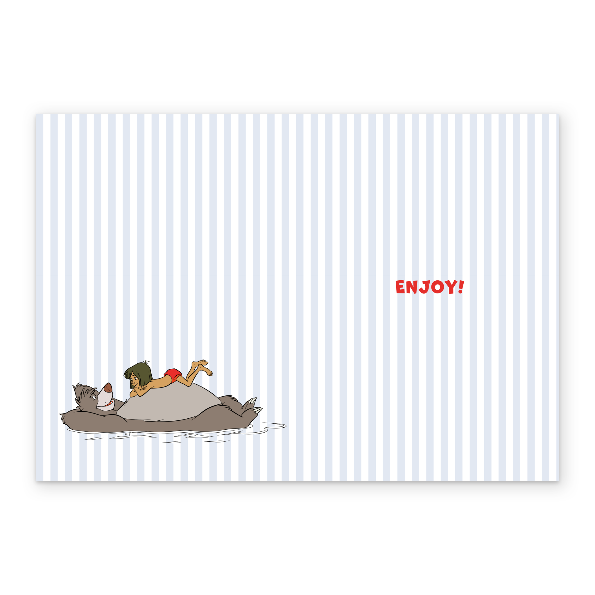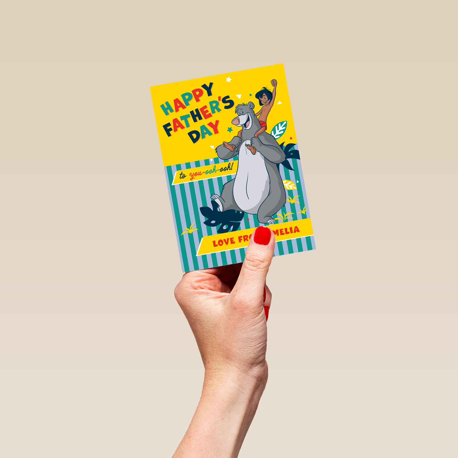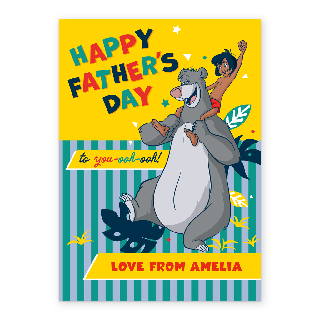 Printed on premium-quality board, this card features Mowgli from Disney's The Jungle Book joyfully riding on Baloo the bear's shoulders, with colourful letters on a yellow and striped blue background, with the message 'Happy Father's Day to yoo-ooh-ooh!', space to personalise a name, and comes complete with a co-ordinating white envelope.